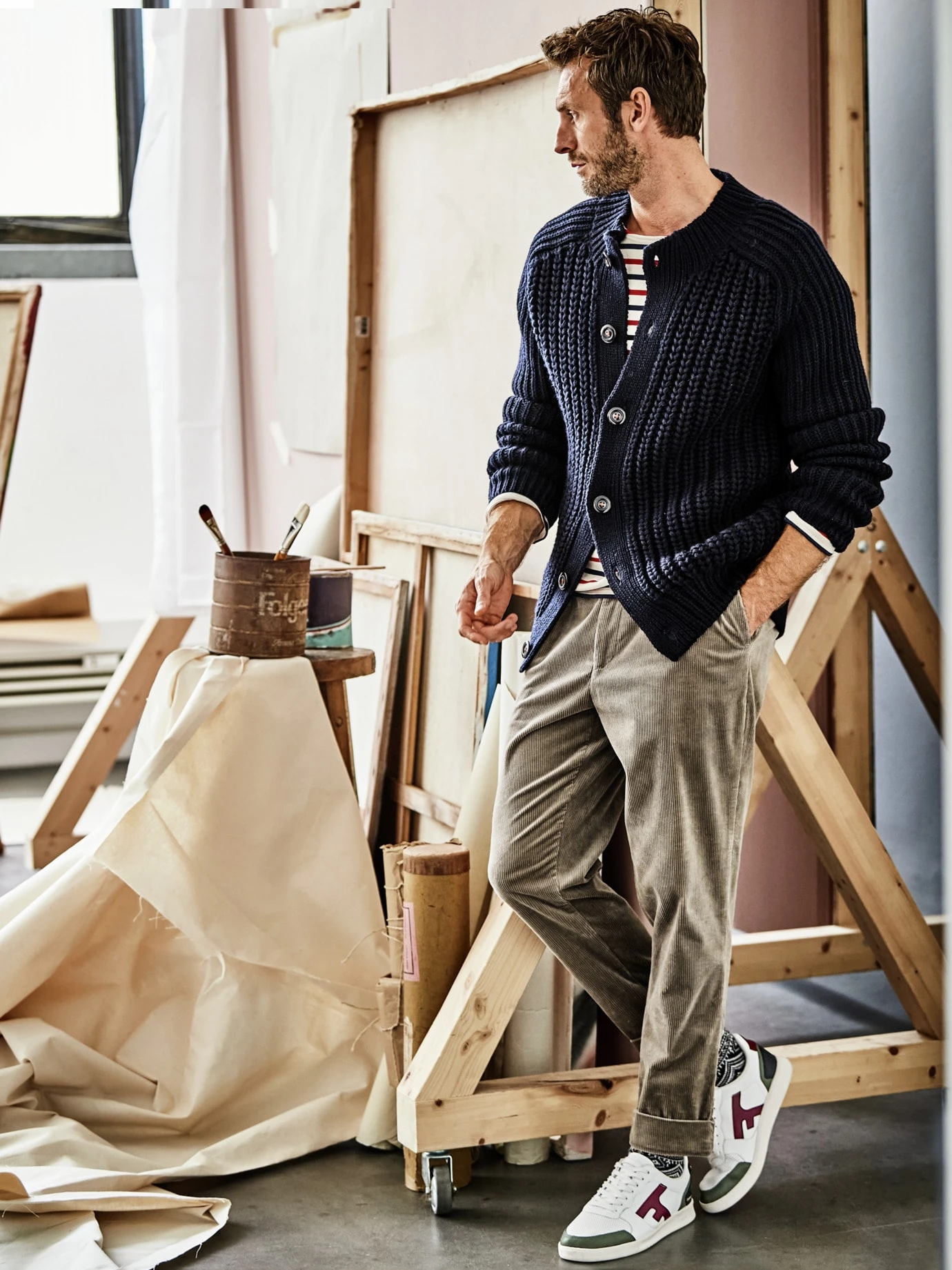 Zu lässig zum Ausziehen. Cord ist immer fein, weich, gemütlich, Babycord sowieso. Hinzu kommen der obenrum üppige Tapered Fit, der viel Raum für Bewegung und allerlei Sitzpositionen lässt, ein flexibler Gummibund und die Bundfalte. Ein kleiner Anteil Elasthan sorgt außerdem dafür, dass auch der Stoff in sich flexibel bleibt. Die Beine laufen schlank zu, sind bereits fertig gekrempelt und modisch angesagt etwas kürzer. Für einen freien Blick auf fette Lederboots oder elegante Oxfords.