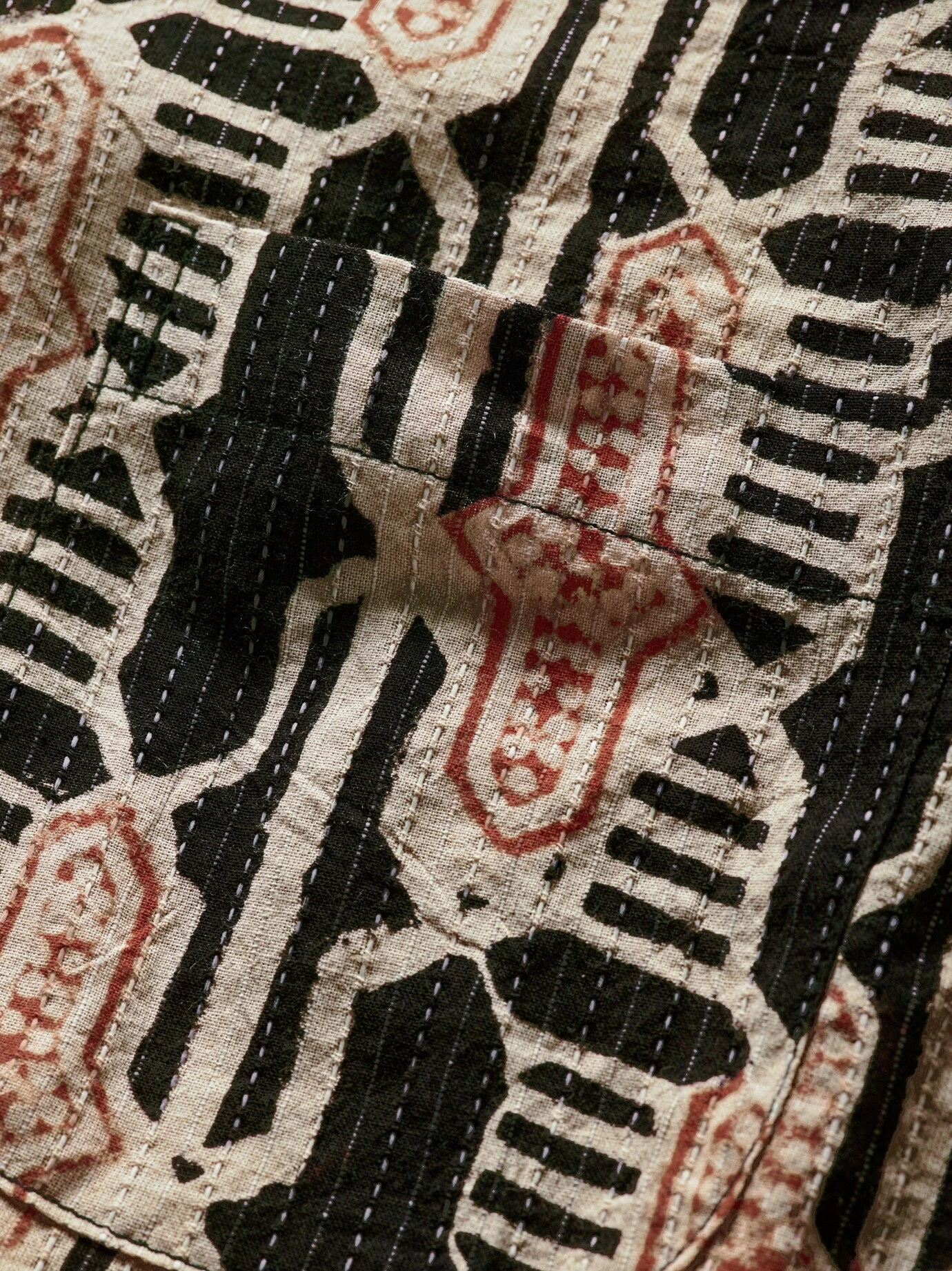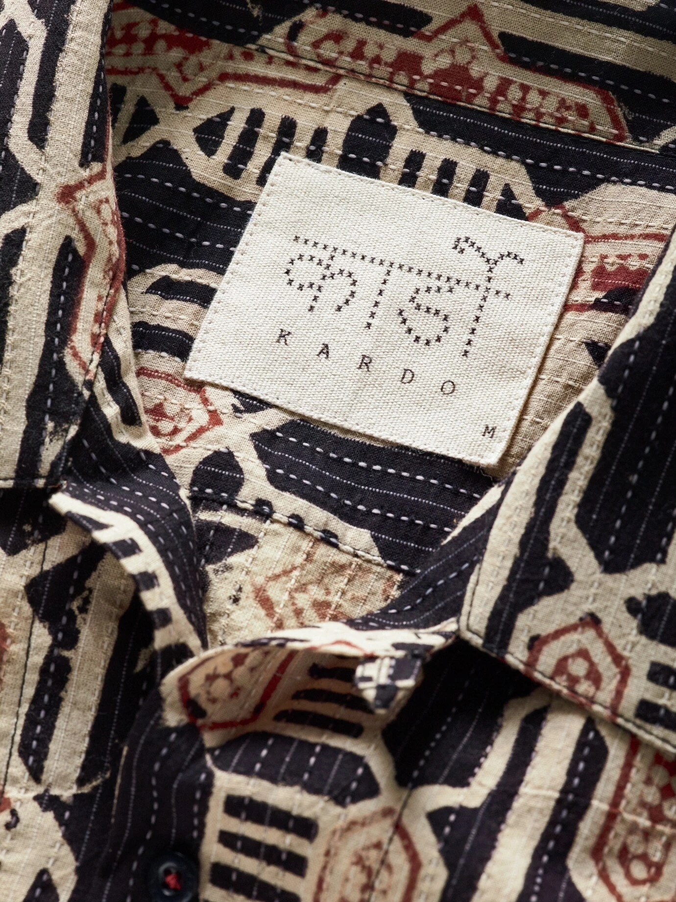 Nach allen Regeln der Kunst. Ajrakh ist eine traditionelle indische Handblock-Drucktechnik. Dabei werden zuvor in Teakholz geschnitzte Muster in Farbe getaucht und auf Baumwolle oder Seide gepresst. Kardo transferiert das alte Kunsthandwerk in die Neuzeit und druckt mit viel Können und Präzision diesen feinen Rapport auf ein sommerliches Hemd. Ein liebevoll gemachtes Sammlerstück mit eigener Geschichte, die man sehen und spüren kann.