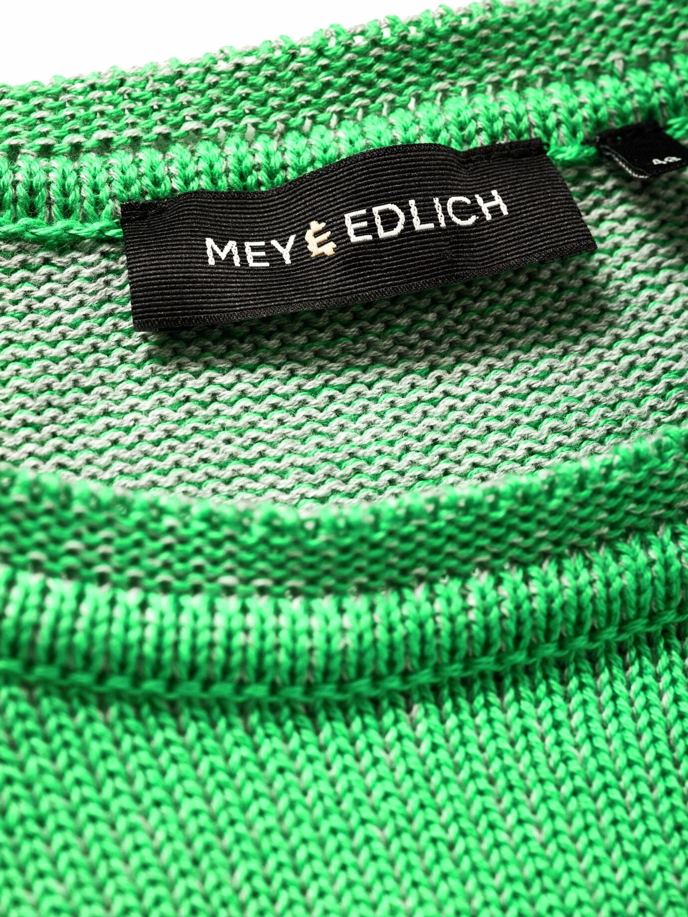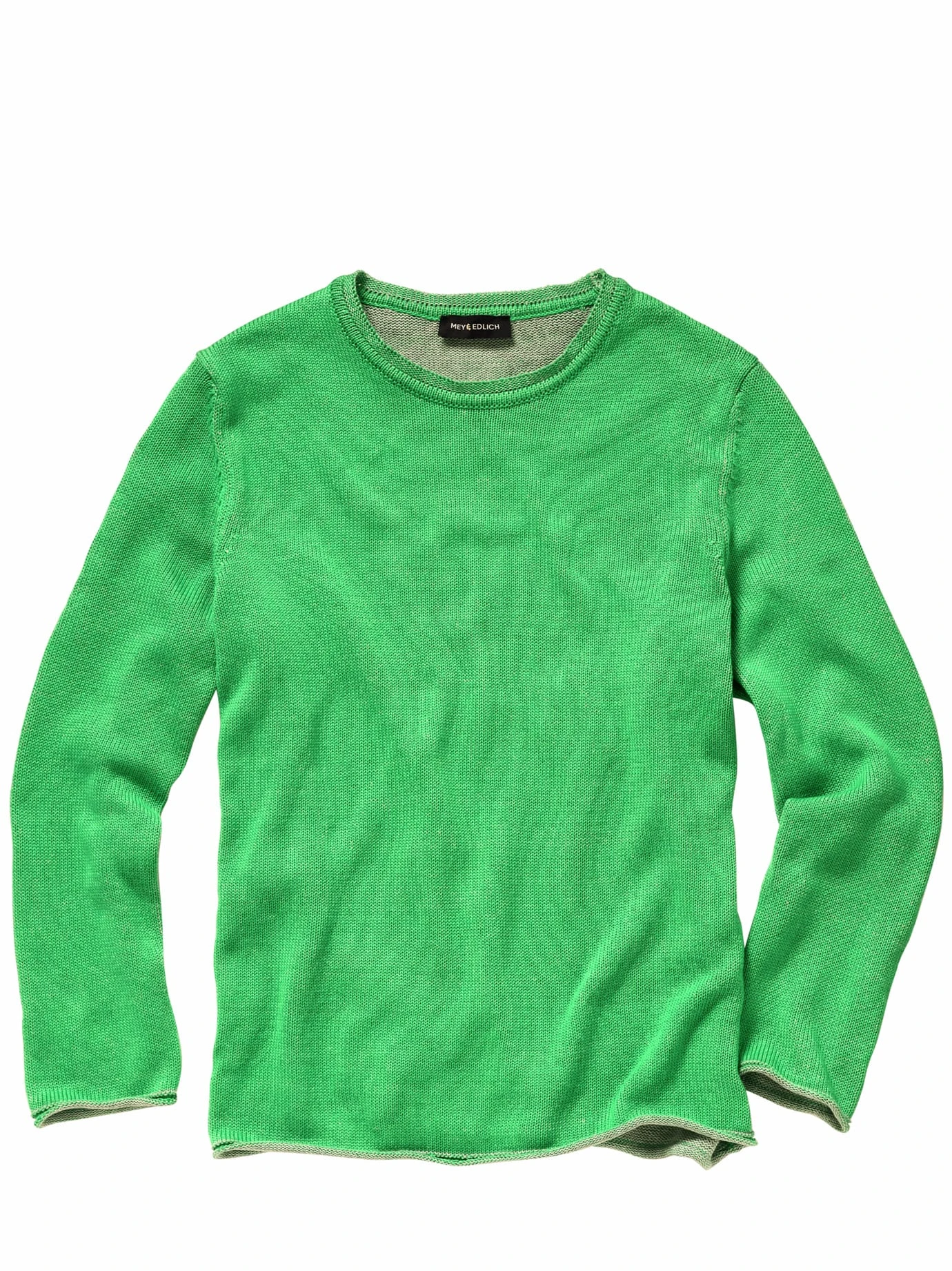 Stellt keine Fragen. Einer, der (zu fast allem) passt und dabei unkompliziert ist. Seine Farbe changiert (je nach Winkel), seine feinen Details lassen ihn abheben – Stichwort: sanft einrollende Abschlüsse, perfekt verstrickte Schultern. Gestrickt in sogenannter Vanisé-Technik, dabei hängen die Baumwollmaschen luftig ineinander und ergeben die optische Dreidimensionalität. Leicht ausgeschnittener Rundhals, ein T-Shirt drunter ist Geschmackssache, er trägt sich eh auf nackter Haut weich.