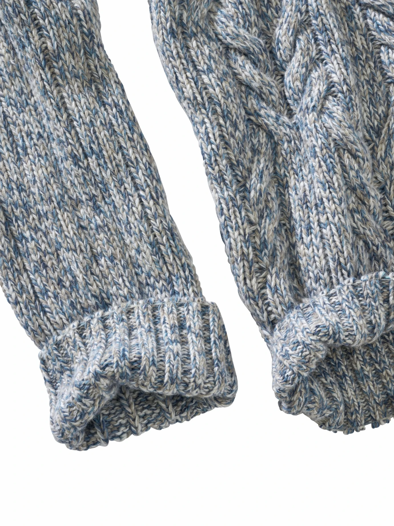 Zwischen Himmel und Eiskristall. Das Blau changiert je nach Blickwinkel. Für den konstant weichen Griff sorgen die fünf Prozent Kaschmir im Effektgarn. Die Wärme geht aufs Konto des Wollanteils, die Hightech-Fasern machen den Farbwechsel erst möglich und den Pullover tough genug für die Waschmaschine. Das kernige Zopfmuster stärkt seinen Charakter.