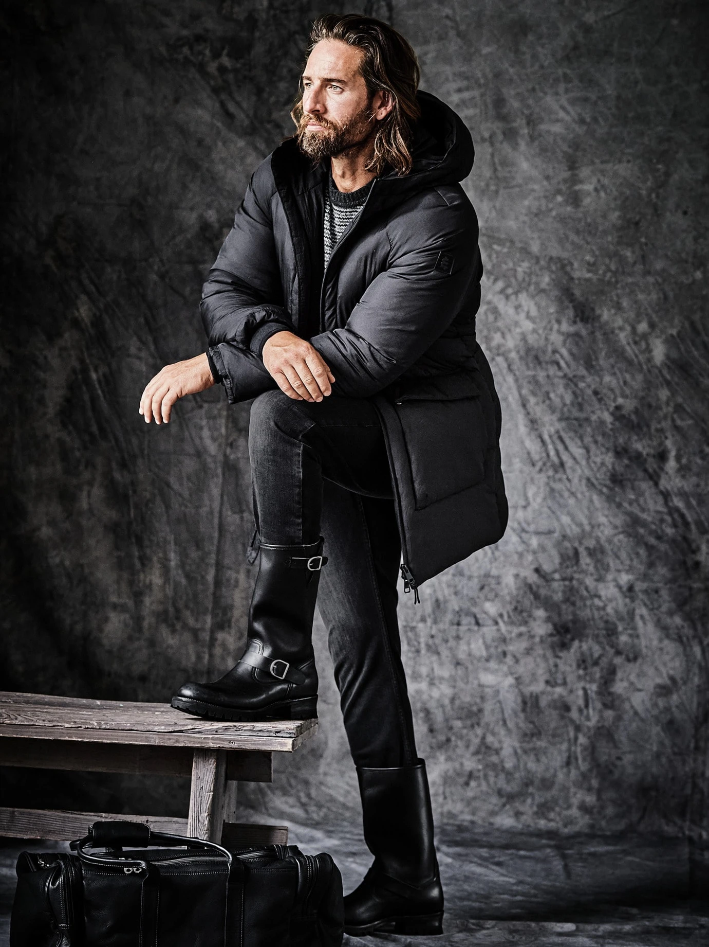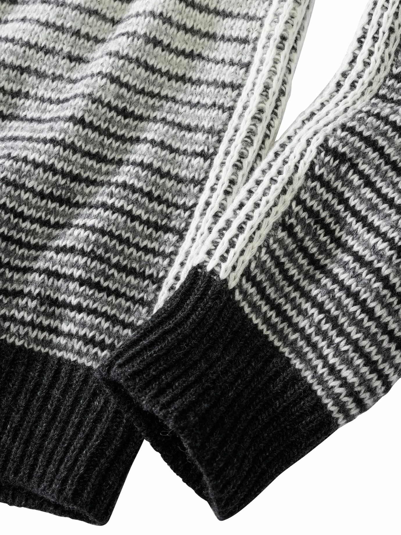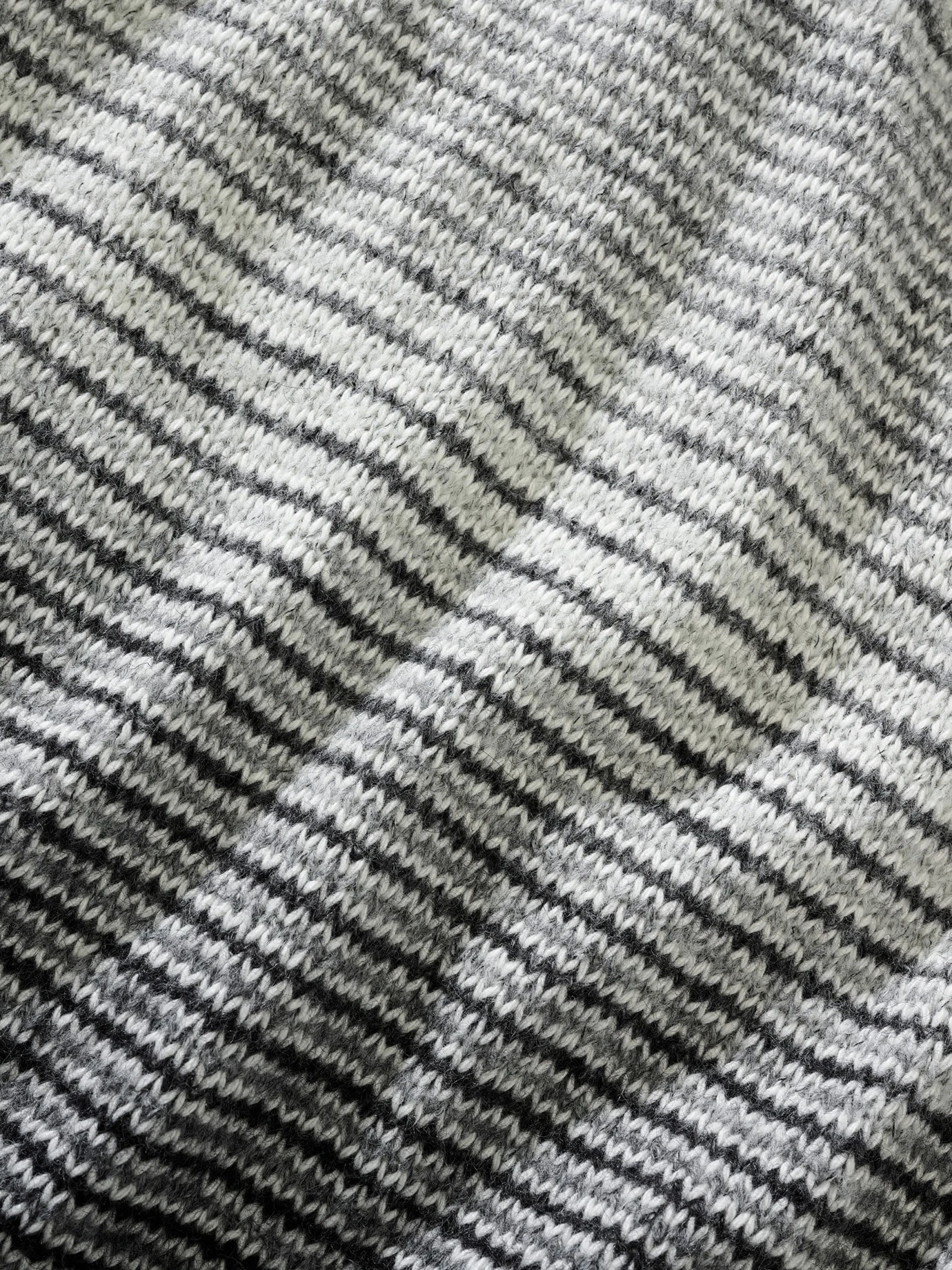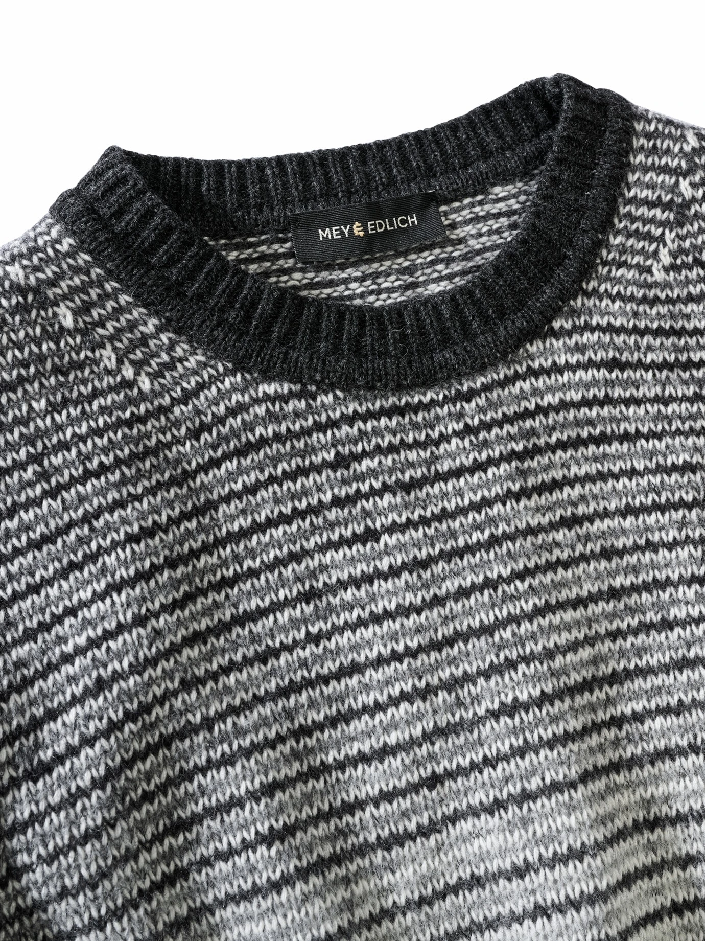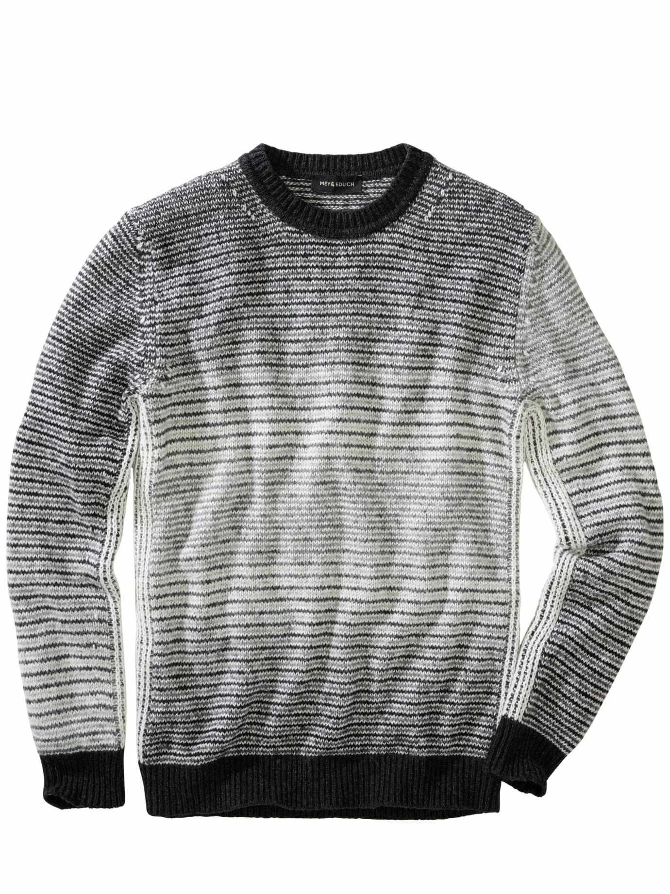 Die Streifen werden bewusst ausgeblendet. In dem nicht greifbaren Raum zwischen Schwarz und Weiß wird es spannend. Eine Schneewehe? Ein Blitzlicht? Liegt im Auge des Betrachters. Der Farbwechsel ist in dem italienischen Garn angelegt, die weißen Stellen wirken wie von Hand mit Bleiche bearbeitet und verschieben sich – je nach Größe und Statur des Pulli-Trägers und verlaufen jedes Mal ein wenig anders. Der hohe Wollanteil und der Schuss Kaschmir stehen für ein gutes Tragegefühl, die Hightechfasern für Leichtigkeit und Formbeständigkeit. Einfach intuitiv mit der Hose kombinieren, die Ihnen in den Sinn kommt, oder die sichere Jeans-Bank wählen.