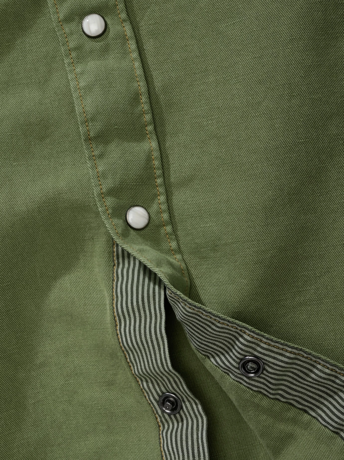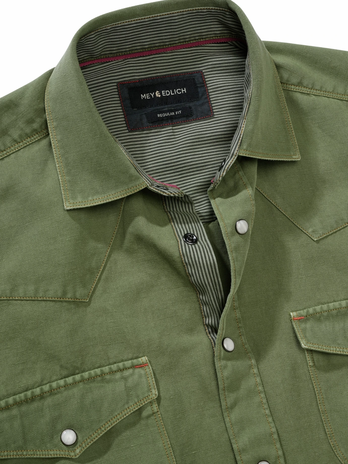 Looking for adventure. In whatever comes our way. Im wilden Westen gibt’s was Neues. Die Jeanshemd-Alternative kommt in Grün und mit einer luftigen Baumwoll-Leinen-Mischung um die Ecke. Ist genauso lässig wie Denim, ab 24 Grad einfach angenehmer auf der Haut. Mit Schulterpasse, hellen Druckknöpfen und Ziernähten zieht es den Cowboyhut vor dem blauen Klassiker. Für den schon-lange-bei-Sonne-im Sattel-Look wurde das Hemd ordentlich vorgewaschen. Geht ins Detail: der Streifenstoff an der unteren Knopfleiste, im Kragen und der Manschette. Maximal casual kombinieren, Jeans sind naheliegend.
