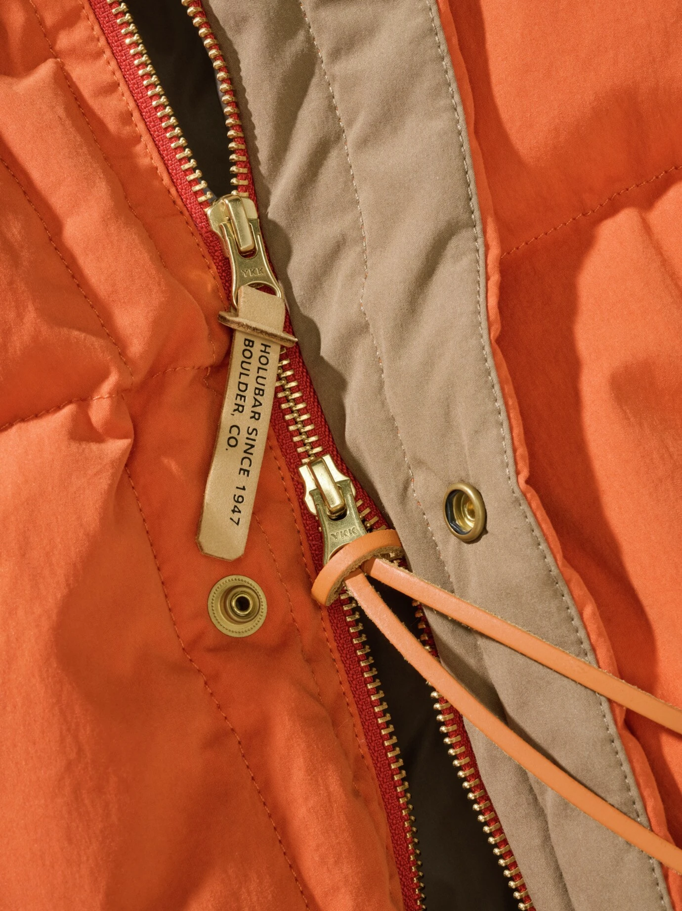 Passt in die Fußstapfen des Mountain Parkas. 1947 mieten Alice und LeRoy Holubar in Boulder, Colorado, eine Werkstatt und verkaufen Kleidung und Schlafsäcke an Bergsteiger. Heute ist Holubar der Inbegriff für funktionelle und modern designte Outdoormode. Alice und LeRoy gehören zu den ersten, die technische Fasern mit Daunen kombinieren und entwickeln den legendären Mountain Parka. Sein Nachfolger aus wasserdicht laminierter Baumwolle mit etwas High-Tech hält Ihnen Wind, Regen und Schnee vom Leib. Die Füllung aus echten Entendaunen wärmt bis -10° C und springt genauso zuverlässig in die Form zurück. Die verstellbare Kapuze schützt zusätzlich, den Innenkragen aus weichem Cord können Sie abnehmen. Sichtbar durch jede Schneewehe: das Signalorange. Mit Jeans, Cargo, 5-Pocket-Hose, Pullover, Sneakern oder schweren Stiefeln – je nach Abenteuer.