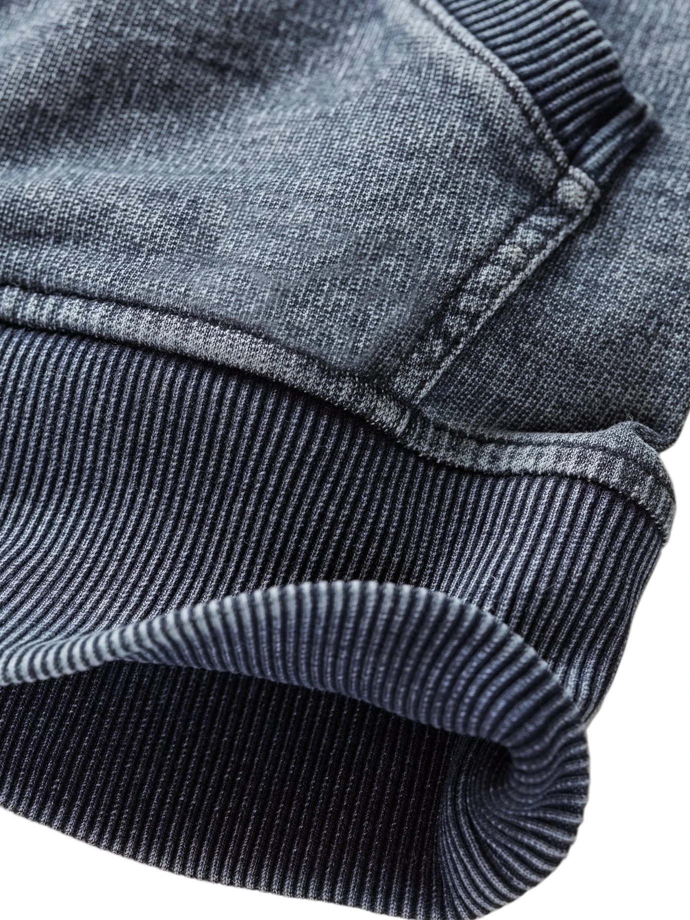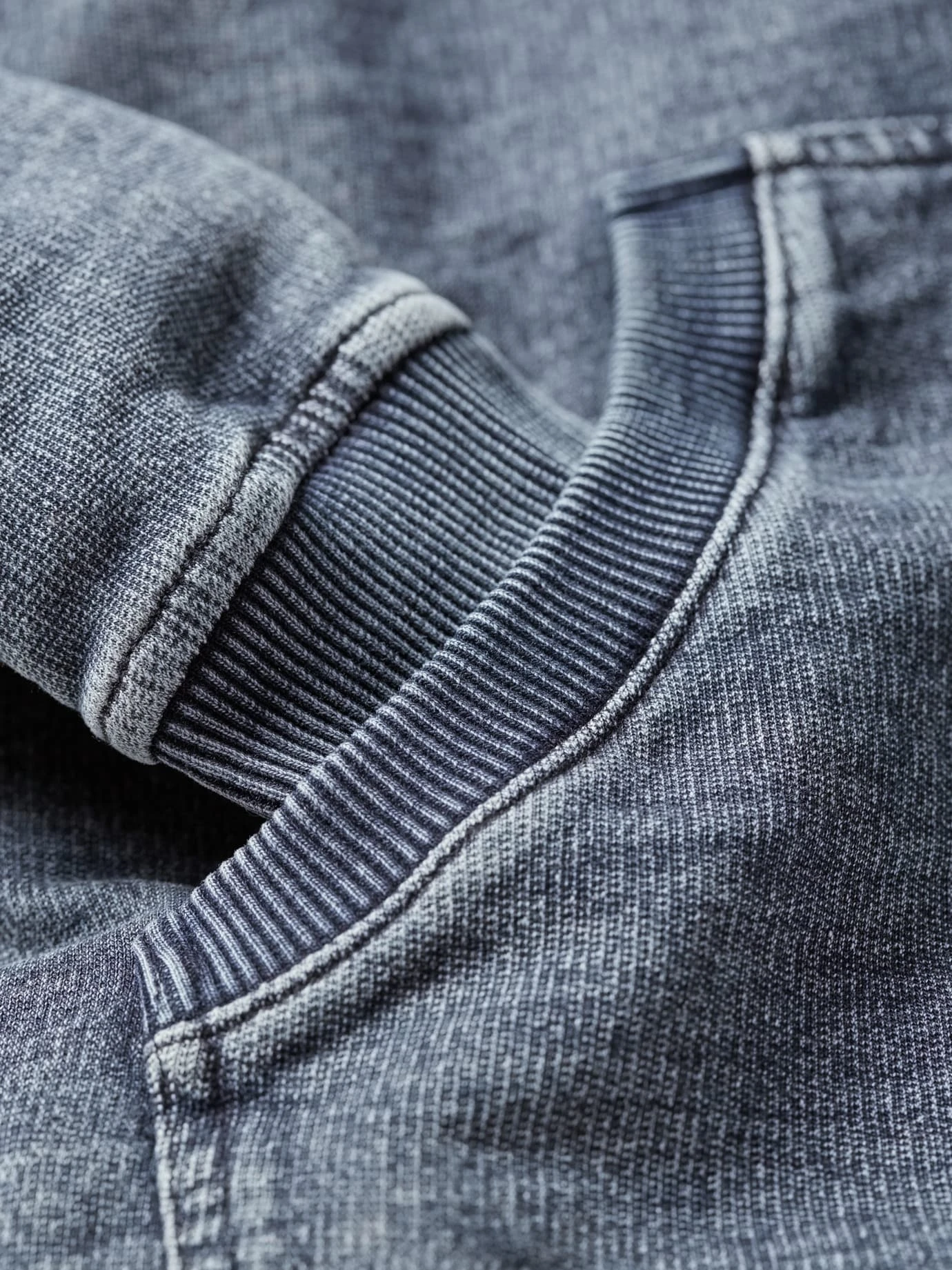Jeans werden so wenig älter wie dieser Hoodie. Beide werden interessanter. Er ist auf Used-Jeansoptik getrimmt, nach dem Nähen wird ihm eine Denim-Waschung verpasst. Jeder Hoodie ein Unikat, seine Farbe lebt weiter, so, wie es sich ergibt, und trägt immer stärker Ihre Handschrift. Zu Beginn weiße Sitze und Sofas meiden – wie bei einer guten Jeans. Der türkische Stricker verwendet übrigens ein dreifädiges Garn, was dem Hoodie Volumen verleiht, der Loopback-Strick verpasst winddichtes Sweatshirt-Feeling.