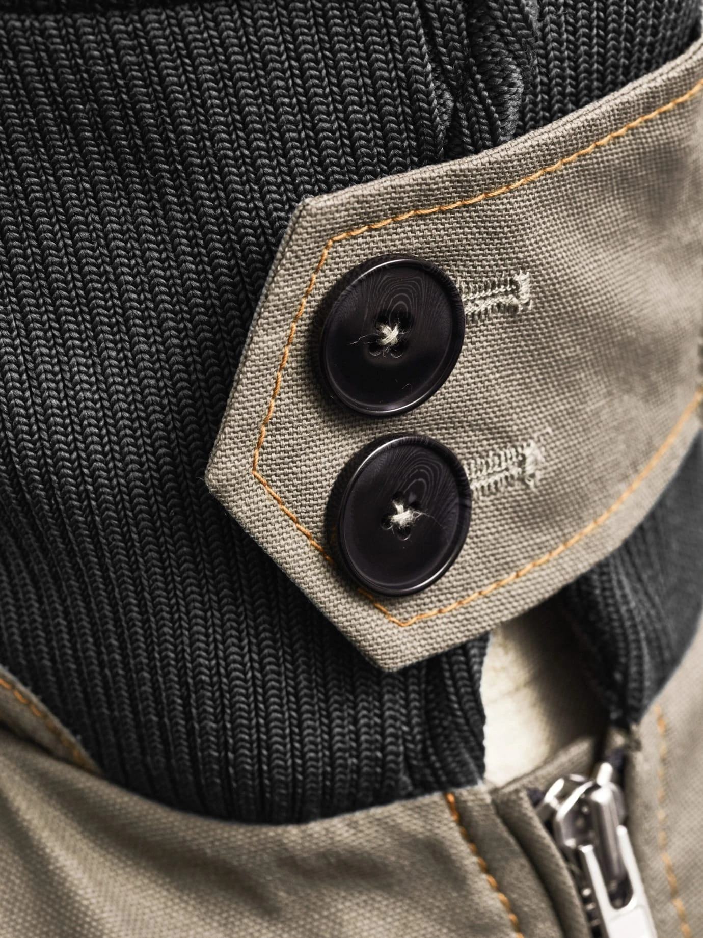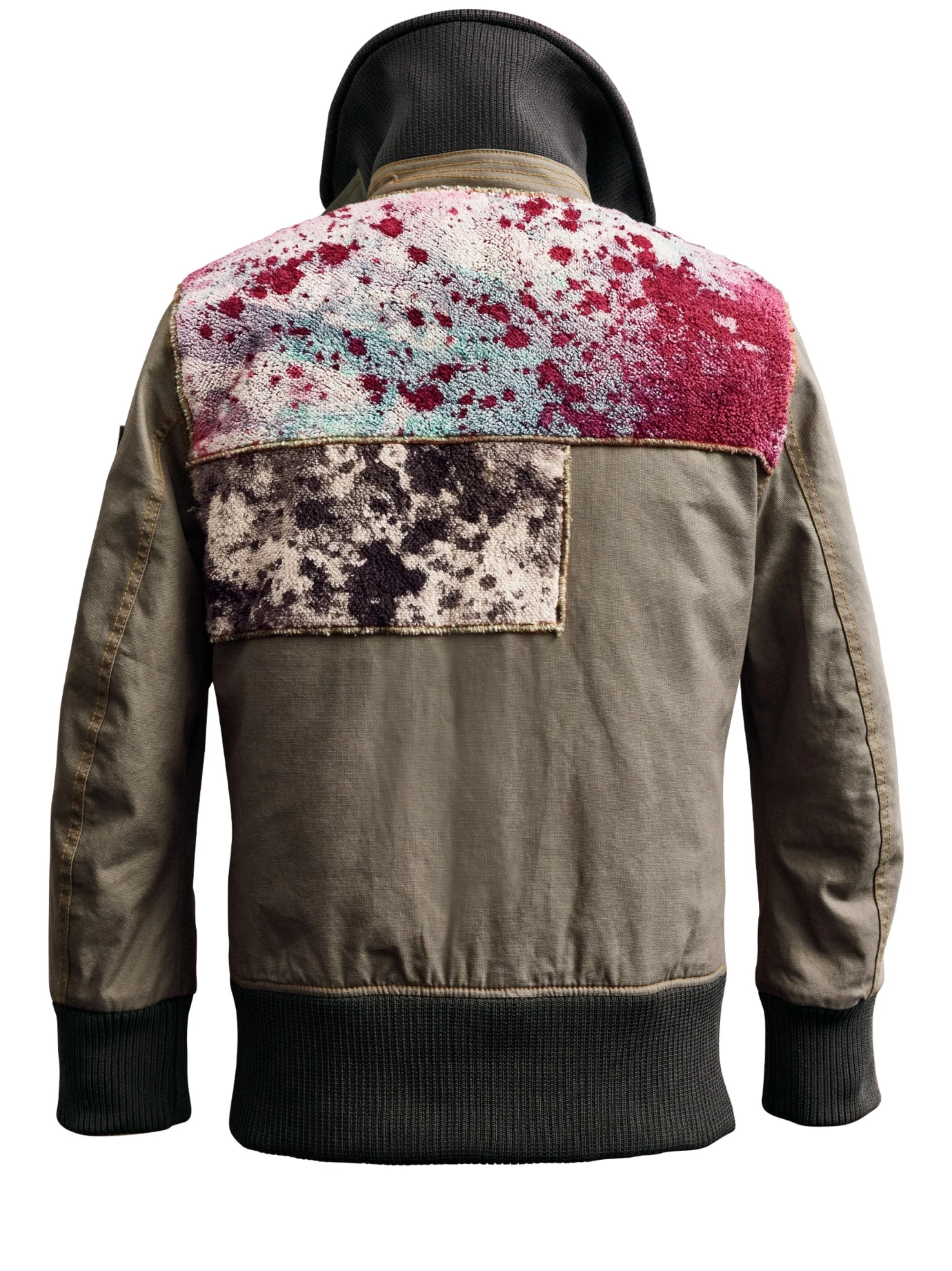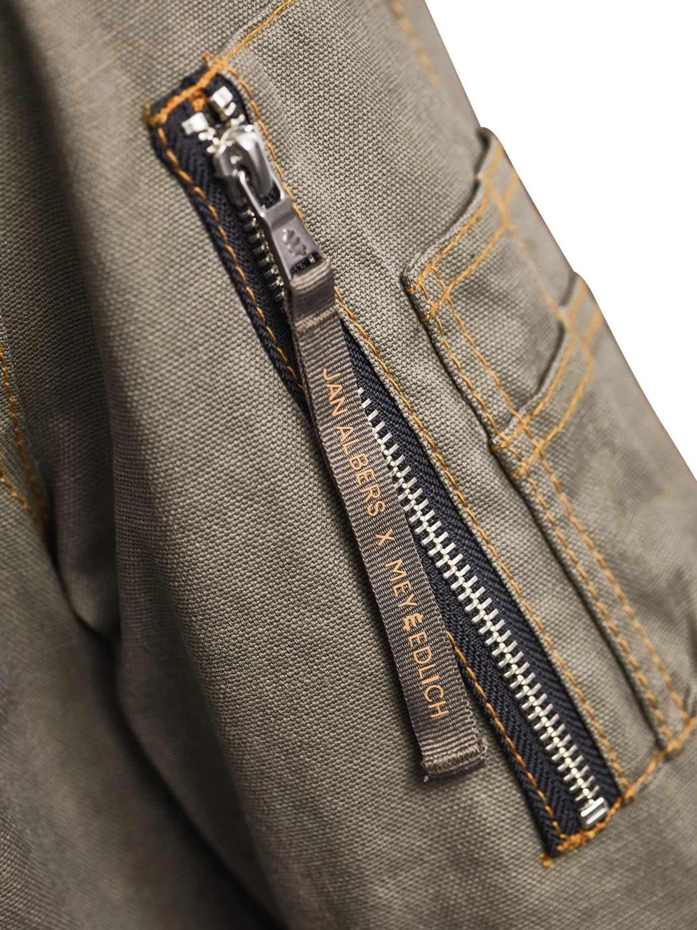 Diese Fliegerjacke schreibt Kunstgeschichte. Sie ist ein Original von und mit dem renommierten Düsseldorfer Künstler Jan Albers. Im Rücken ist ein originales Action Painting von ihm vernäht, gemalt auf Baumwollfrottee. Eine Jacke als Unikat, mit Sammlerwert, allein der Kunst wegen auf 70 Stück limitiert. Interessant unter Sammlern, Kennern, Kunstfreunden, Kuratoren, Auktionatoren. Der Style geht auf Guerilla-Fliegerjacken zurück, de facto kann ihnen dank der speziell beschichteten Baumwolle keine Widrigkeit etwas anhaben. Zusätzlich verbirgt sich unter Jans Kunst eine leichte Fütterung, die Sie in eisigen Straßen schützt. Abgerundet von überdimensionierten Rippbündchen, der Kragen trägt in sich einen Draht, zum Aufstellen oder Ablegen, noch derber wirkt die Fliegerjacke durch die Kontrastnähte, die Sie von teuren Jeans kennen.
