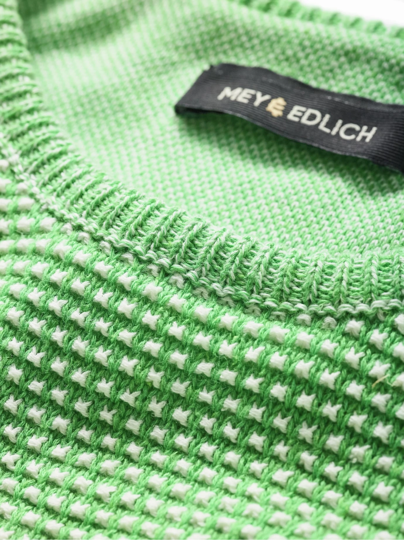Aus der Erfahrung gelernt. Gestrickt ist er so, wie Generationen es schätzen, im Perlmusterstrick – ziemlich akkurat, ziemlich gleichmäßig und optisch edler als herkömmlicher Rechts-Links-Strick. Dass er sich so angenehm trägt und quasi natürlich nachgibt, verdankt der Pullover seiner Technik. Liegt an den fühlbaren Perlen des Stricks – sie ergeben kleine Luftpolster, die ihn ideal bis in den Spätherbst machen, für den Wärmeausgleich sorgt das richtige Verhältnis zwischen Baumwolle und Leinen.