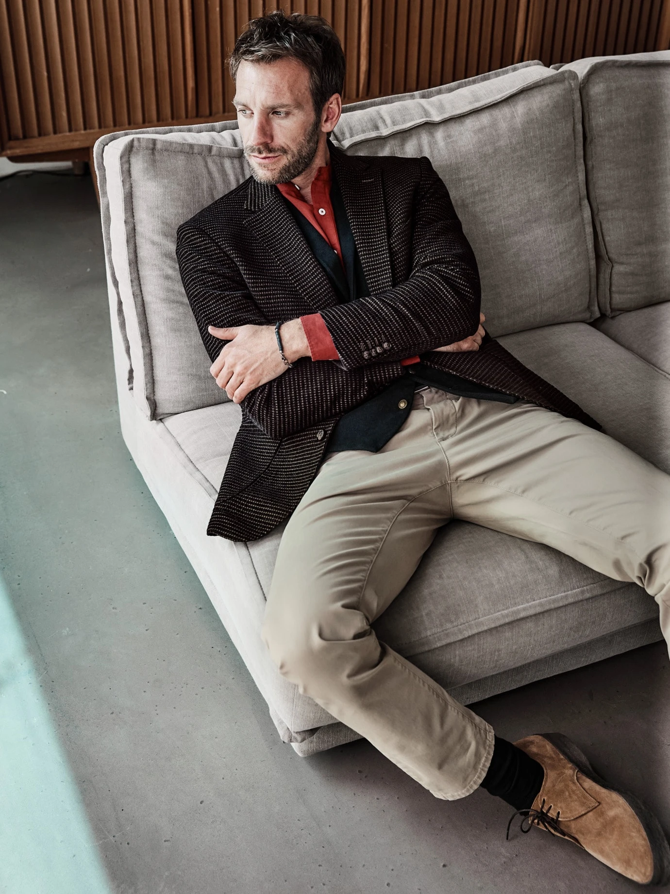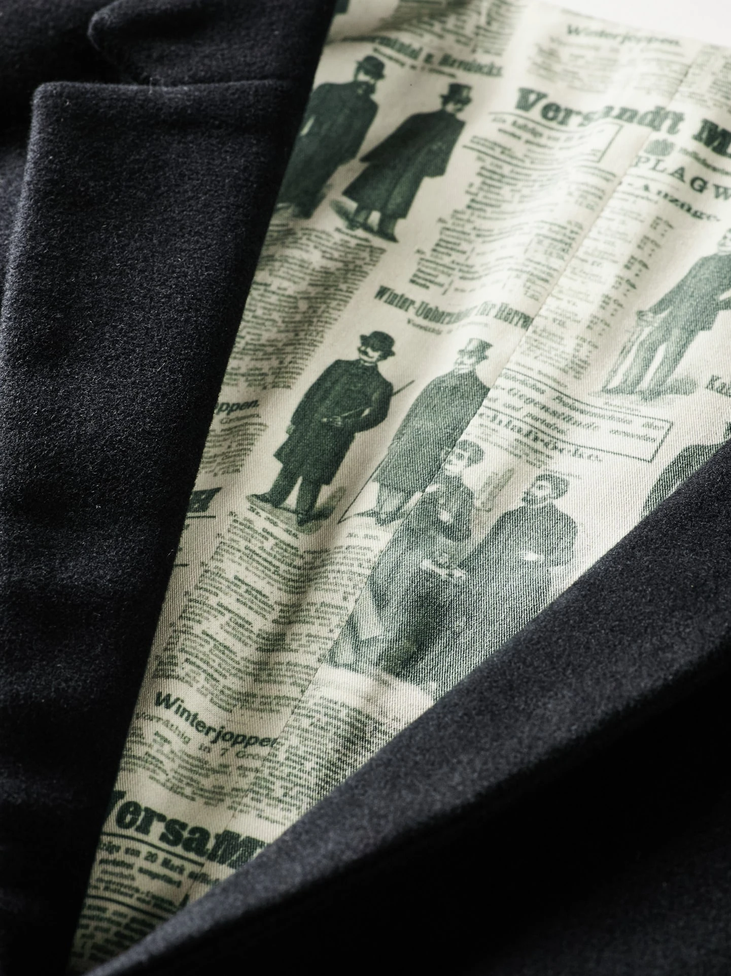 Verarbeitung: Der Verstellriegel bringt den Regular Fit individuell auf Figur. Der Schnitt ist bewusst etwas kürzer, um in Bewegung was vom Hemd sehen zu können – modisch wichtig. Kleiner Reverskragen, spitzer Saumabschluss (ganz im Stile des 19. Jahrhunderts), zwei Leistentaschen und eine Uhrentasche. Das Futter ist übrigens mit einer original Mey & Edlich-Werbeanzeige für Anzüge und Mäntel vergangener Zeiten bedruckt. Regular Fit.