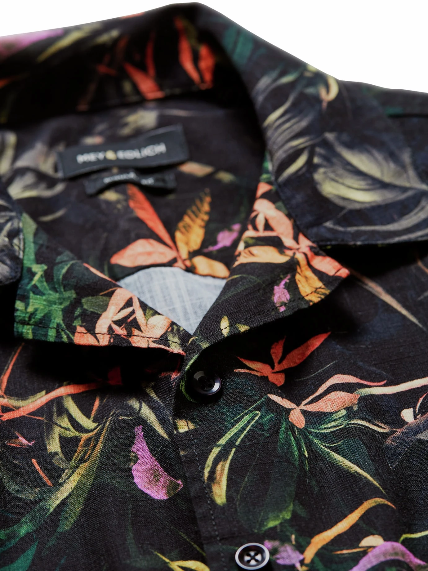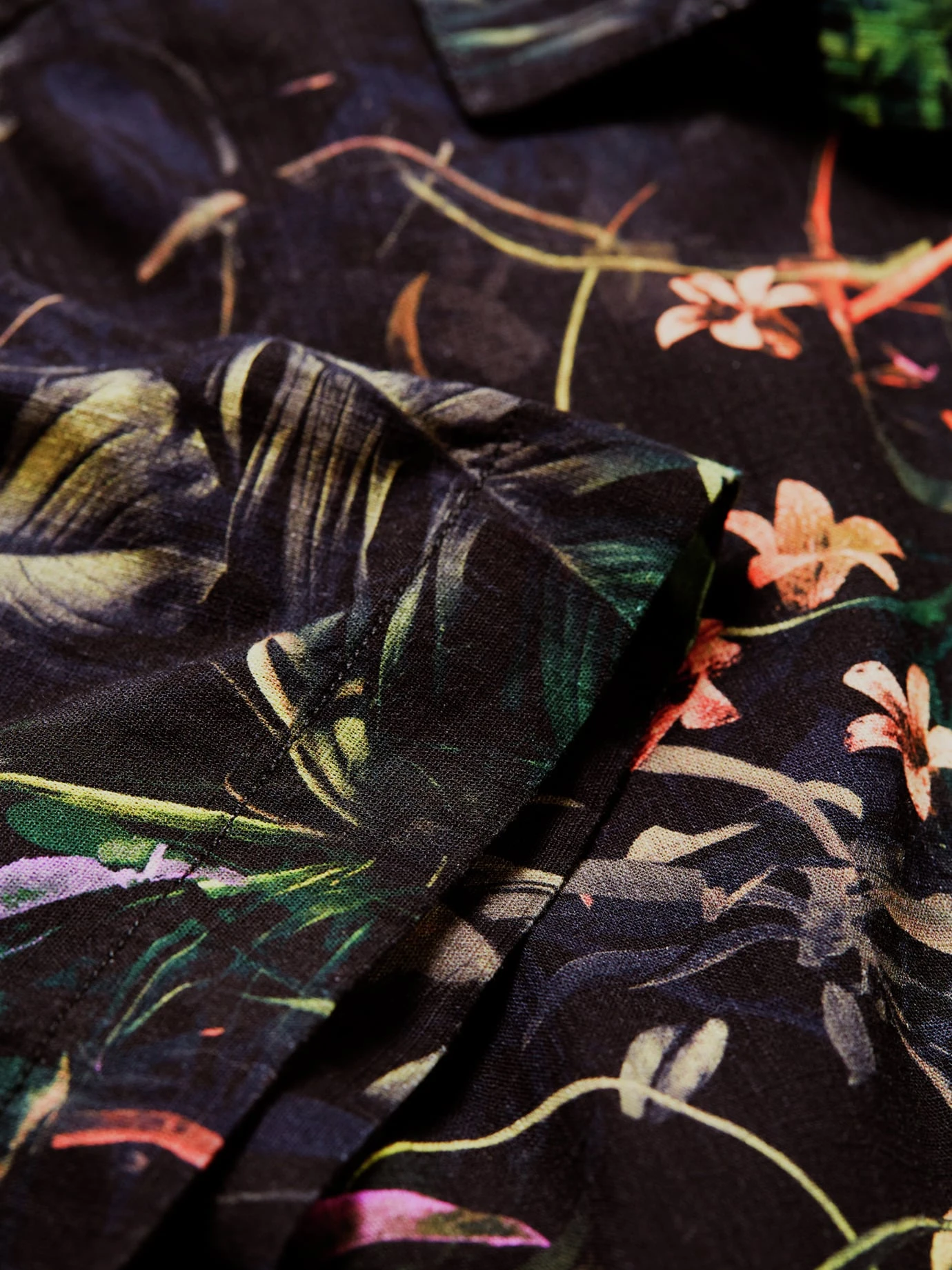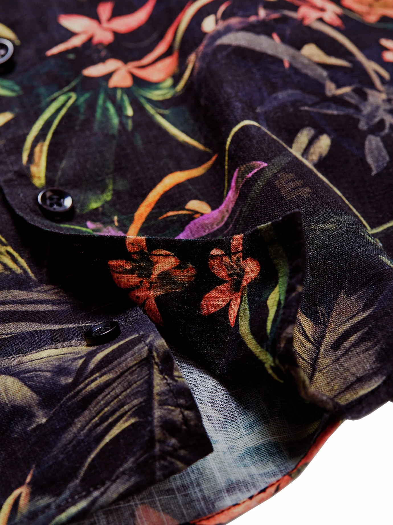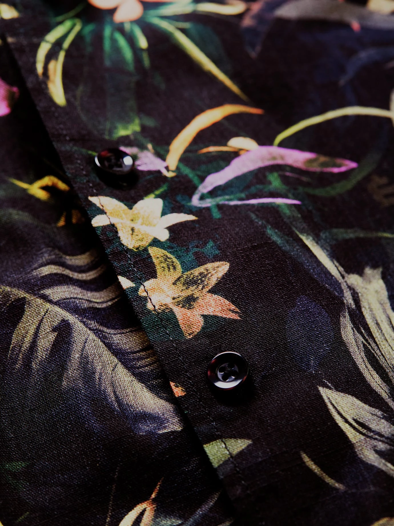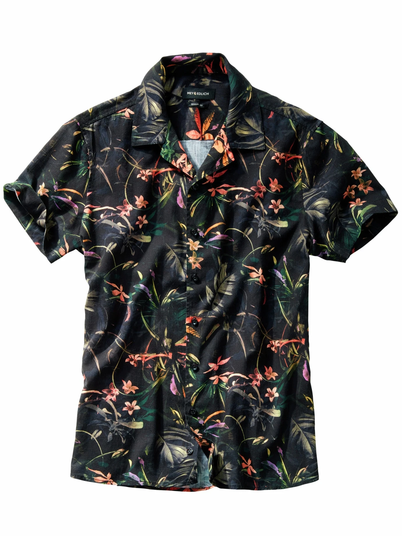 Weckruf fürs Auge. Die exotischen Blüten auf diesem Hemd strahlen wie in einer Vollmondnacht im Dschungel. Der dunkle Stoff lässt sie leuchten. Anders als beim klassisch bunten Hawaii-Shirt wirken die Farben hier so nobel und kultiviert, wie ein Ristretto in einer Ars-Vivendi-Tasse. Damit geben Sie Ihrem luftigen Sommer-Outfit eine aufgeweckt intensive Note. Beispiel gefällig? Leichte Stoffhose, Trilby, Lederhalbschuh, funktioniert aber auch zur gekrempelten Chino samt Sandale.