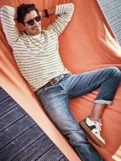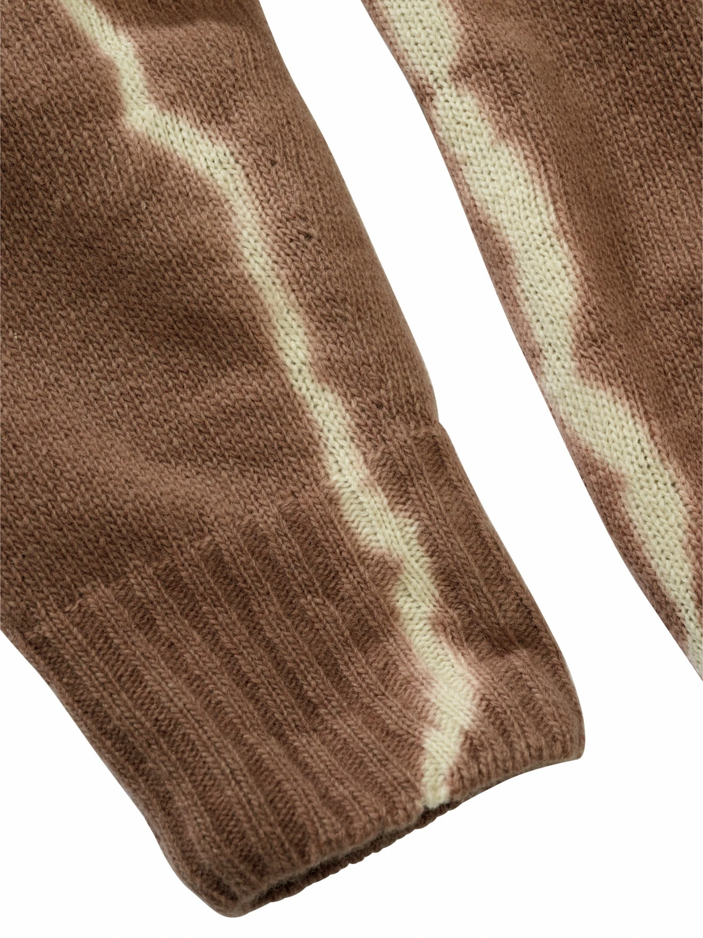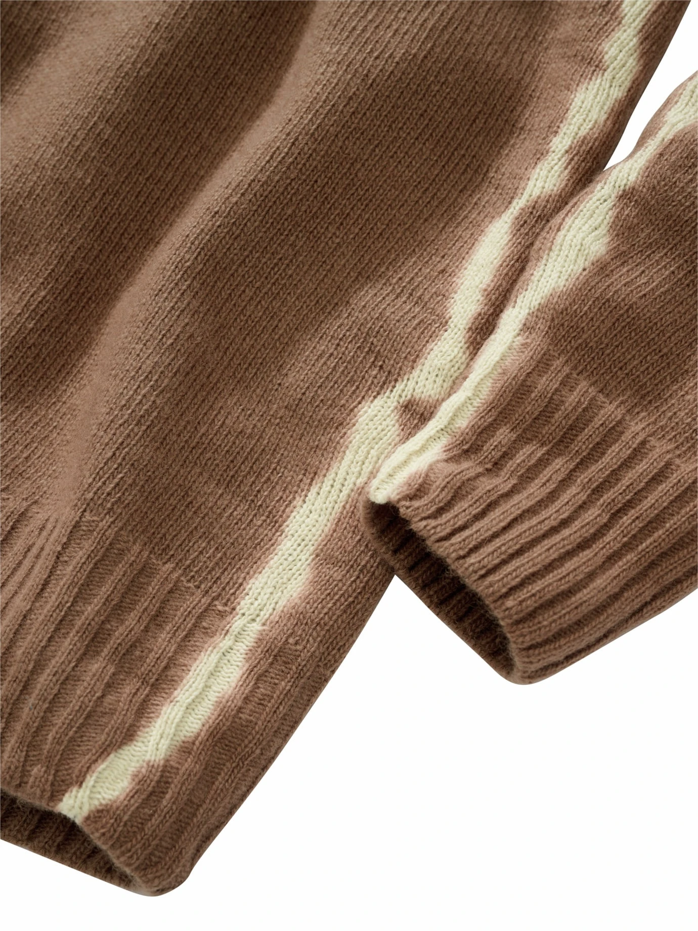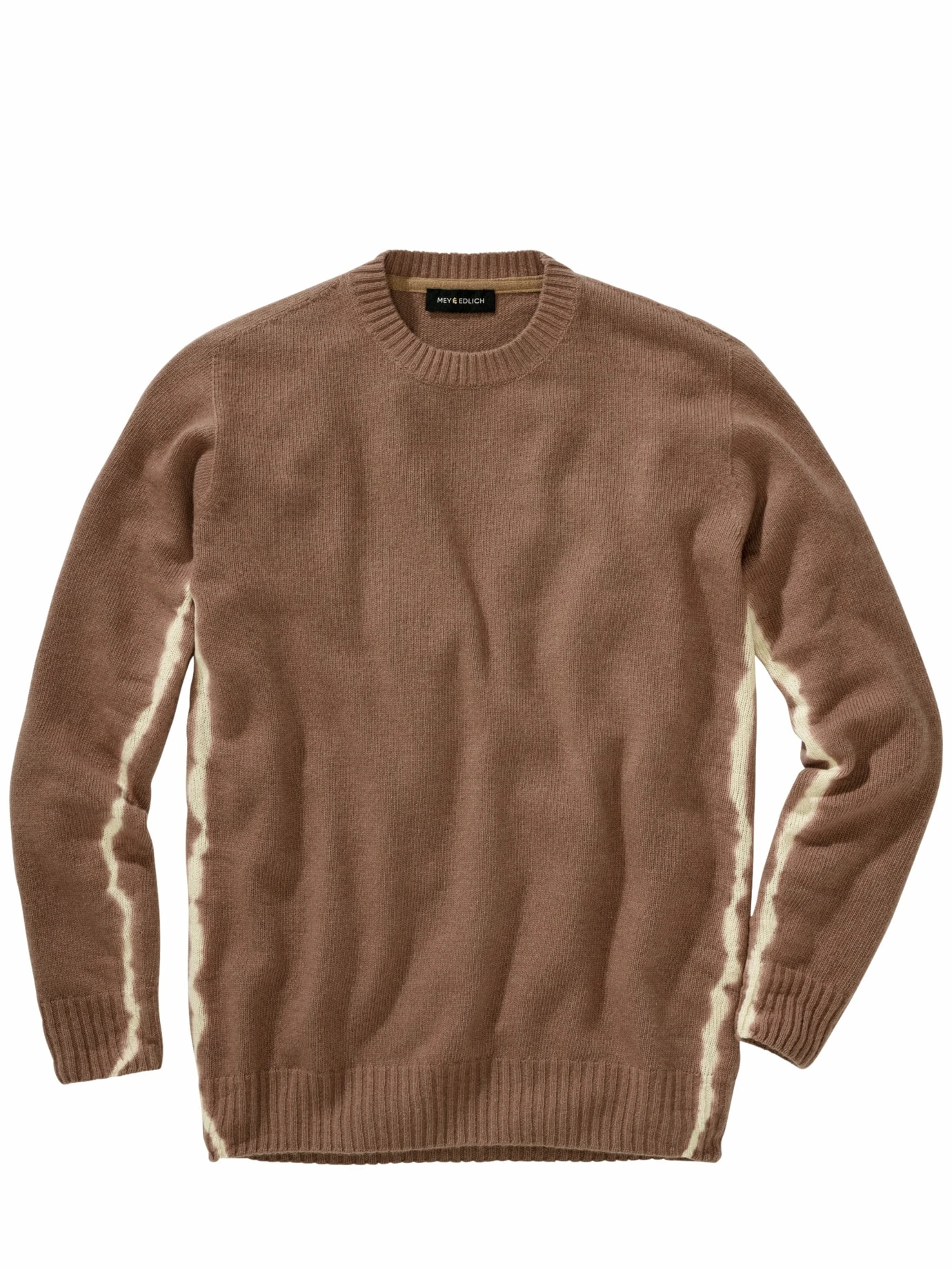 Ausgegorene Farben. Der Braunton ist auf seine Essenz reduziert, wie der Geschmack von Salami, Käse oder Wein nach dem Fermentieren. Bei dem hellen Batikstreifen an der Seite scheint der Umwandlungsprozess schon länger im Gange zu sein. Das Garn stammt aus Italien und wurde ebendort verstrickt. Viel wärmende Wolle trifft auf eine Portion Hightech für die längere Haltbarkeit. Mit Jeans und Hosen in Naturfarben liegen Sie genau richtig.