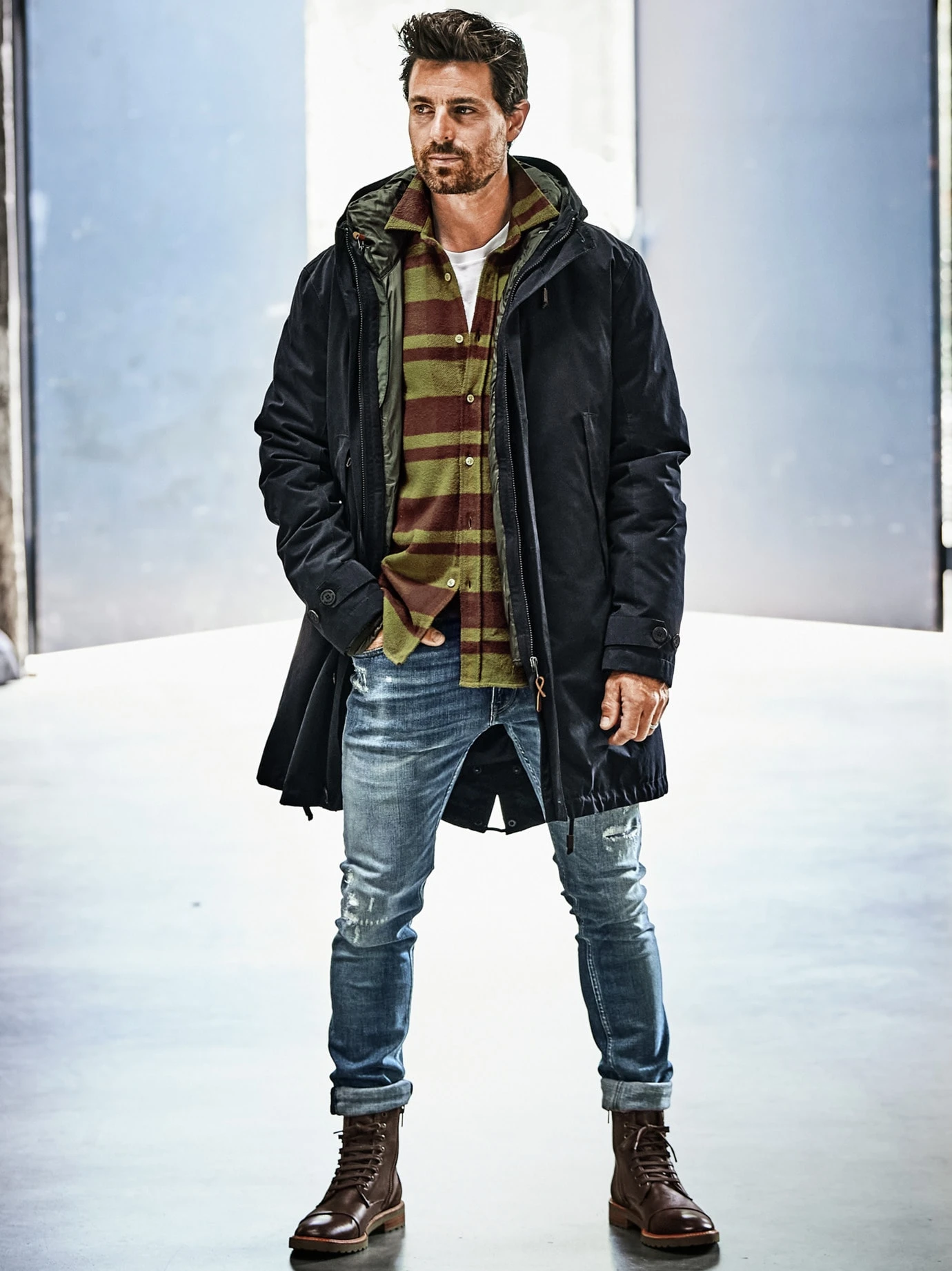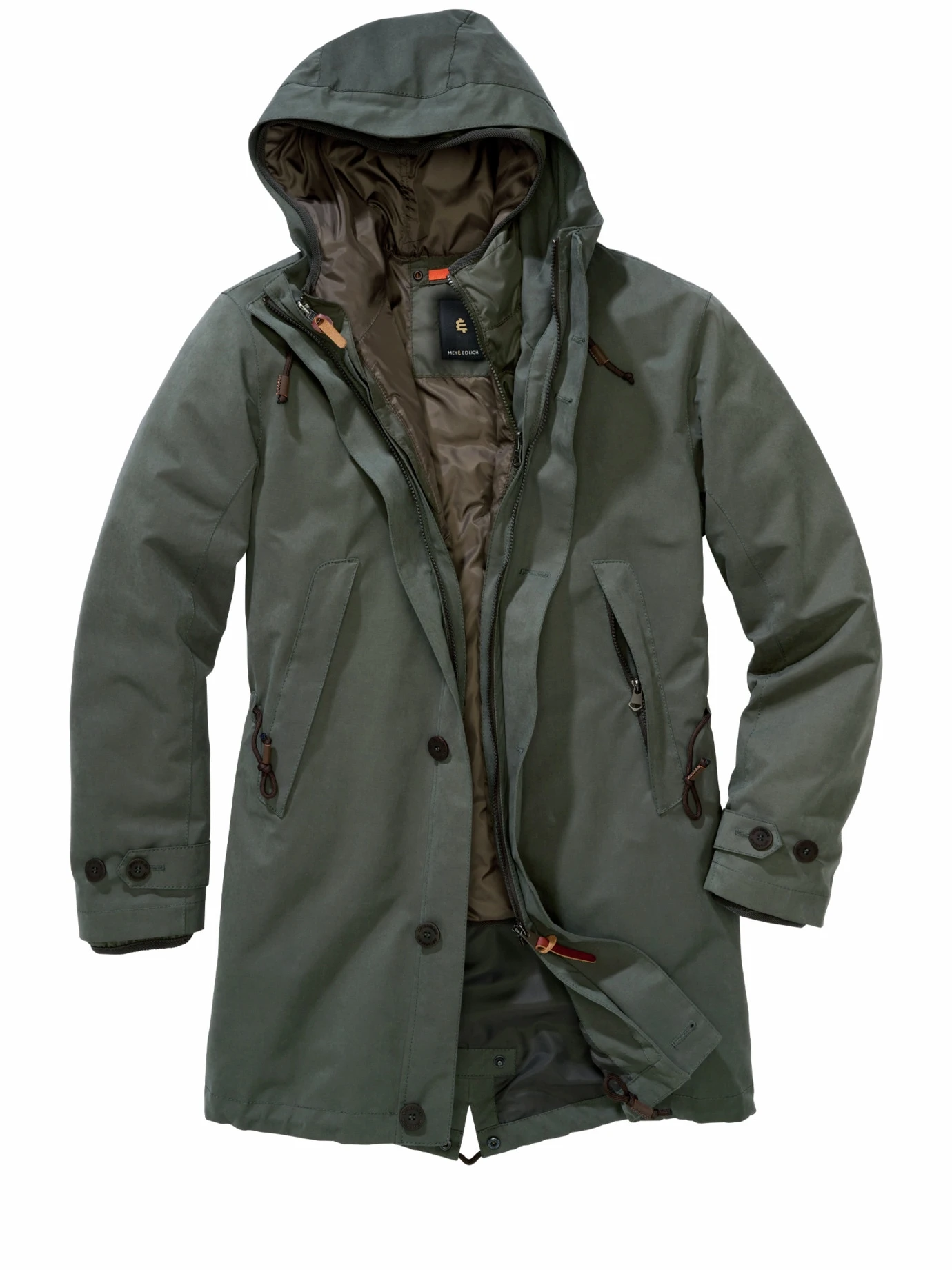 Besser als Meteorologie. Dieser Parka ist auf alles und das ganze Jahr vorbereitet. Wird es kühler und gegebenenfalls nass, werfen Sie sich den Parka über. Der dicht gewebte Stoff aus Baumwolle und Hightech erinnert an die geliebte Wachsjacke, weist Regen ab und schützt vor Wind. Ist es kühl und sonnig, tragen Sie die innere Steppjacke – das leichte Fibre-Fill-Futter wärmt wie echte Daune. Wird’s richtig kalt, tragen Sie Parka und Steppjacke gemeinsam. Viel Funktion, die sich dank des guten Designs nicht aufdrängt. Natürlich mit parka-typischem Schwalbenschwanz.