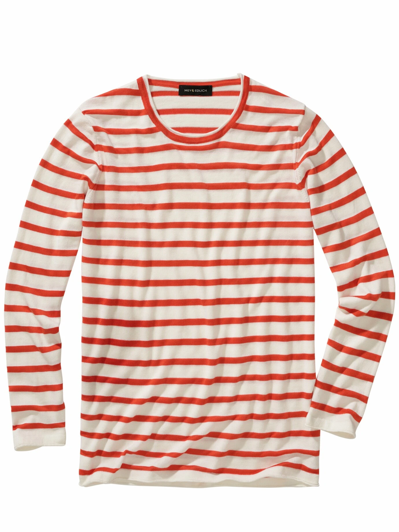 Eine echte Seltenheit. In diesem Streifen verstecken sich 15 % Seide – purer Luxus. Der Definition nach ein aufwendig dünn gestrickter Pullover, der in seinem Tragegefühl vielmehr an ein Shirt erinnert. Deshalb tragen Sie die tolle Kombination aus gestrickter Seide und Baumwolle am besten direkt auf der Haut. Fällt leicht und locker und glatt. Die Seide sorgt zudem dafür, dass die Farben lange schön intensiv bleiben.