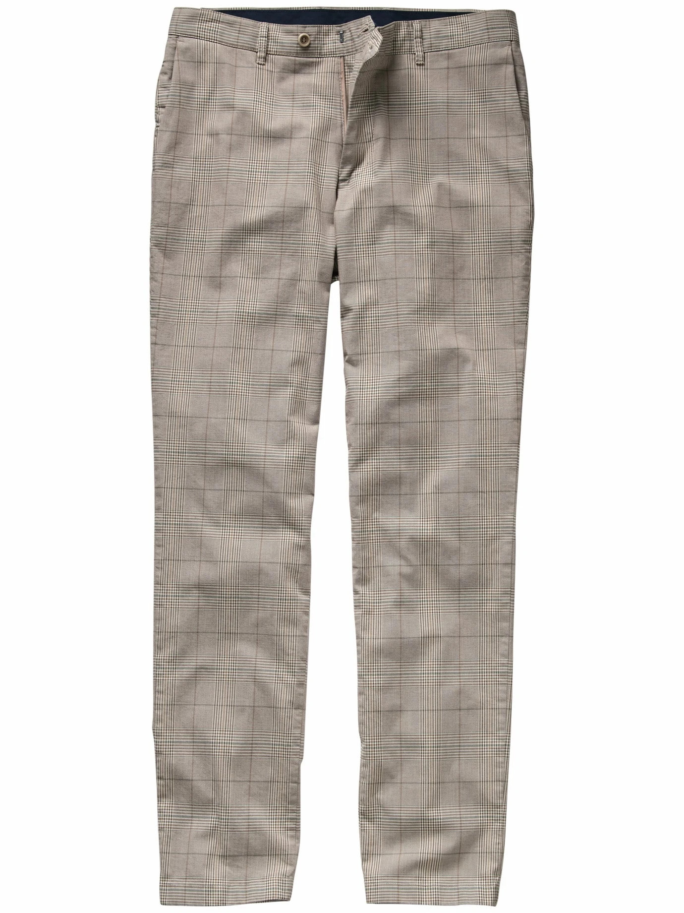Startet vor 180 Jahren seine Karriere und macht weiter: das Glencheck-Muster, erzeugt aus kleinen und großen Karos, entsteht in den schottischen Highlands, wo die Webkultur jahrhundertelang Tradition hat und Karos irgendwie zum Kulturgut zählen. Bei der Hose macht der Stoff das Glencheck-Thema neu und interessant. Statt fester Wolle bildet nachgiebiger Baumwollstoff die Grundlage, durch die helle Farbwahl wirkt sie sehr modern. Passt zum schmalen Rolli so gut wie zu Hemd samt Weste. Ein paar auf Hochglanz gebrachte Sneaker dazu, läuft.
