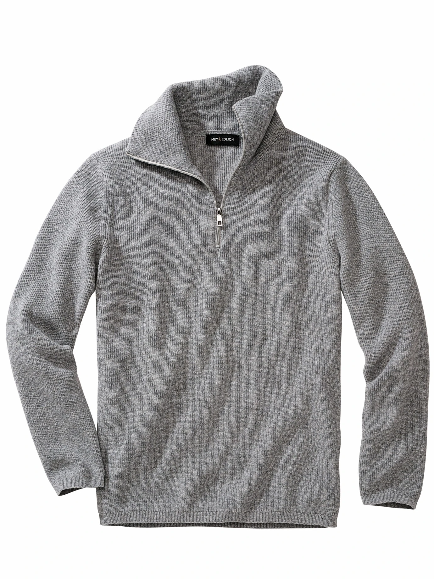 Hätte der Fischer das geahnt. Der Troyer, der ihn an Deck vor dem kalten Atlantikwind schützte, ist wieder aufgetaucht. Kernig wie immer mit Zipper und hohem Kragen. Neu zur wärmenden Wolle hinzugekommen ist die Portion Hightech. Sie macht den Pullover viel weicher, pflegeleicht und verortet ihn eindeutig ins 21. Jahrhundert. Ruppig sind nur noch die Geschichten, die Sie sich spätabends in der Hafenspelunke mit Ihren Kumpels erzählen. Gut zu Jeans und Lederjacke.