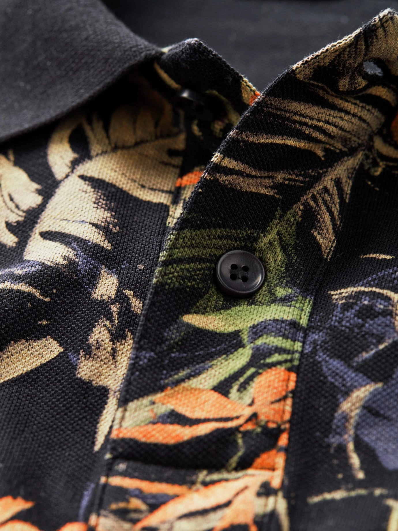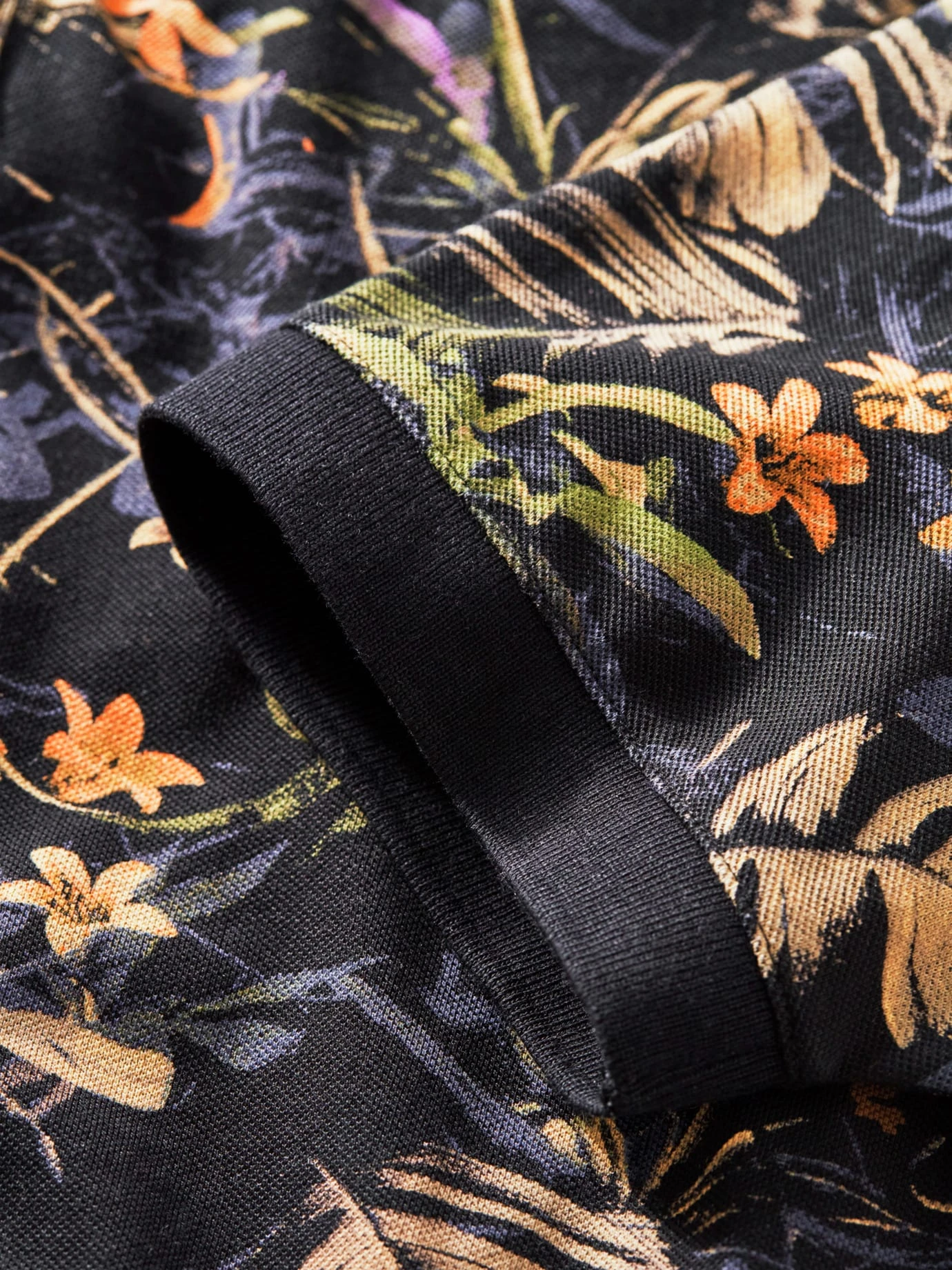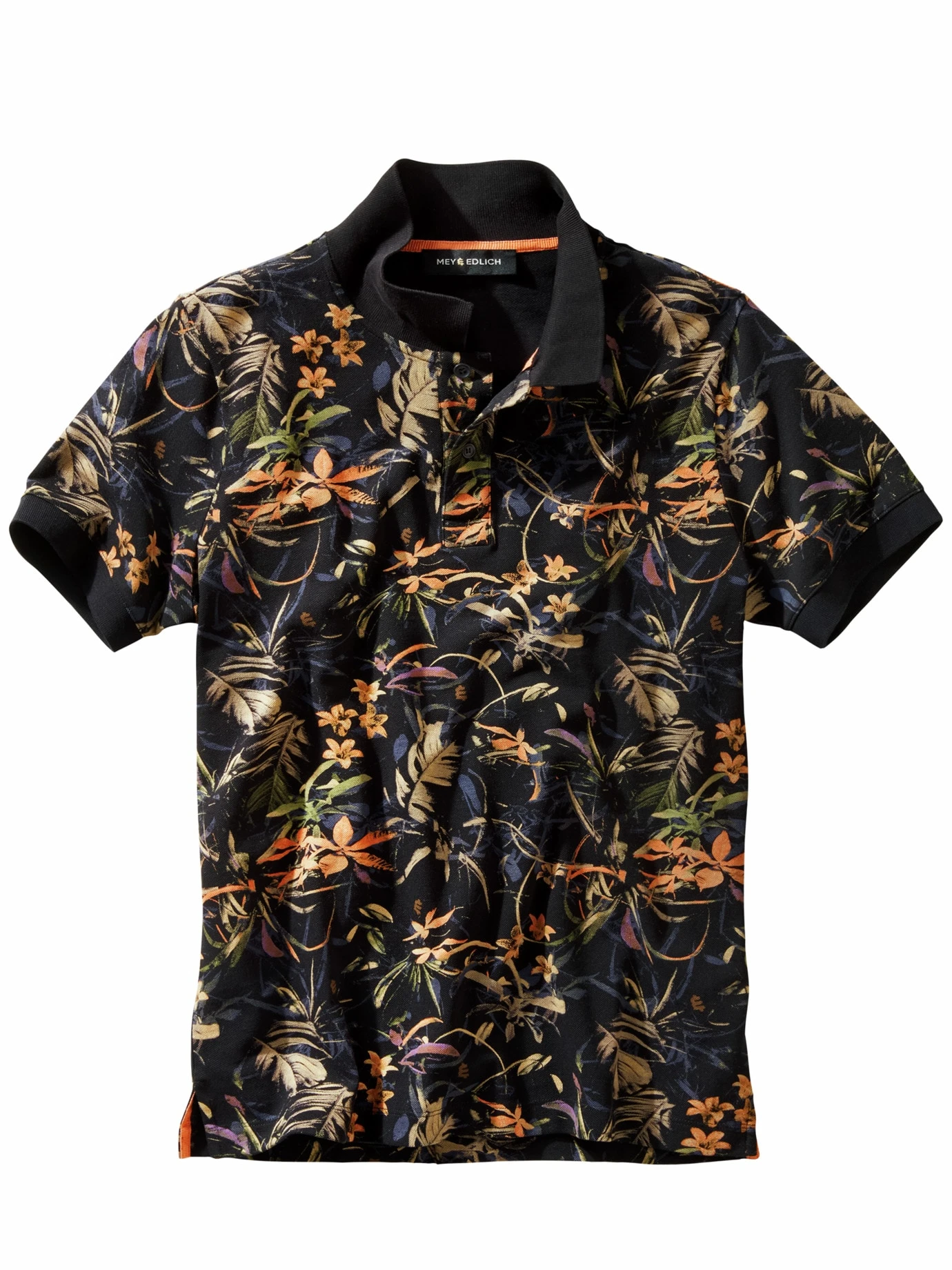 Fluoreszierende Flora. Eines der wenigen schwarzgrundigen Shirts, das es schafft, Lust auf Sommer zu machen. Schöne, intensive, bald schon fluoreszierende Farben, gedruckt auf tiefdunklem Schwarz. Passt zu allem im Kleiderschrank, was Sie ab 22 Grad gern tragen, zum Beispiel Shorts in Naturtönen.