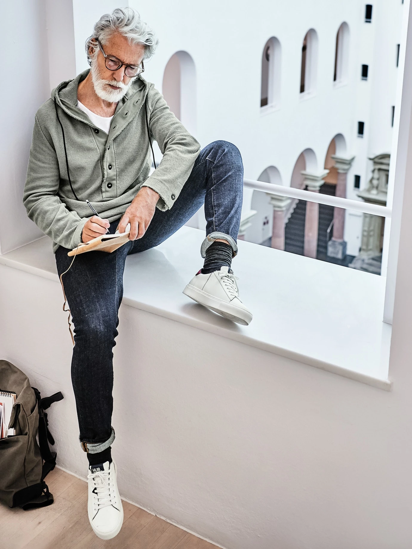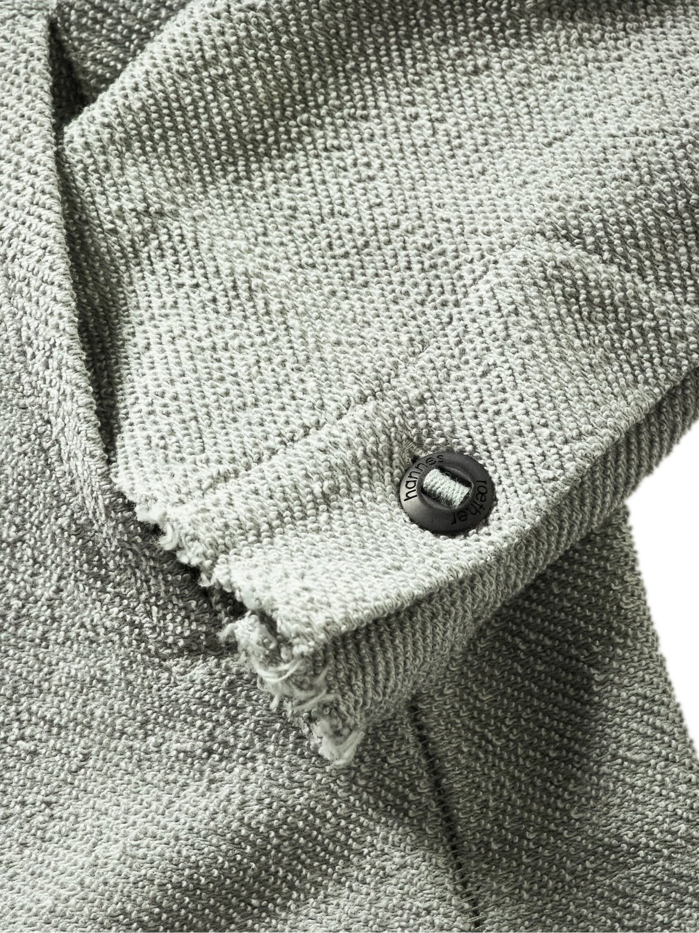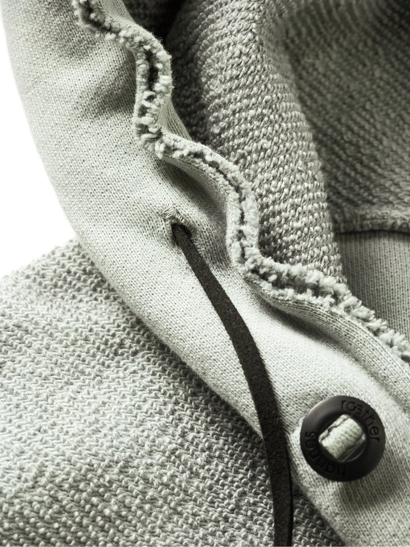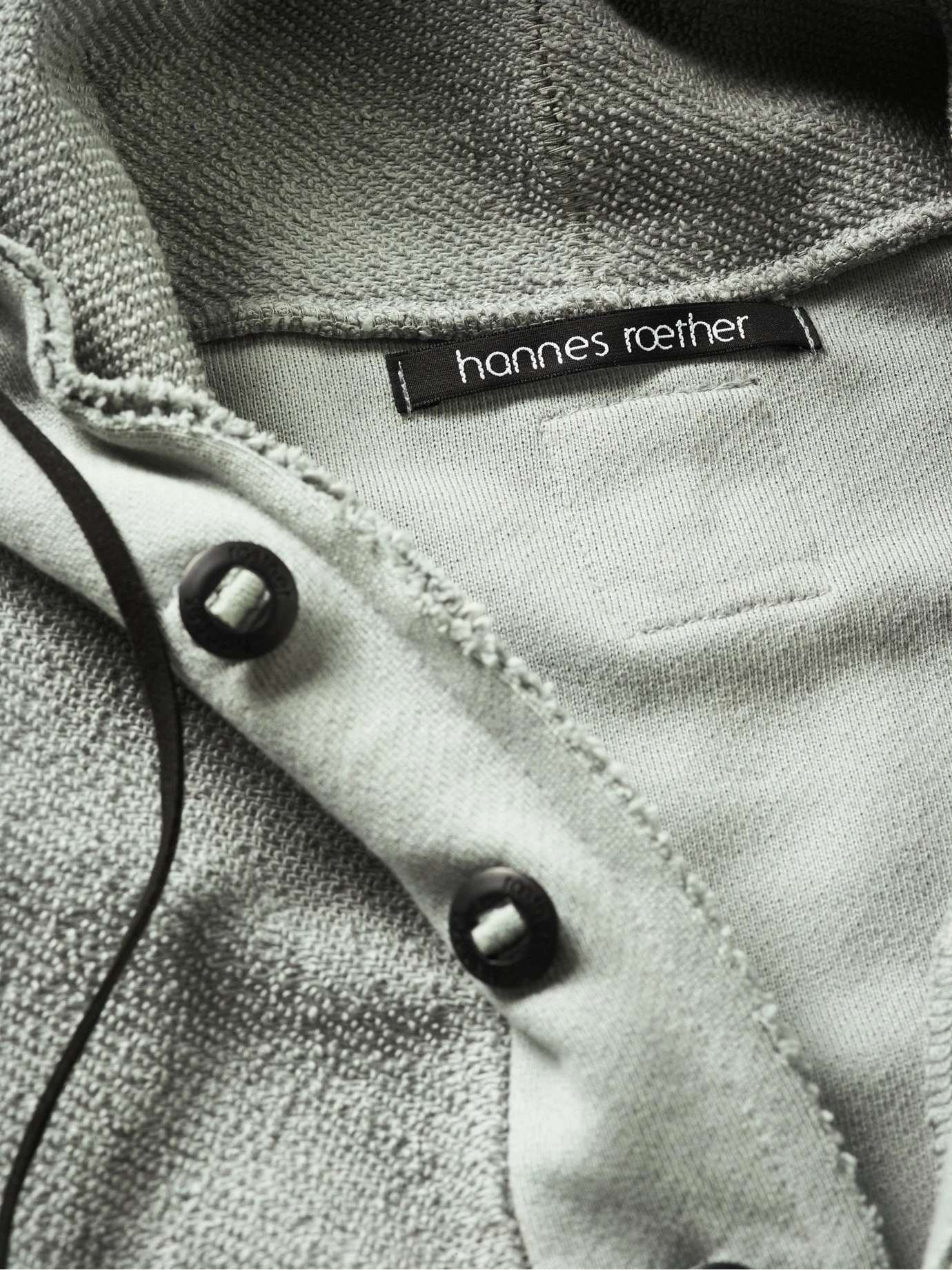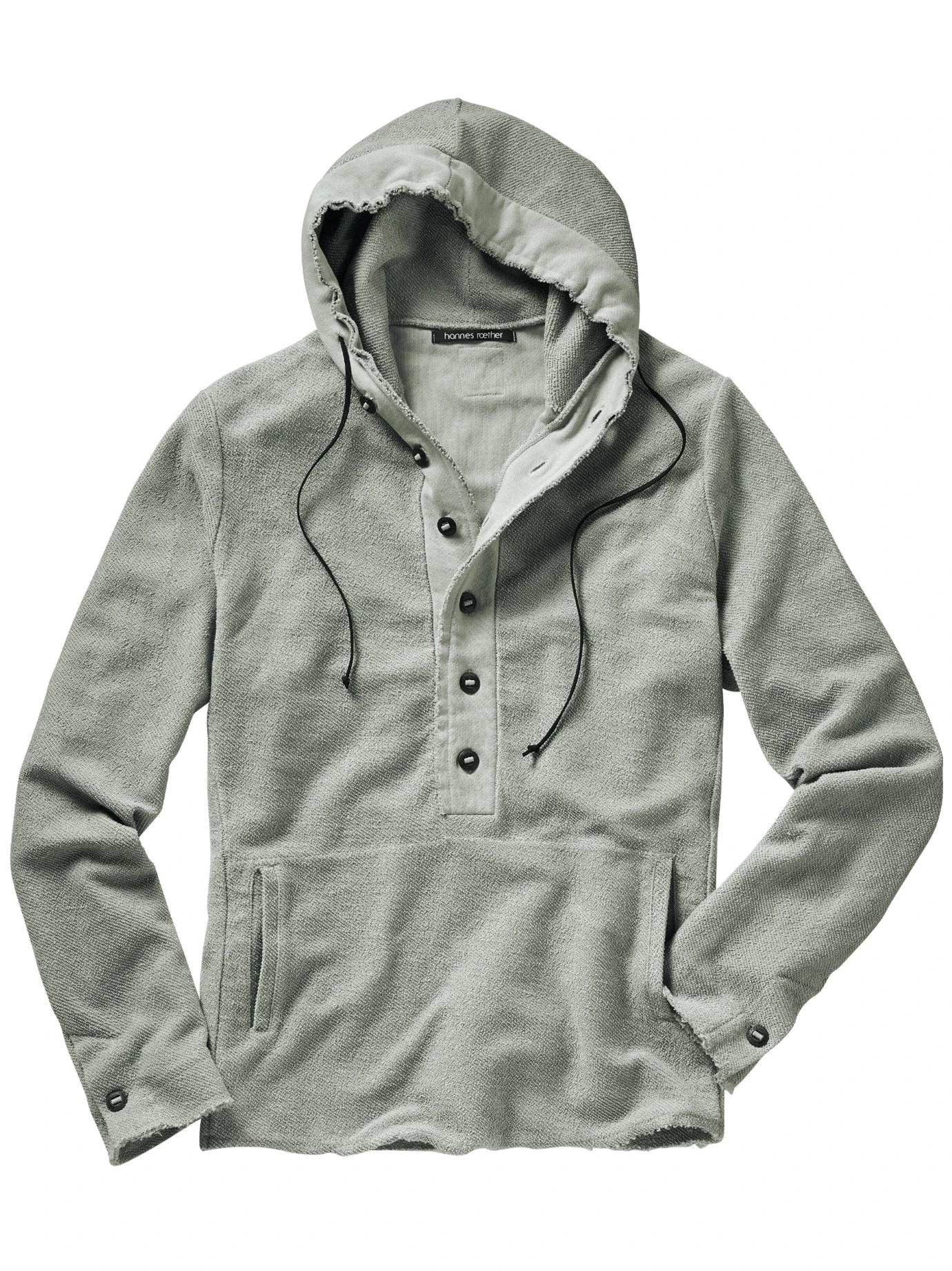 Streicht alles weitere. Heavy Sweat. Sonst nichts. Der Stoff ist dick und angeraut, schwer (der Hoodie wiegt 880 Gramm) und wärmend. Bei stabilem Wetter ersetzt er die Jacke. Der Designer hannes roether krempelt zusätzlich den portugiesischen Stoff nach außen und setzt die 6-Knopf-Leiste fein säuberlich mit der glatten Seite ein. Verleiht Substanz. Weitere Zutaten: die offenen Kanten an Kapuze und Saum, die XXL-Kängurutasche trägt Hände und Wertvolles, für Uhrenträger mit knöpfbarem Ärmelschlitz, die Teilungsnähte im Rücken verschaffen breites Kreuz.