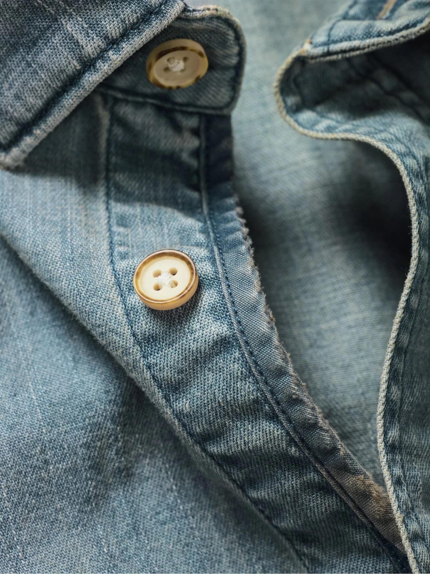 More life, less work. Wie beiläufig verweist dieses Jeanshemd auf die wilden, unbeschwerten Zeiten der Vergangenheit. Damit es die richtige Patina trägt, ist es schön heruntergewaschen und dirty überfärbt. Klassisch und workwear-üblich sorgen 2-Nadel-Steppungen dafür, dass das Hemd lange hält und strapazierfähig bleibt, noch mehr Garn fördert die Haltbarkeit an Schulter und Armloch. Noch immer für jeden Style zu haben. Unverwüstlich zum weißen Shirt, aufgeknöpft als zusätzliche Schicht an kühleren Abenden.