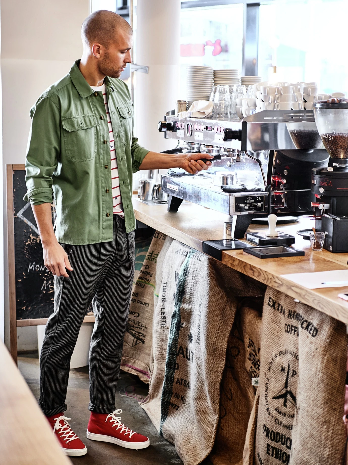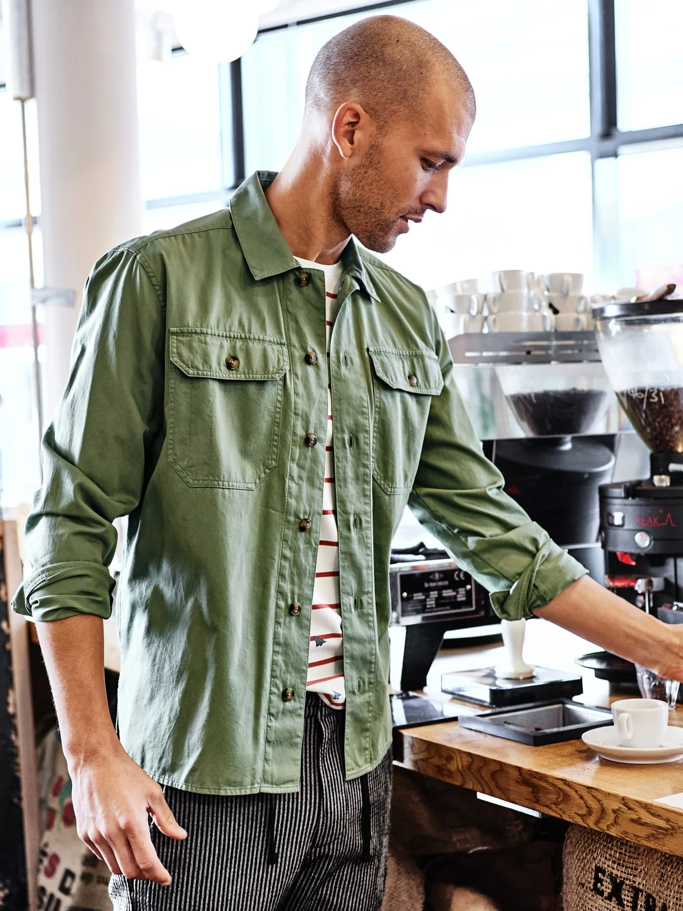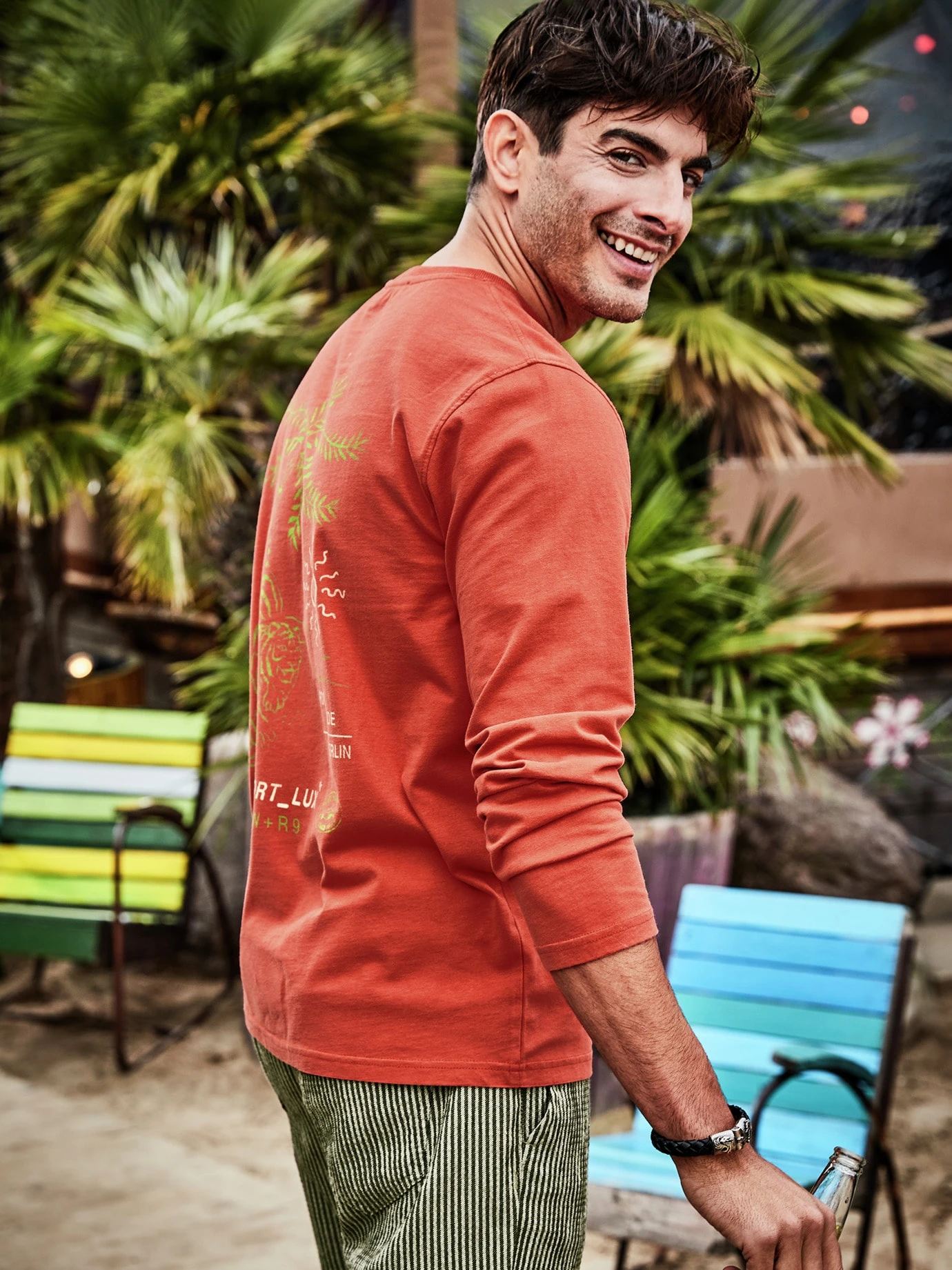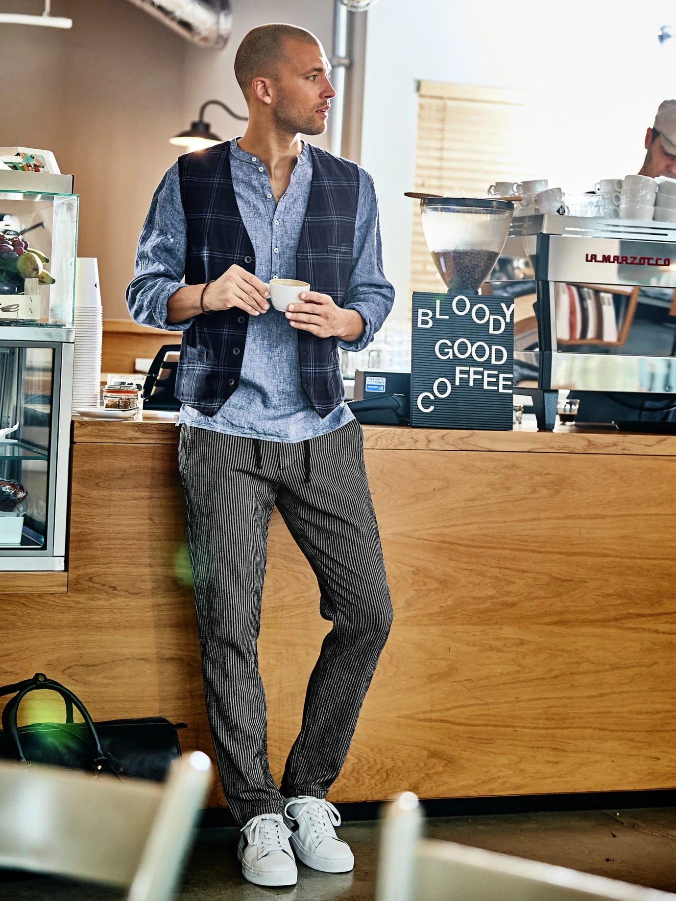 Reinschlüpfen und genießen. Braucht es nur noch den passenden Sommer, eine Hose aus Seersucker wäre dafür die richtige. Der reliefartige, kreppähnliche Krisselstoff klebt nicht auf der Haut und sorgt fürs gute Belüftungsmaß. Da Bügeln ebenfalls entfällt, tragen Sie sie zur Not auch zwei Tage oder planen sie direkt für den Urlaub ein. Falls vor Ort dann ein Malheur passieren sollte, ist sie eh superschnell wieder trocken. Gerne mit hoch gekrempeltem Saum und ohne sichtbare Socken in den Sneakern tragen, obenrum T-Shirt oder leichtes Sommerhemd.