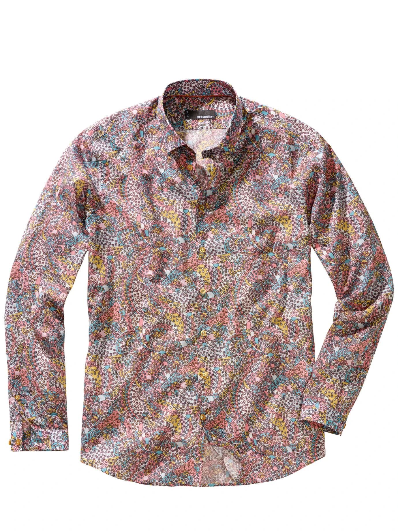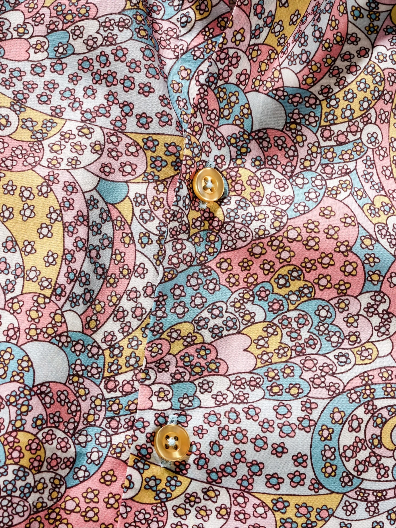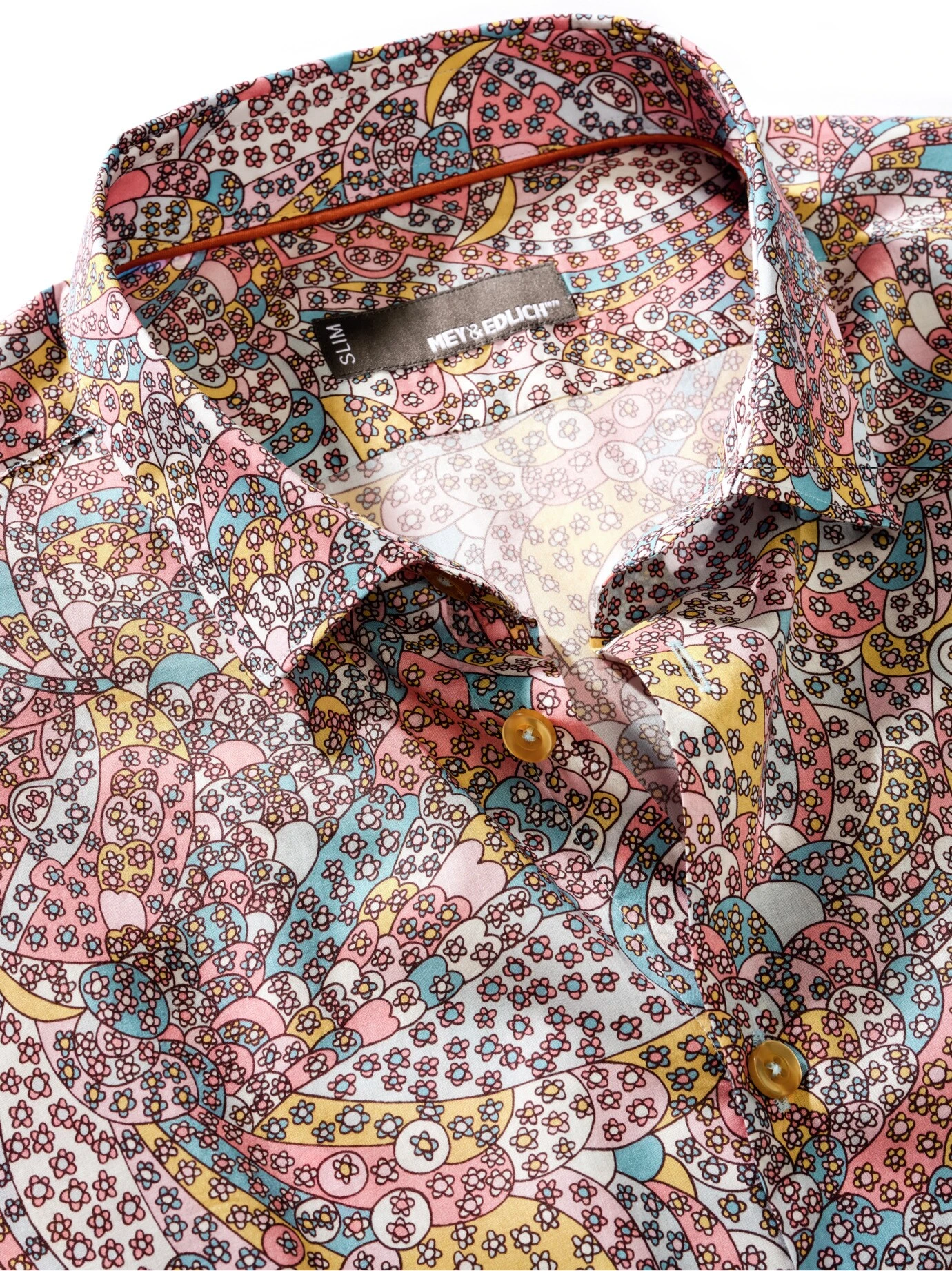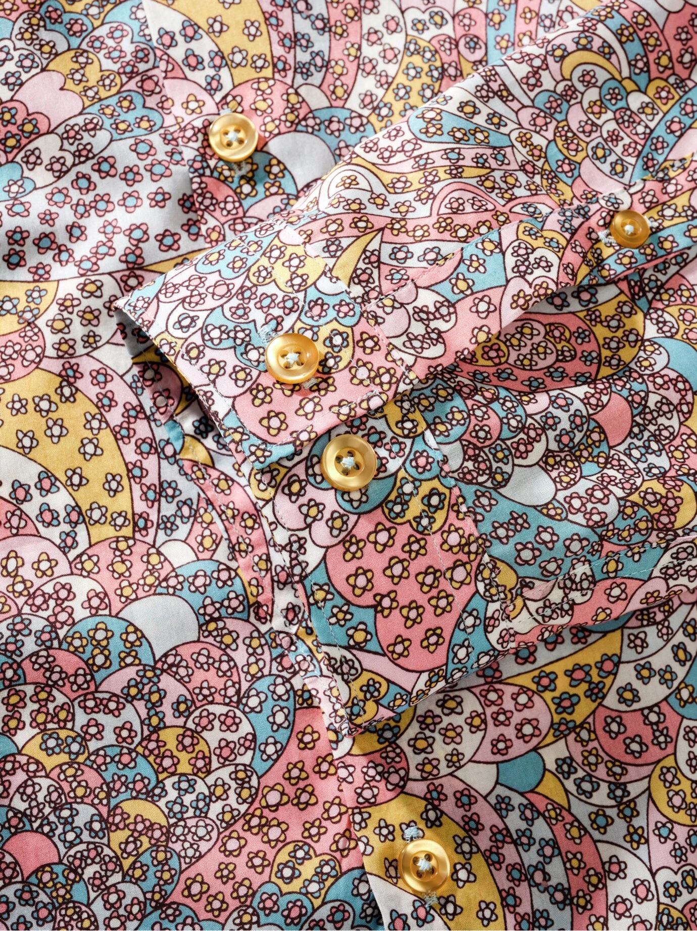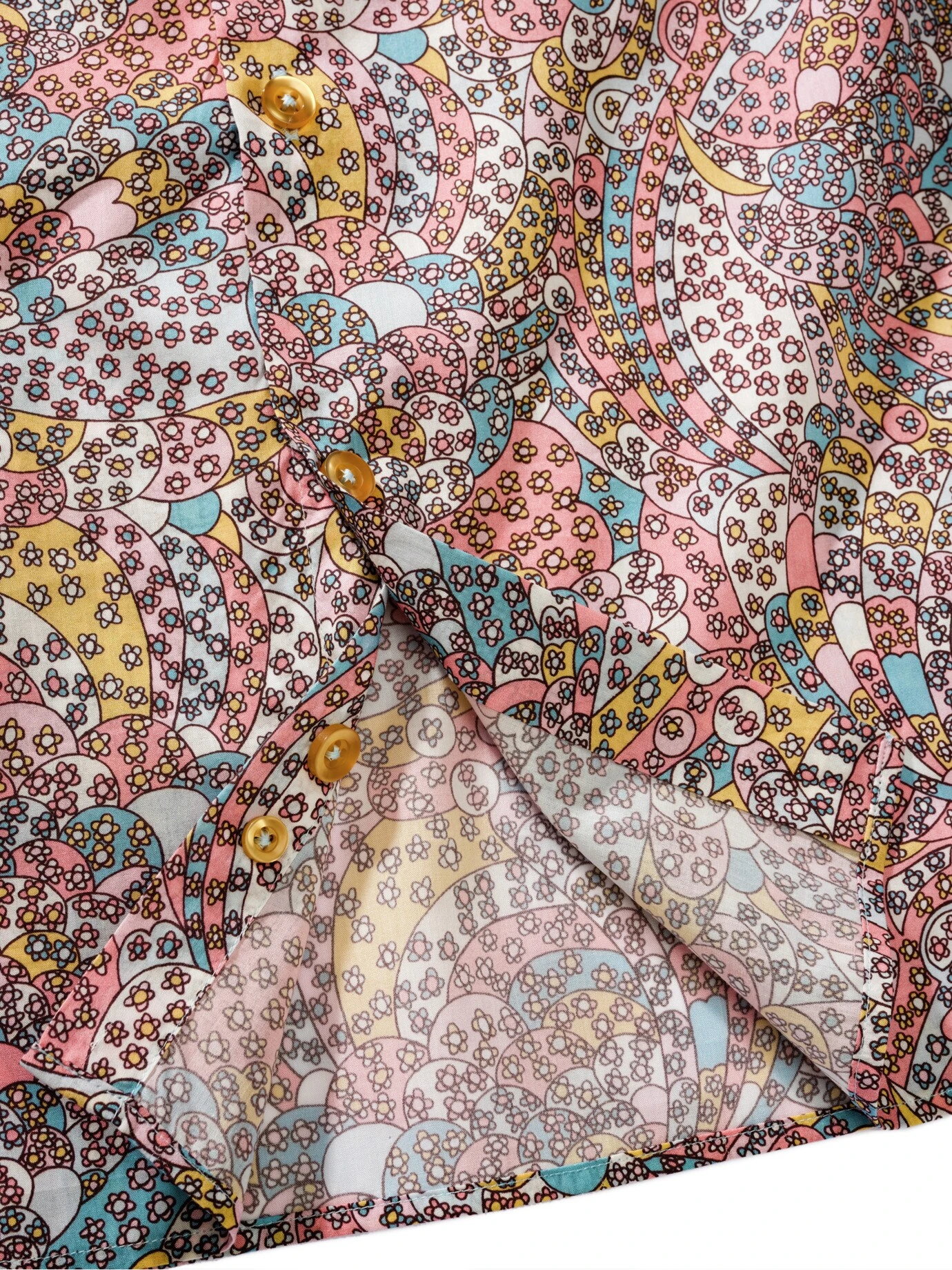 Swinging Sixties in der Regent Street. Hier haben die Liberty-Designer „Mortimer“ erstmals entworfen, eine wilde Blumenmischung im Arts-and-Crafts-Stil. Heute liefert die schablonenartige Zusammensetzung der Pastelltöne den Gesprächseinstieg über die Zeit von Magical Mystery und Sergeant Pepper. Gedruckt auf seidig fließende Tana Lawn-Baumwolle – Libertys Garant dafür, dass Farben ewig ihren Sättigungsgrad behalten. Komfortabel selbst zugeknöpft durchs weiche Satinband an der Krageninnenseite. Zur Party mit Jeans, einem Anzug verleiht es Esprit.