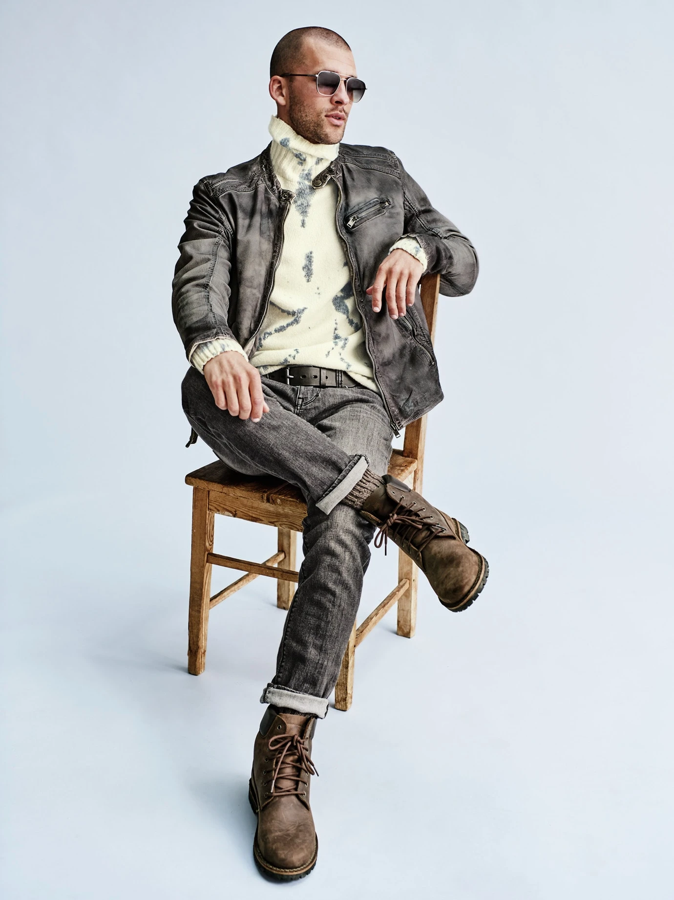 Weiches Lammnappa mit der Attitüde echten Lebens. Den Look erhält die fertig genähte Jacke durch eine Spezialfärbung – genau das Richtige für alle Fans des kernigen Biker-Stils, die sich sonst sattgesehen haben am typischen Uni-Ton klassischer Lederjacken. Passend dazu: die fetten Metallreißverschlüsse, der Druckknopf am Kragen, die solide Rückensteppung und die kernigen Nähte dort, wo sonst echte Protektoren sitzen. Stilecht in Grau-Grau-Kombinationen oder mit enger Jeans und derben Boots.