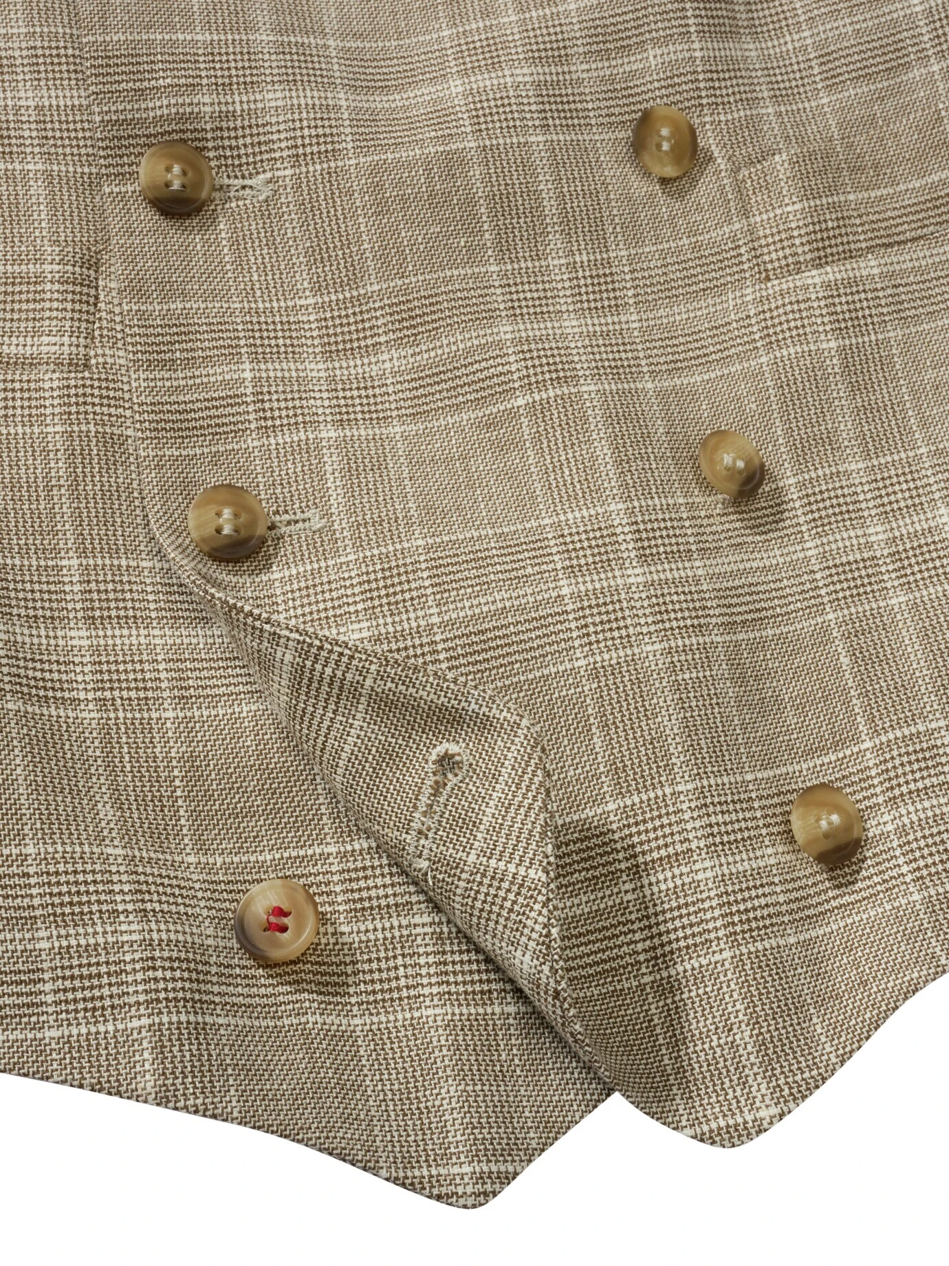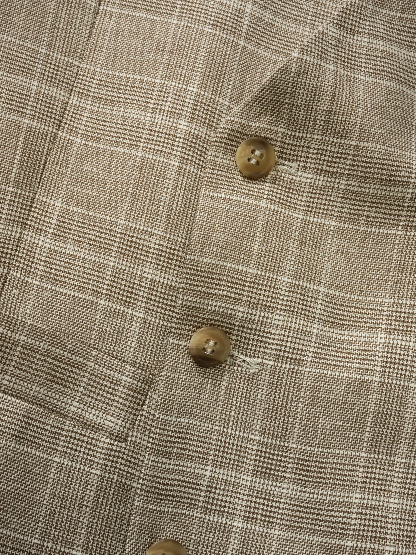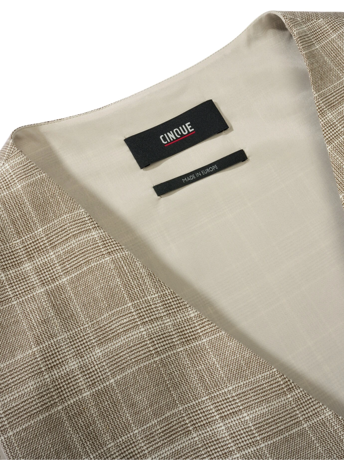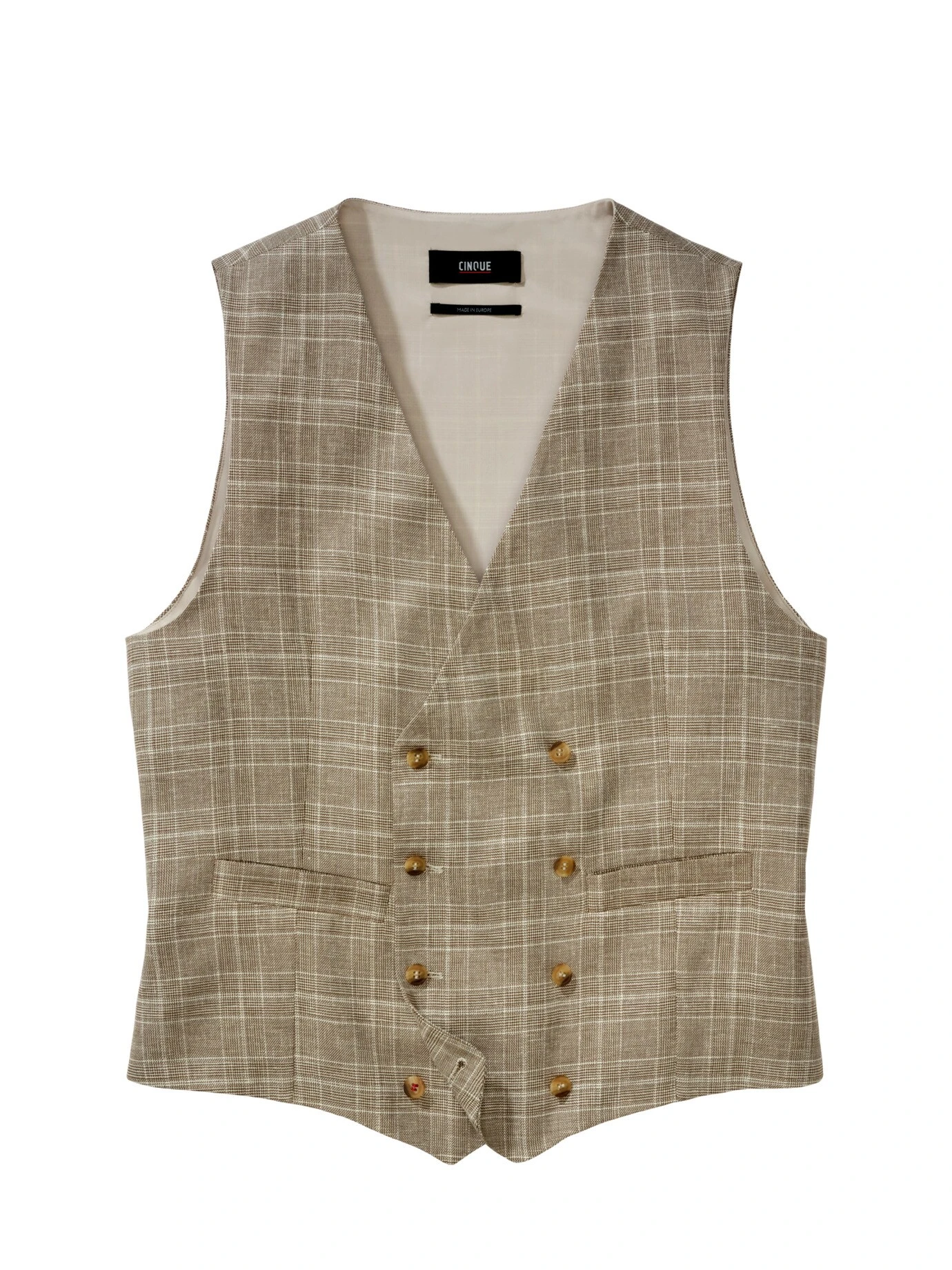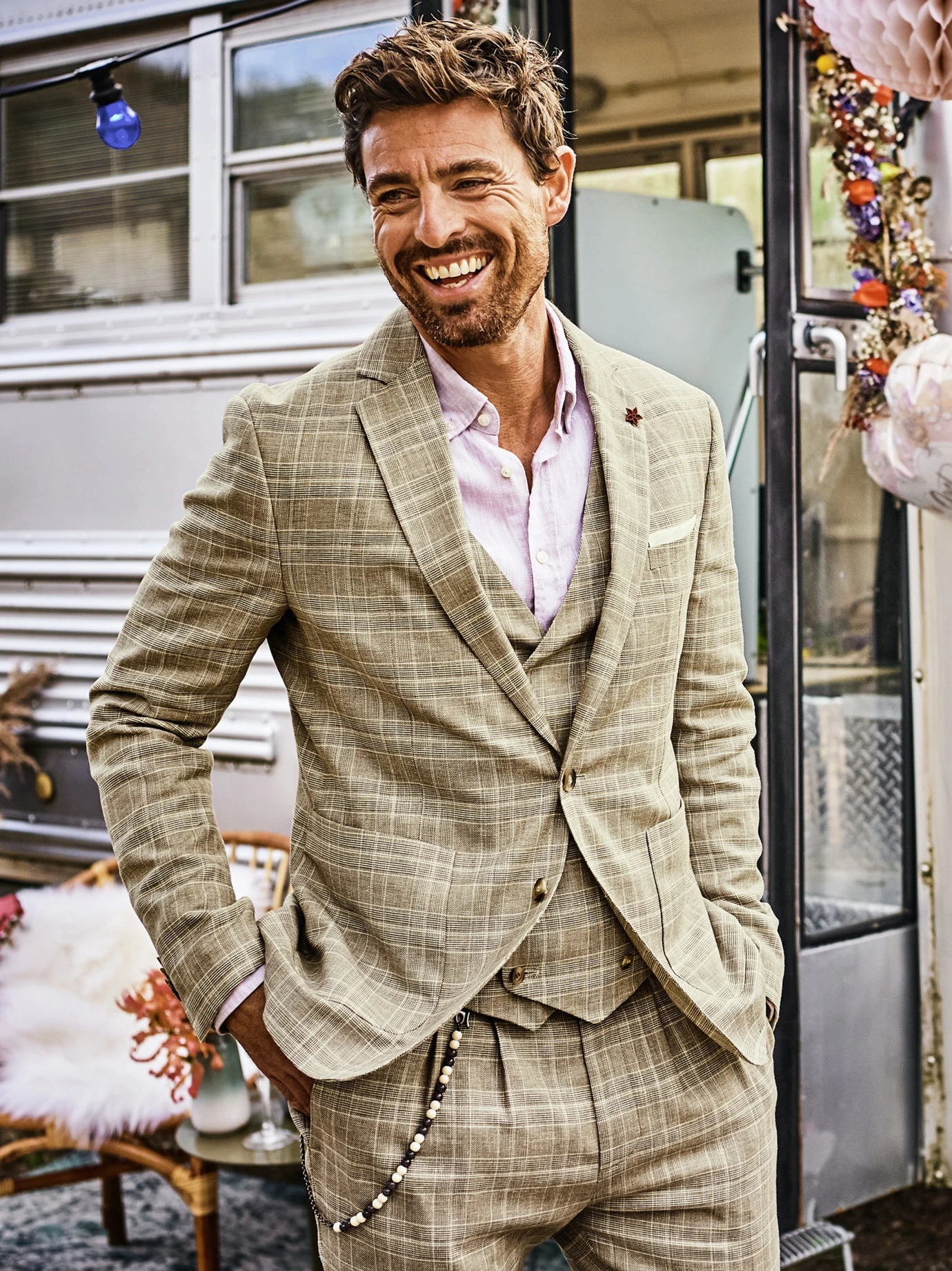 In ihr feiern Sie die Liebe. Mit ihr gewinnen Sie mehr Zeit zur Planung von freier Trauung, Boho-Hochzeit oder dem Ja-Wort am Strand – denn die Entscheidung für die passende Hochzeitsweste liefert das Haus CINQUE. Ideal als Dreiteiler mit Sakko (Nr. 24-6775-1) und Hose (Nr. 24-6776-8). Dazu ein Klappmanschettenhemd, ein Einstecktuch, edle Lederschnürer (oder barfuß) und ein Lächeln über beide Ohren. Das Karo verleiht Eleganz, für das Vintage-Flair sorgen die Knöpfe in Hornoptik. Sofern der Bräutigam einverstanden ist, auch eine gute Wahl für Gäste. Der Stoff fällt leicht, lässt Sie durch den Leinenanteil auch bei Hitze entspannt bleiben und sieht noch beim Mitternachtssnack frisch aus.