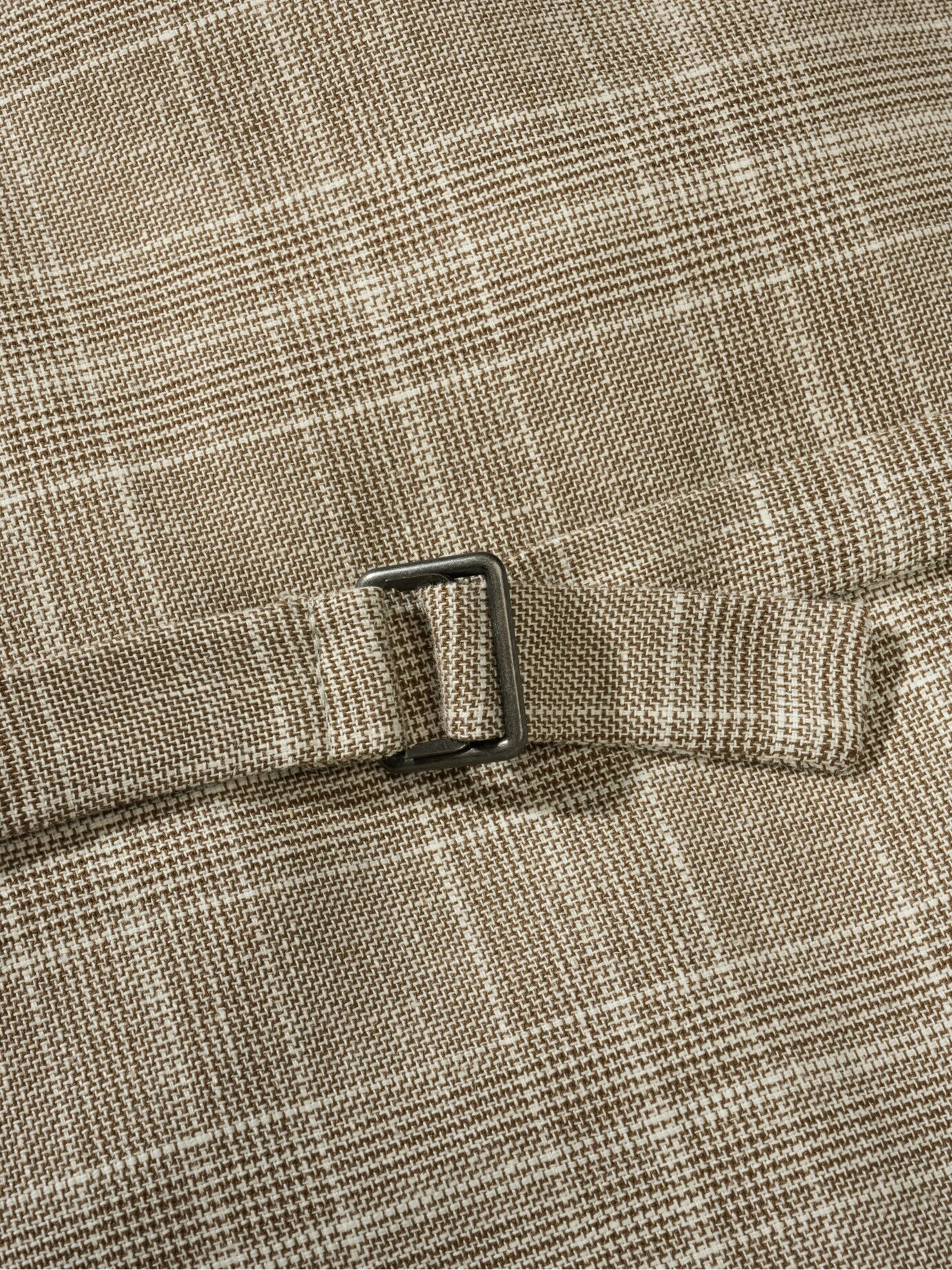 Verarbeitung: Zweireiher-Weste mit Leistentaschen. Eine Seltenheit unter Hochzeitswesten: mit stoffgleichem Rücken und verstellbarem Rückenriegel. Slim Fit.