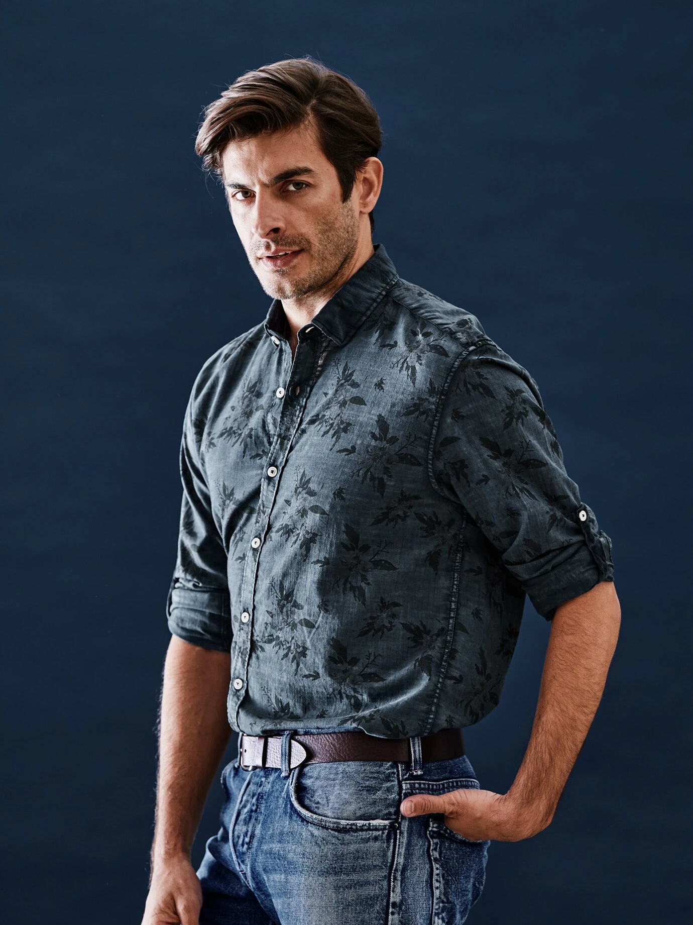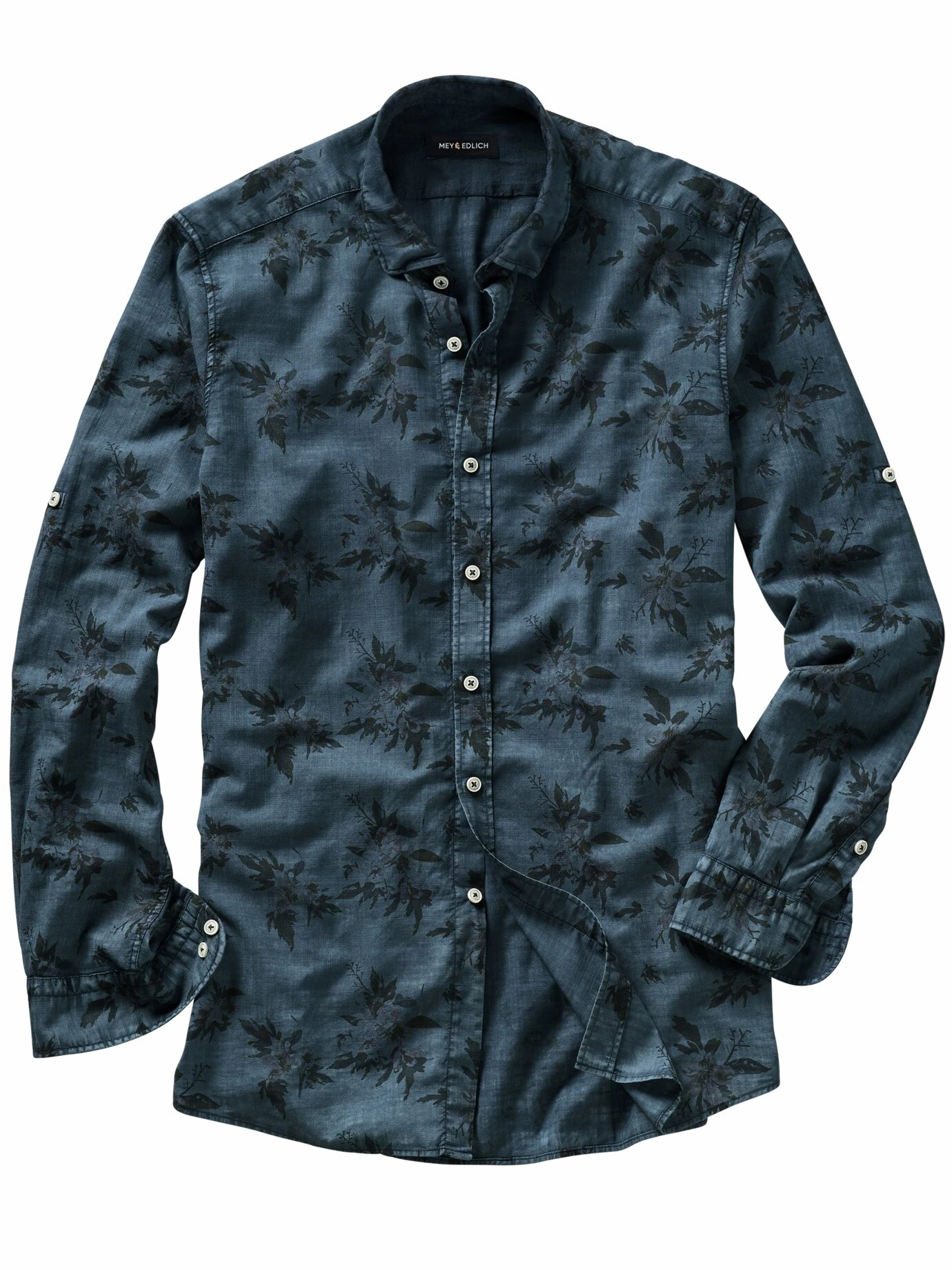 Cool wie ein Jeanshemd, nur nicht so brettig. Es wiegt mit 115 Gramm so viel wie ein T-Shirt und stellt seine Konkurrenz aus Denim in den Schatten. Gewebt aus Baumwoll-Flammgarn. Dessen unregelmäßige Struktur sorgt für Lässigkeit und dafür, dass das Hemd nie auf der Haut klebt (Stichwort: Luftzirkulation). Patina trägt es ab Tag 1, weil der Stoff erst bedruckt, dann gefärbt wird und so die Farbe unregelmäßig einzieht. Bitte über der Hose tragen, gern zu Jeans (die Blautöne sollten möglichst unterschiedlich sein).