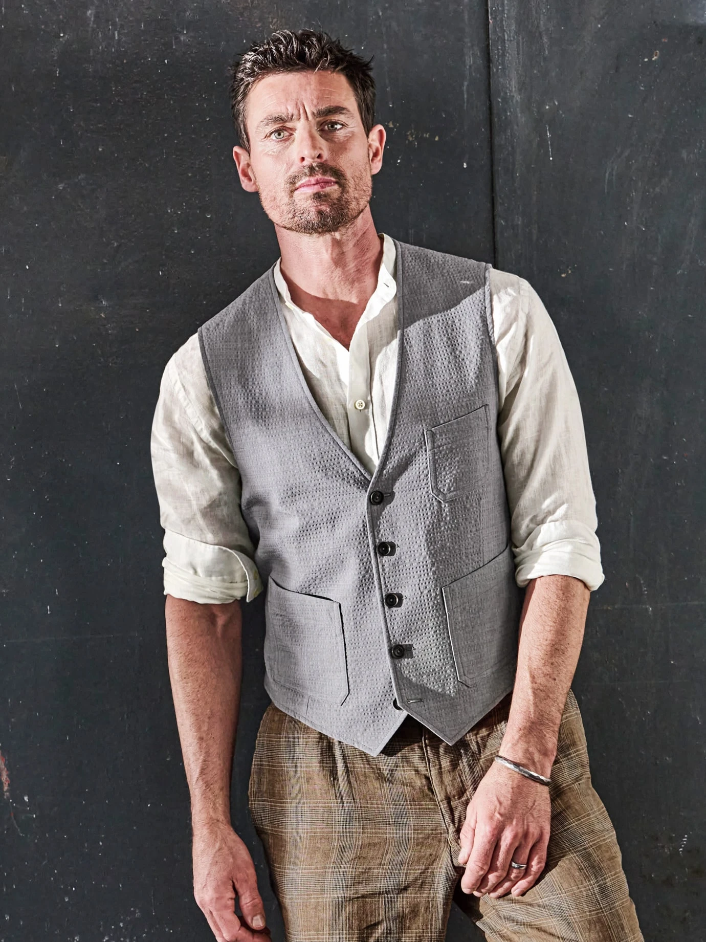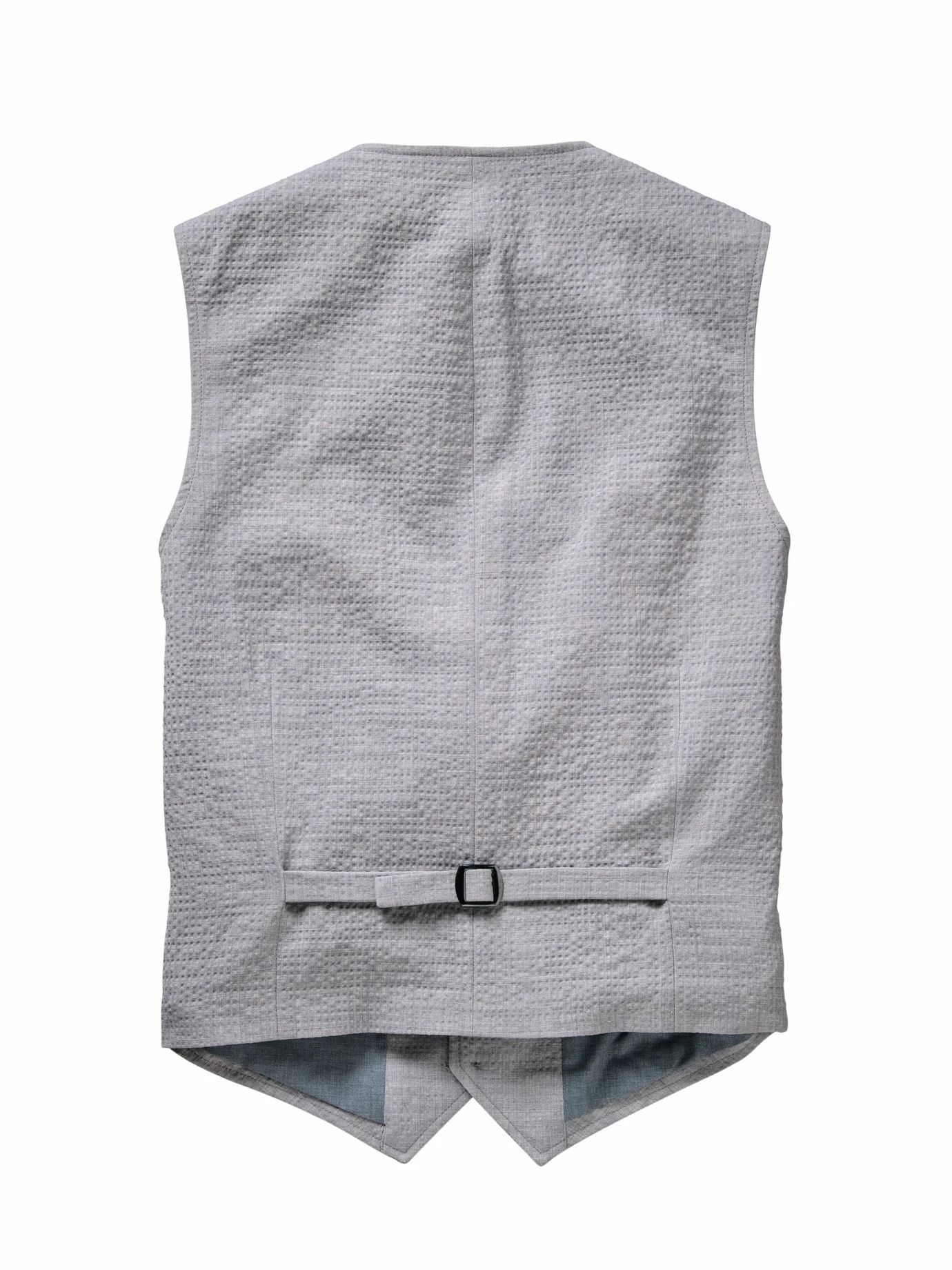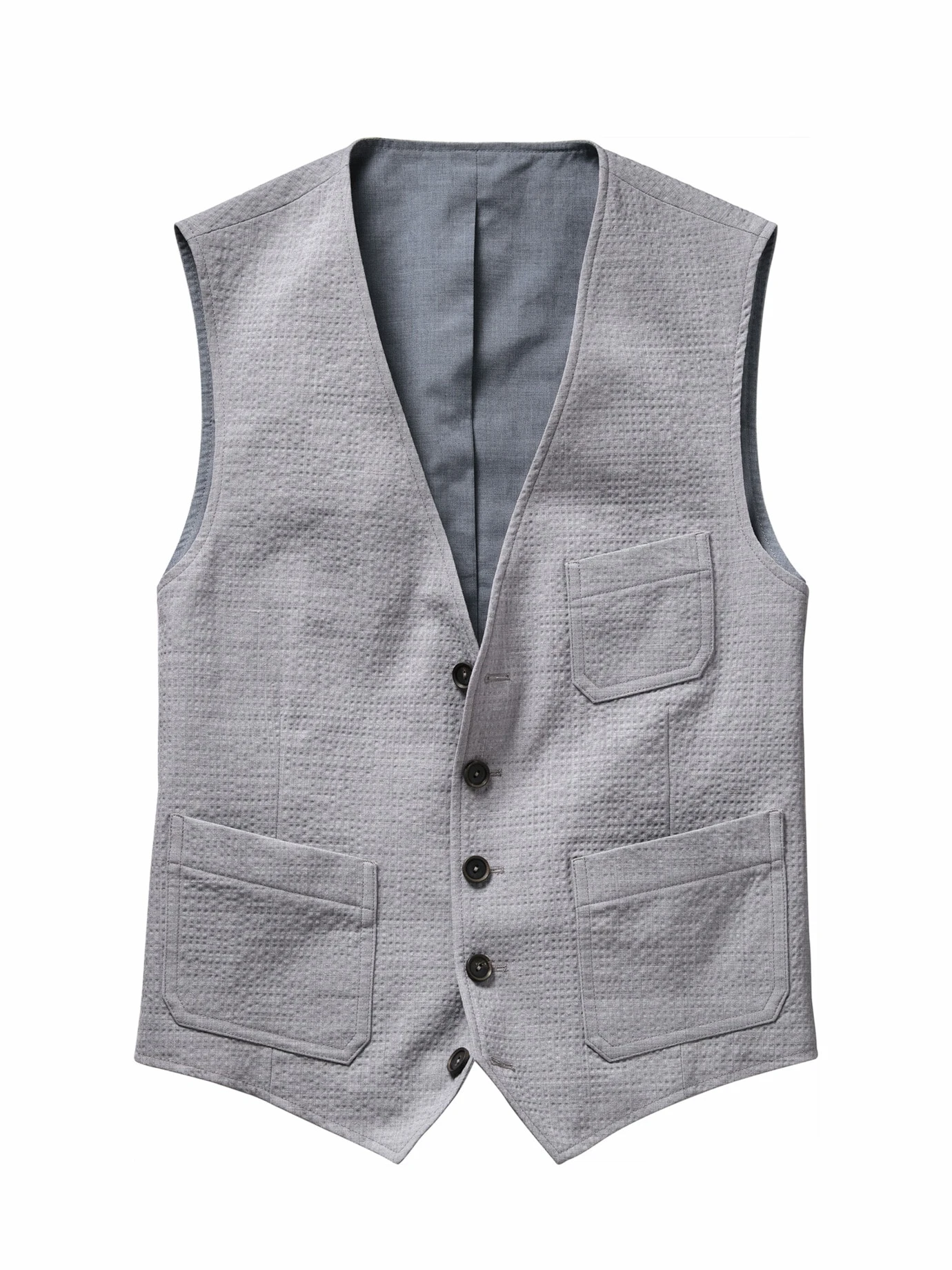 Vertragsabschluss bei 40 °C im Schatten und ohne Klimaanlage. Unser portugiesischer Geschäftsfreund Paulo trägt seit neuestem im Sommer fast ausschließlich solche Westen mit dem fühlbar erhabenem Stoff. Optisch ersetzt sie dank stoffgleichem Rücken eh das Sakko. Praktisch ist sie nah am Klassiker: aufstrebender Reverskragen, gemäßigt anliegend mit verstellbarem Rückenriegel. Das Beste sind die aufgesetzten Taschen (Workwear-Charakter) und die Farbe, die changiert zwischen Grau und Braun. Ist in der Kombination vielseitig, besonders schön mit naturfarbenen Hemden, motzt auch knallige Henleys auf.