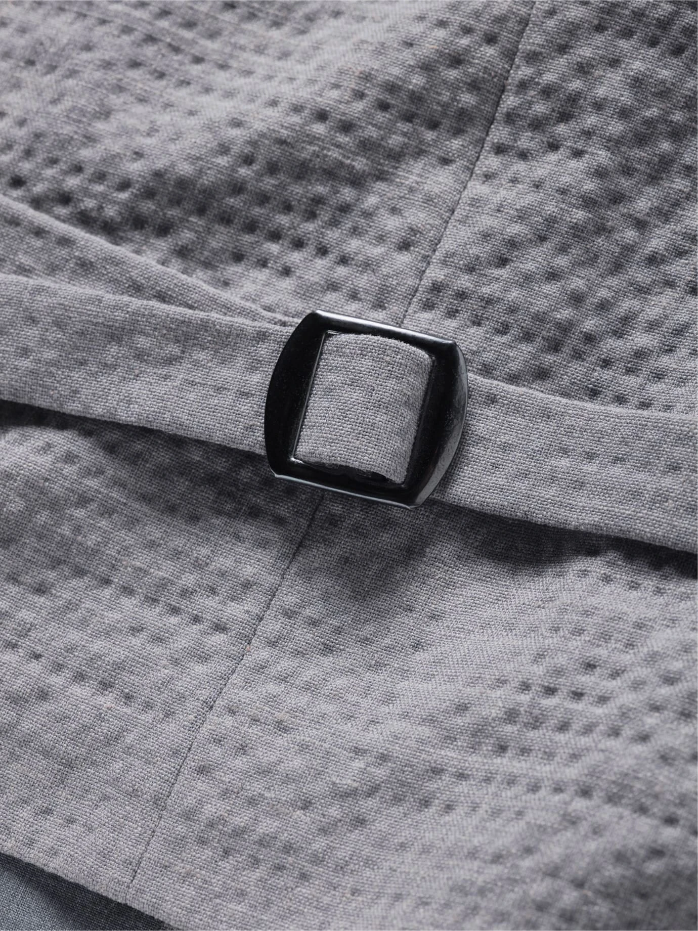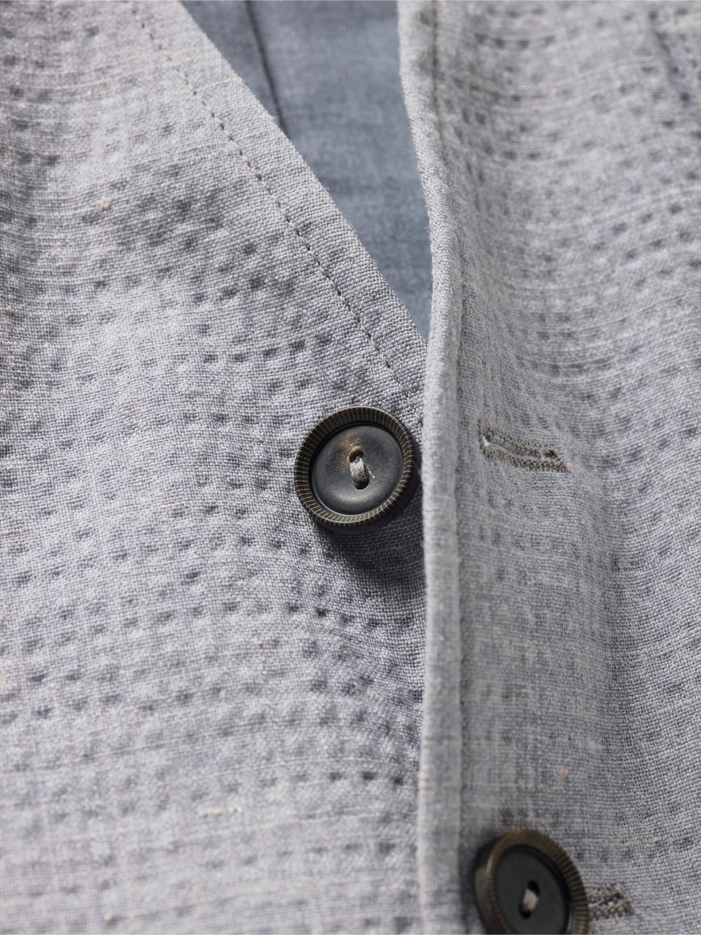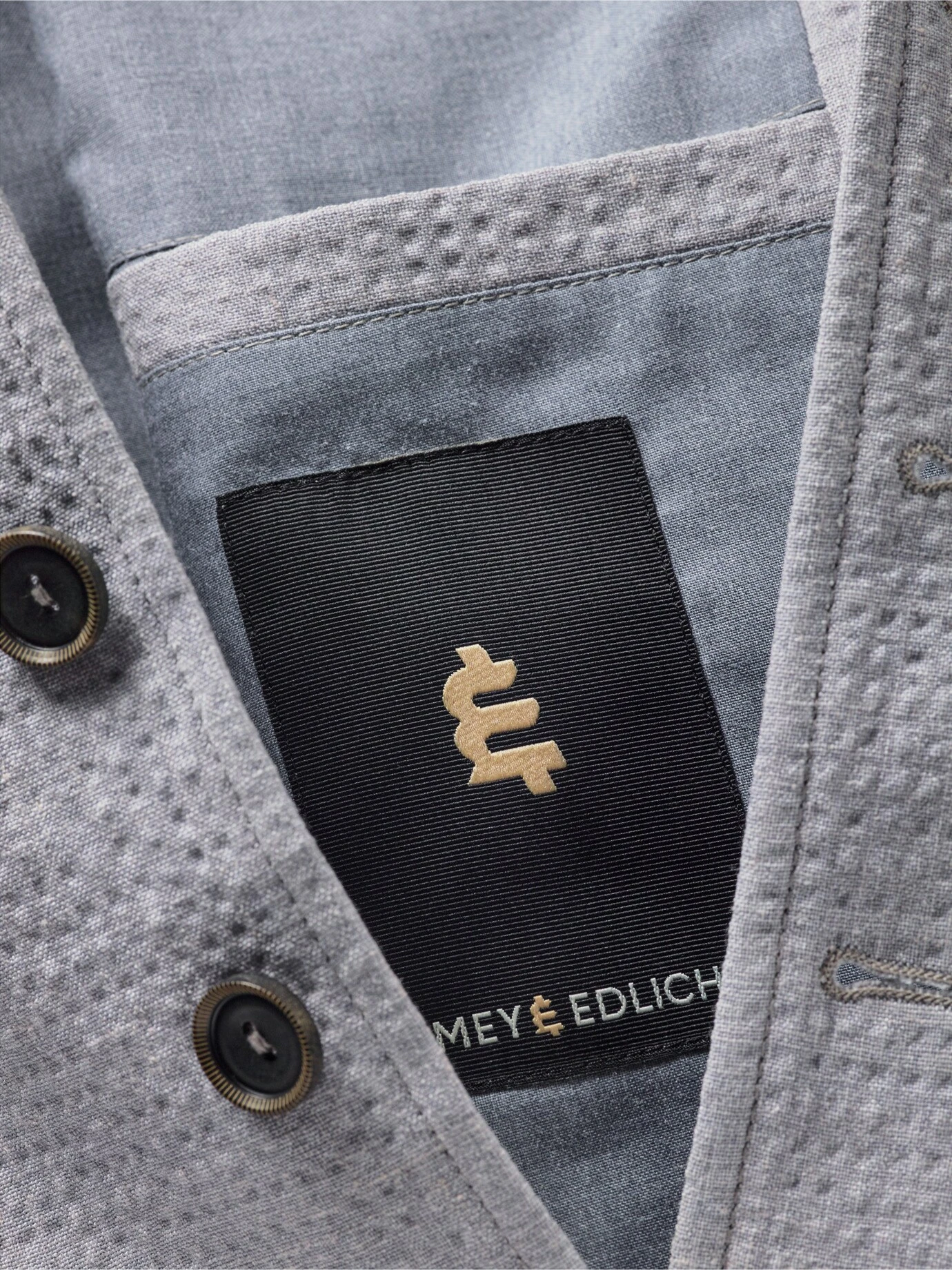 Vertragsabschluss bei 40 °C im Schatten und ohne Klimaanlage. Unser portugiesischer Geschäftsfreund Paulo trägt seit neuestem im Sommer fast ausschließlich solche Westen mit dem fühlbar erhabenem Stoff. Optisch ersetzt sie dank stoffgleichem Rücken eh das Sakko. Praktisch ist sie nah am Klassiker: aufstrebender Reverskragen, gemäßigt anliegend mit verstellbarem Rückenriegel. Das Beste sind die aufgesetzten Taschen (Workwear-Charakter) und die Farbe, die changiert zwischen Grau und Braun. Ist in der Kombination vielseitig, besonders schön mit naturfarbenen Hemden, motzt auch knallige Henleys auf.