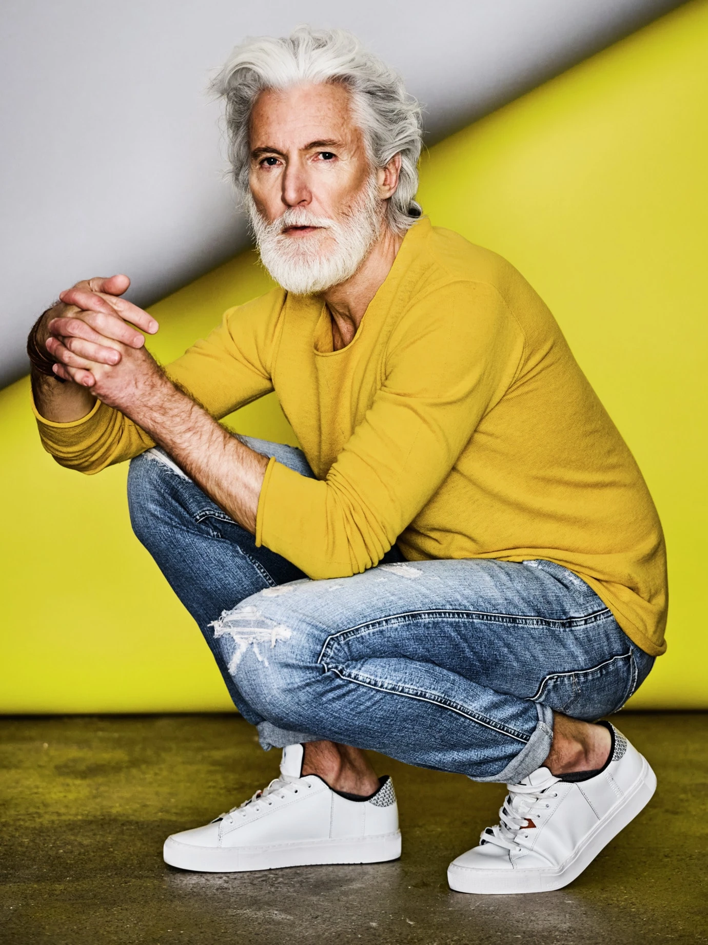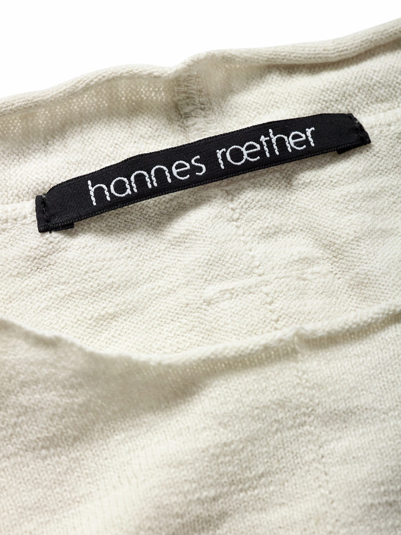 Schlicht und zum Reingreifen. hannes roether geht bei diesem Pullover aufs Äußerste: keine Seitennähte, dafür eingesetzte Ärmel samt schwungvoller Schulternaht, die optisch ein breites Kreuz formt. Keine Abschlüsse, dafür soft einrollende Kanten. Das Augenmerk liegt bei diesem Pullover auf der Körpermitte: Was sich wie ein leichter Strich vorne mittig abzeichnet, ist tatsächlich Strickkunst. Zusätzlich mit eingearbeiteter Kängurutasche, die exakt anliegt, nirgends absteht und zur Not auch Hände transportiert. Ein Pullover, der wirkt, ob zur Used-Jeans oder – wie hannes roether es wählt – zur schlank geschnittenen Leinenhose.