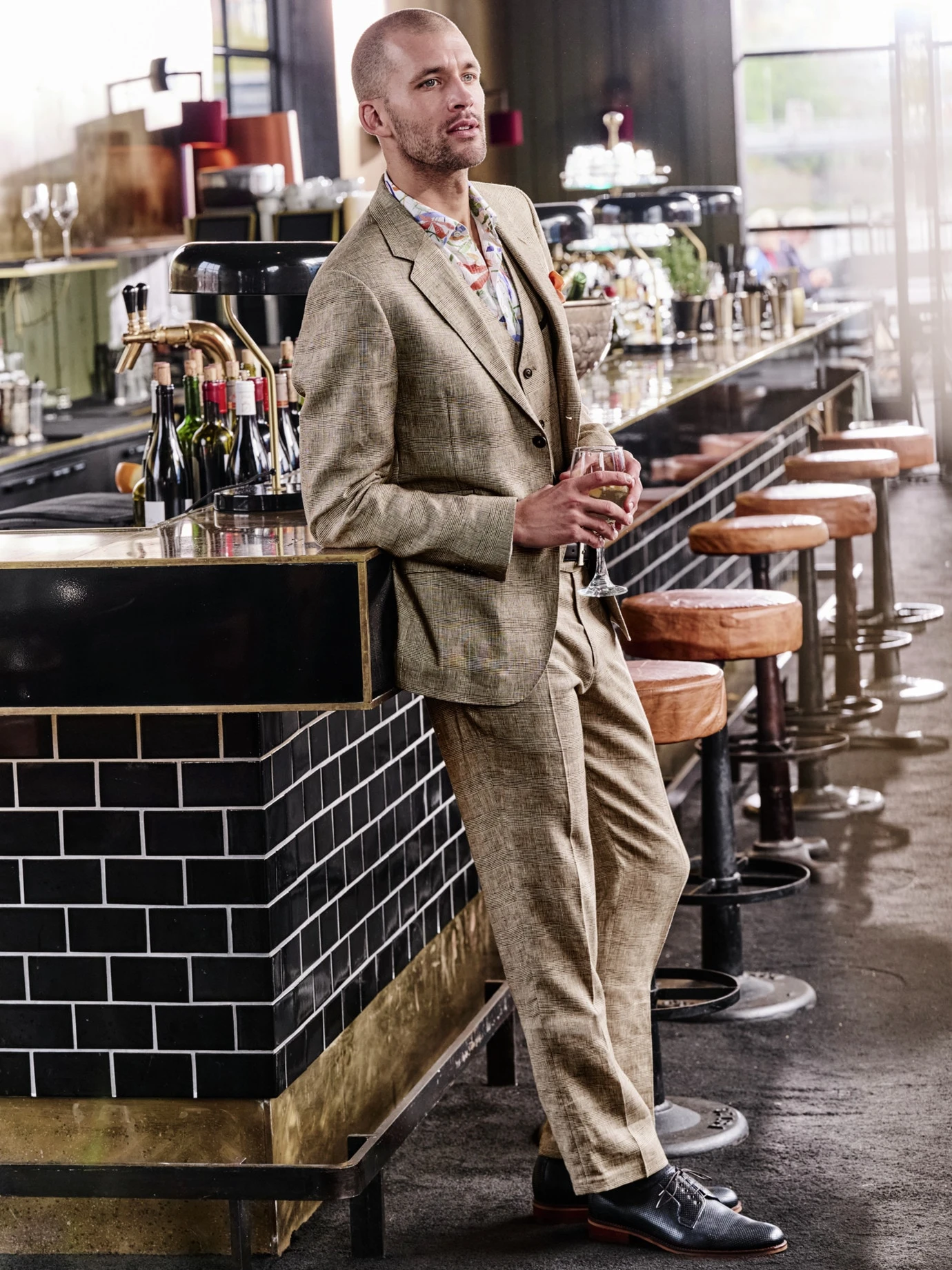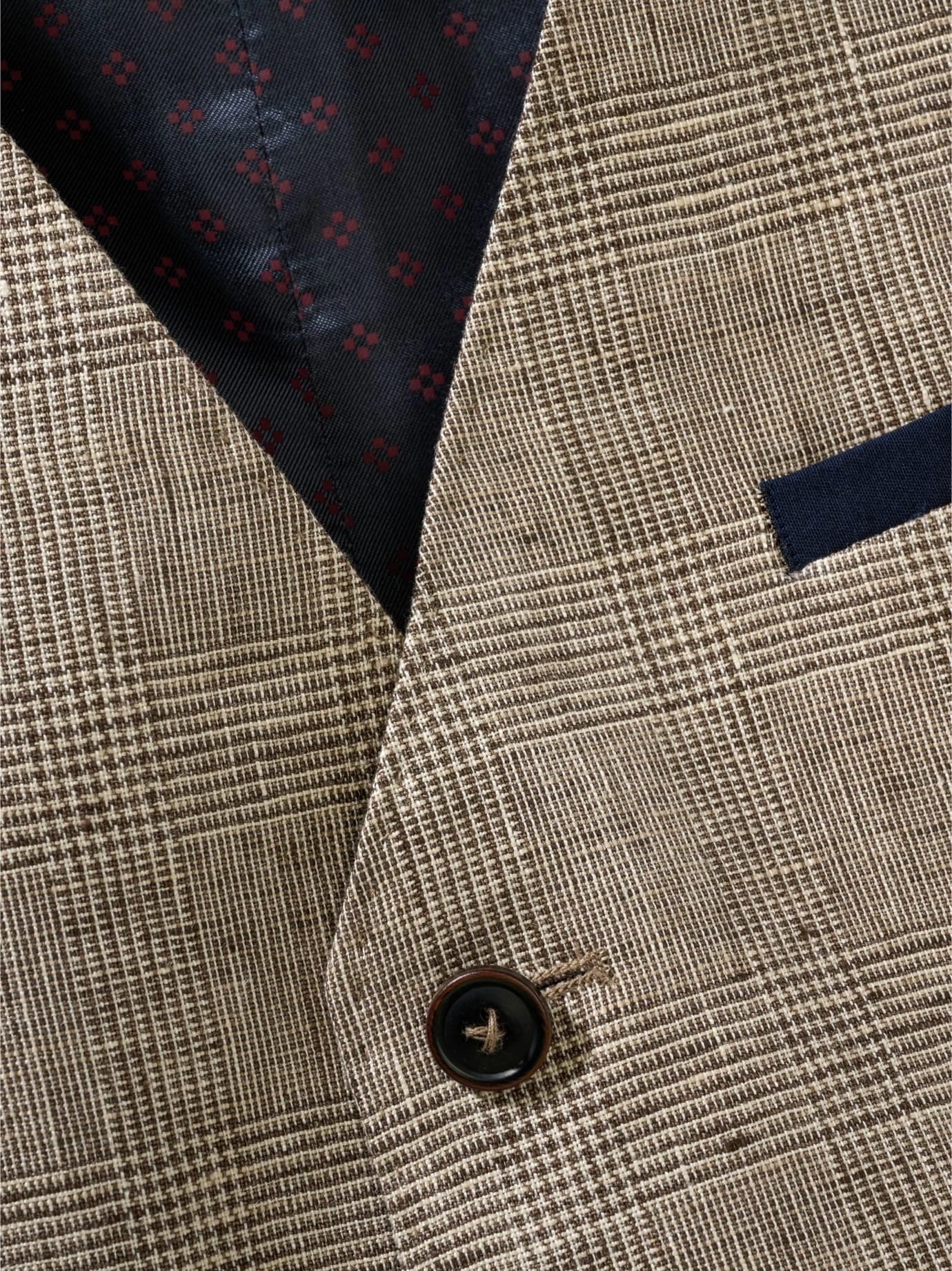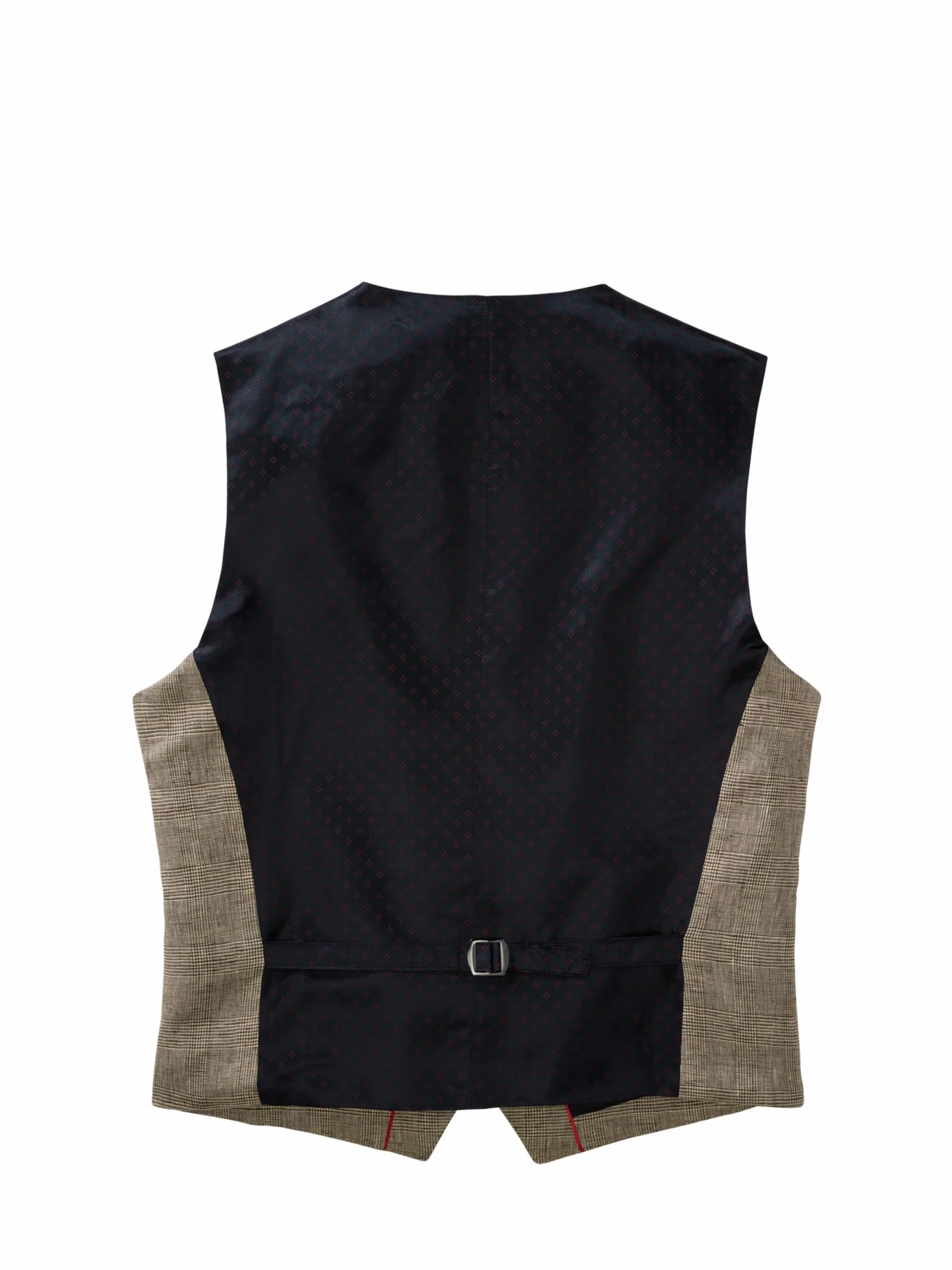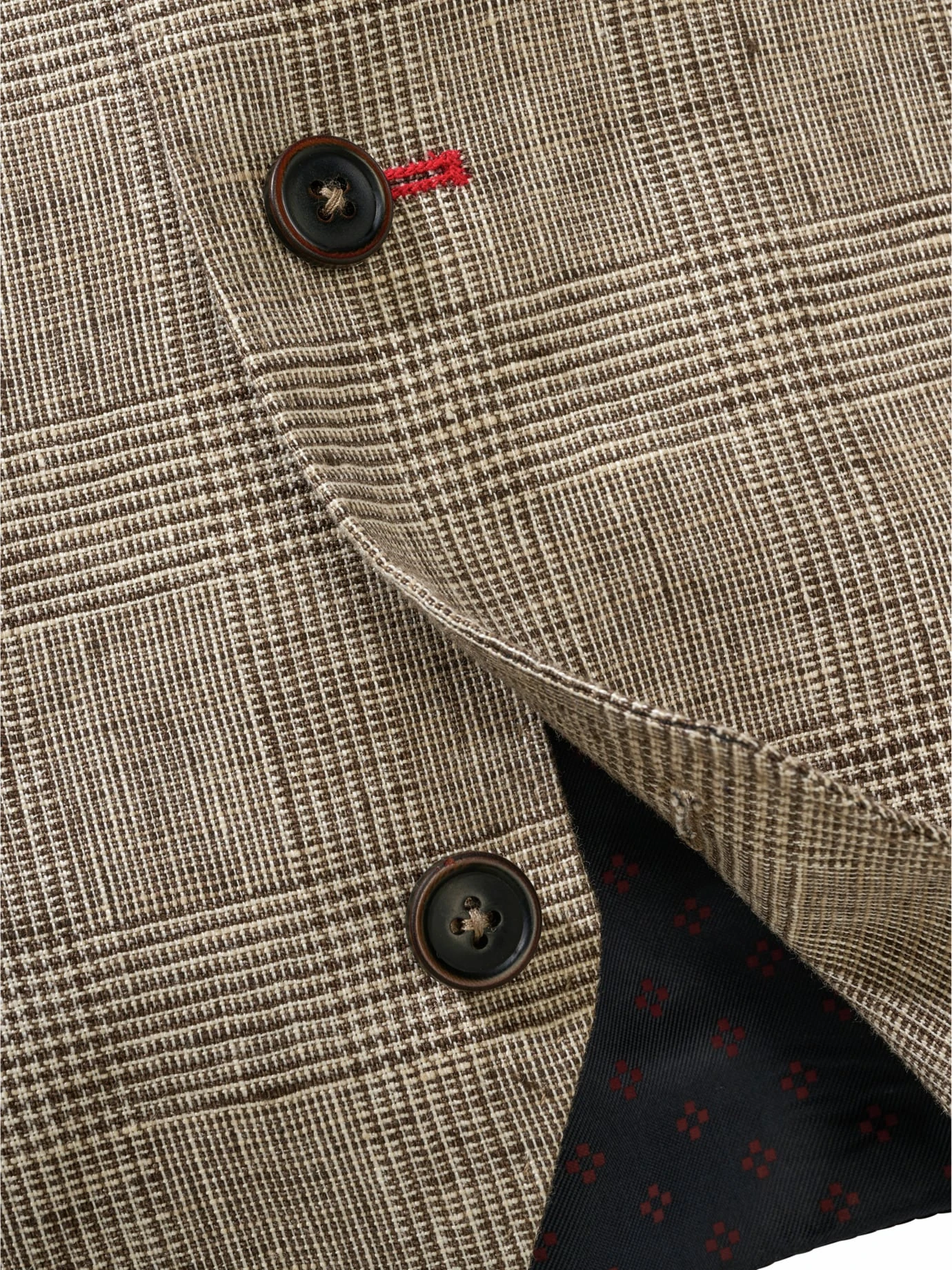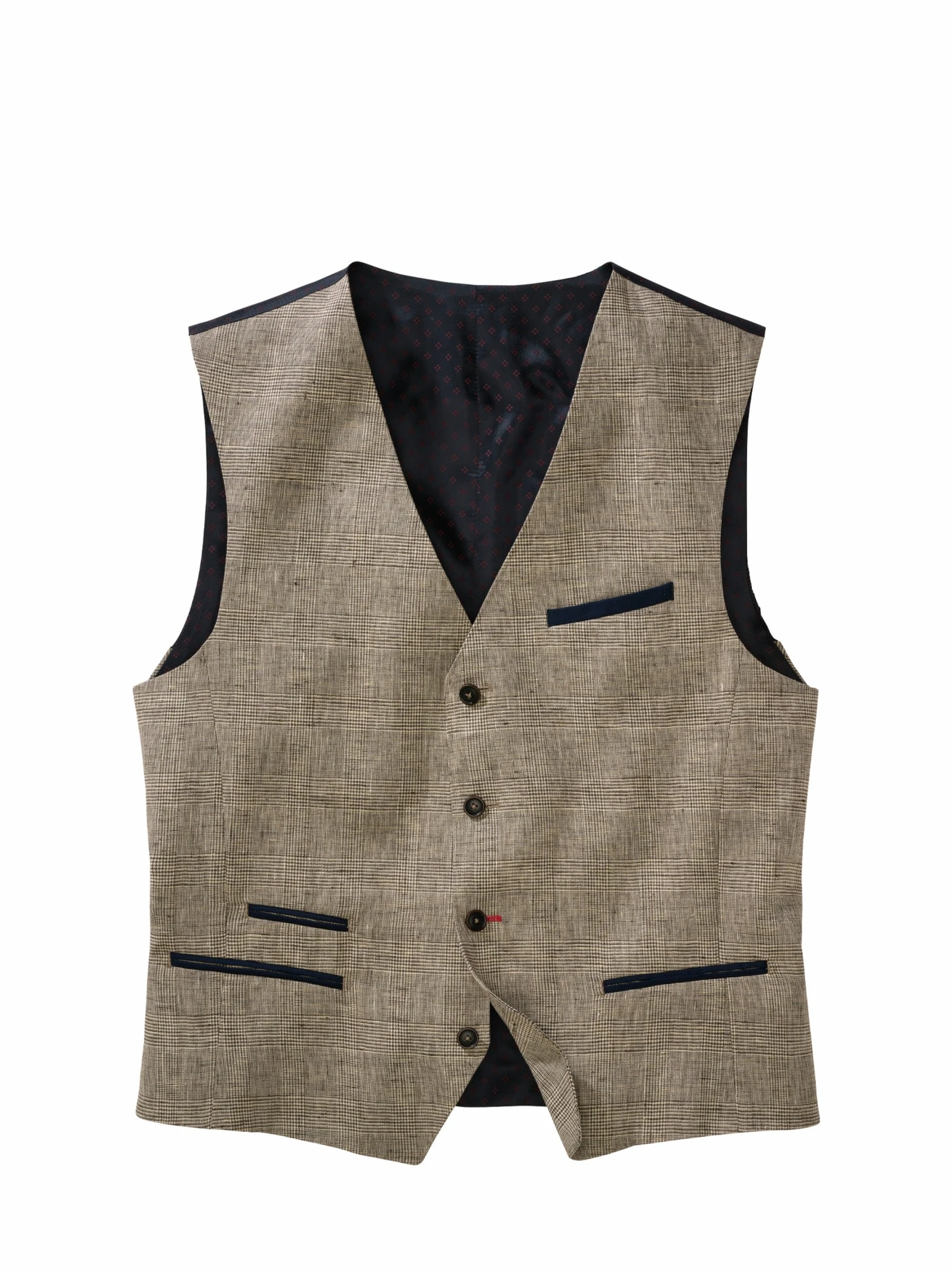 Die Relevanz des Stoffes steigt mit den Temperaturen: Bei dieser Glencheck-Weste ersetzt reines Leinen von Leomaster aus Italien die englische Wolle, wendet so Hitzekoller ab und erlaubt das Mittagsruhen im Schatten. Ihr subtiles Karo passt zu lauer Luft, längeren Abenden und wunderschönen Sommerfesten. Es knittert kaum merklich und lässt sich ebenso leger wie elegant tragen. Unverwechselbar mit dunkelblauen Akzenten wie Rückenstoff, abgesetzte Paspeln und Knöpfen. Schraubt im Duo zur stoffgleichen Hose (Nr. 24-6443) oder unter dem Sakko (Nr. 24-6441) die gesellschaftliche Wertschätzung nach oben, Mega-Strahlkraft im Dreiklang als Anzug.