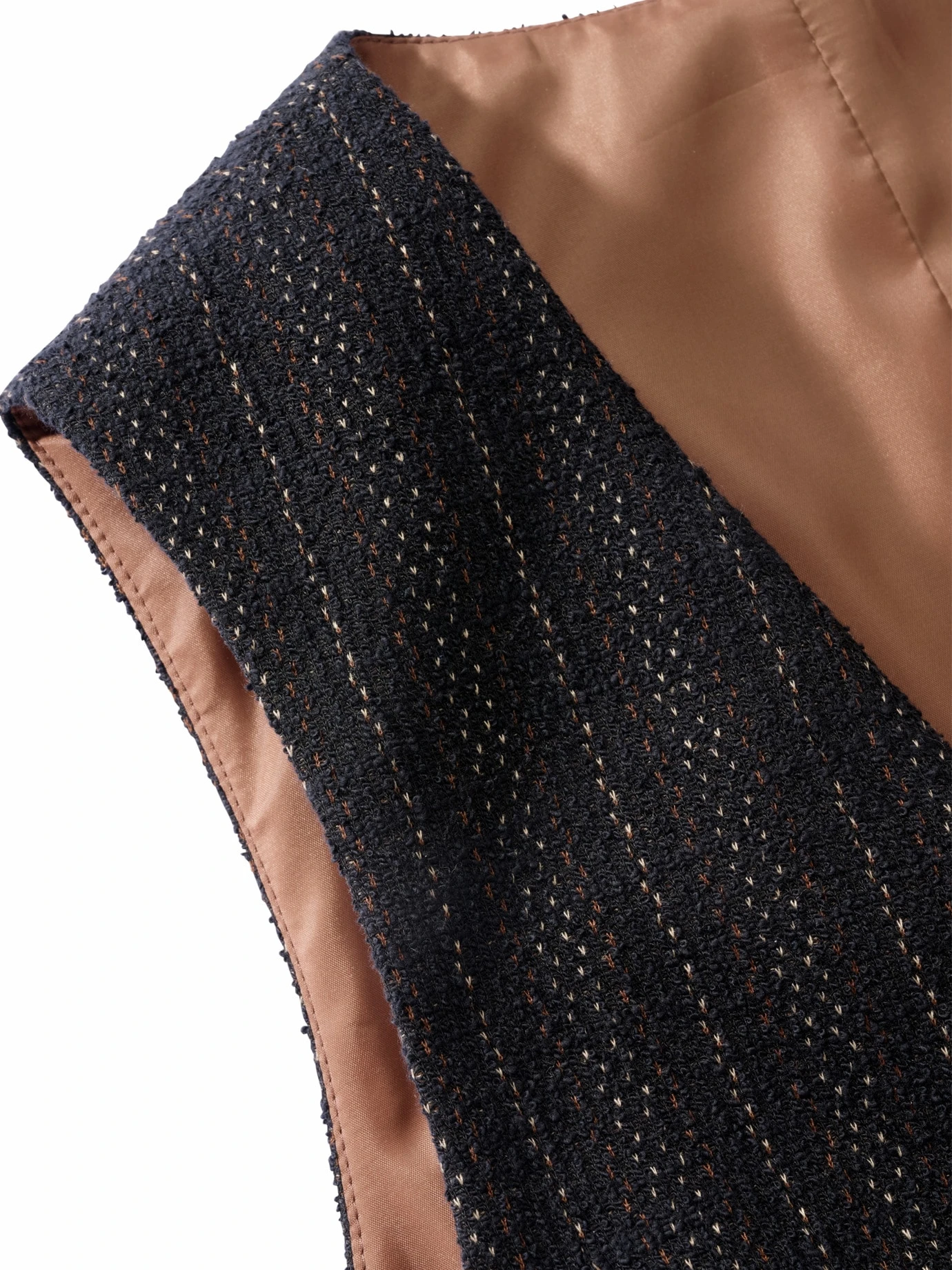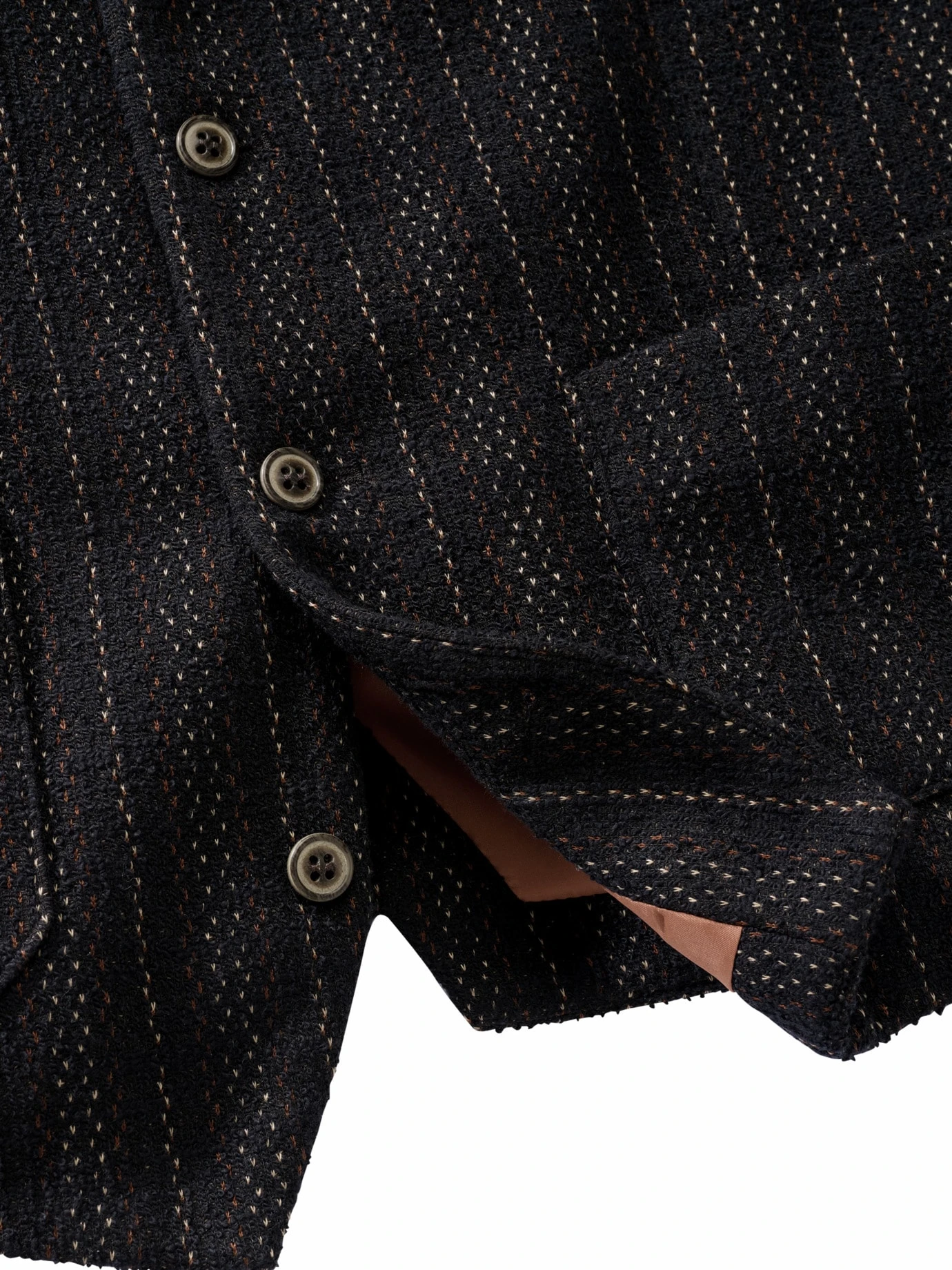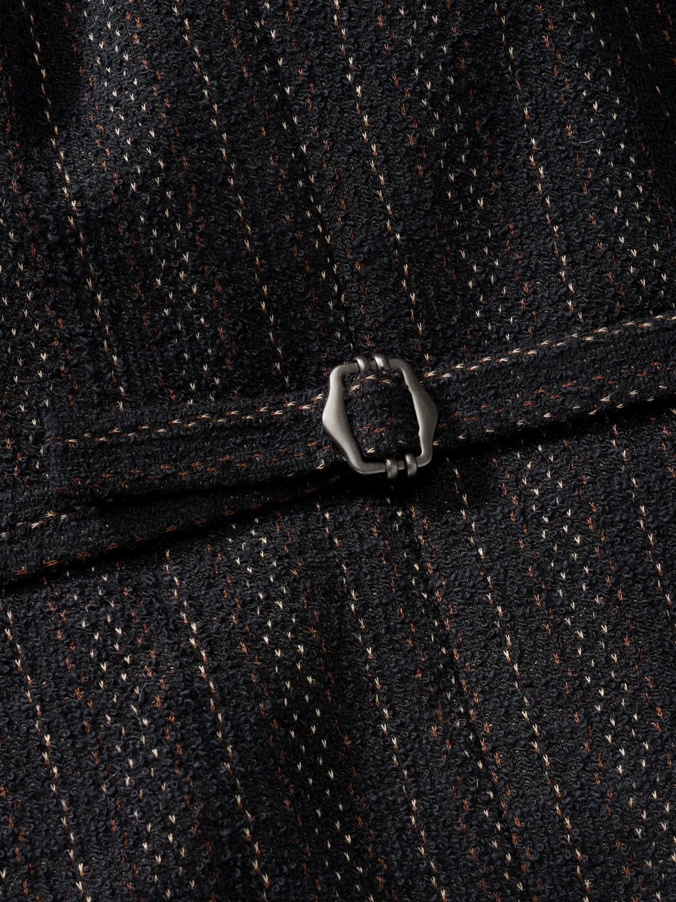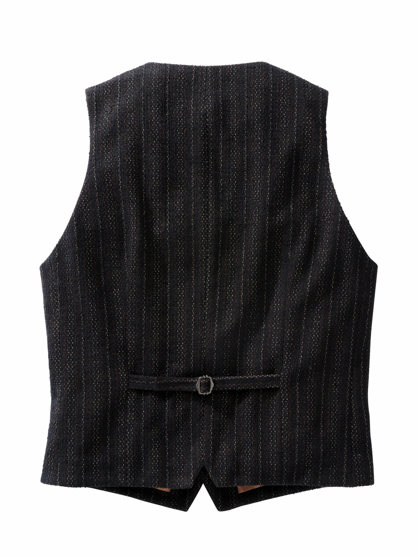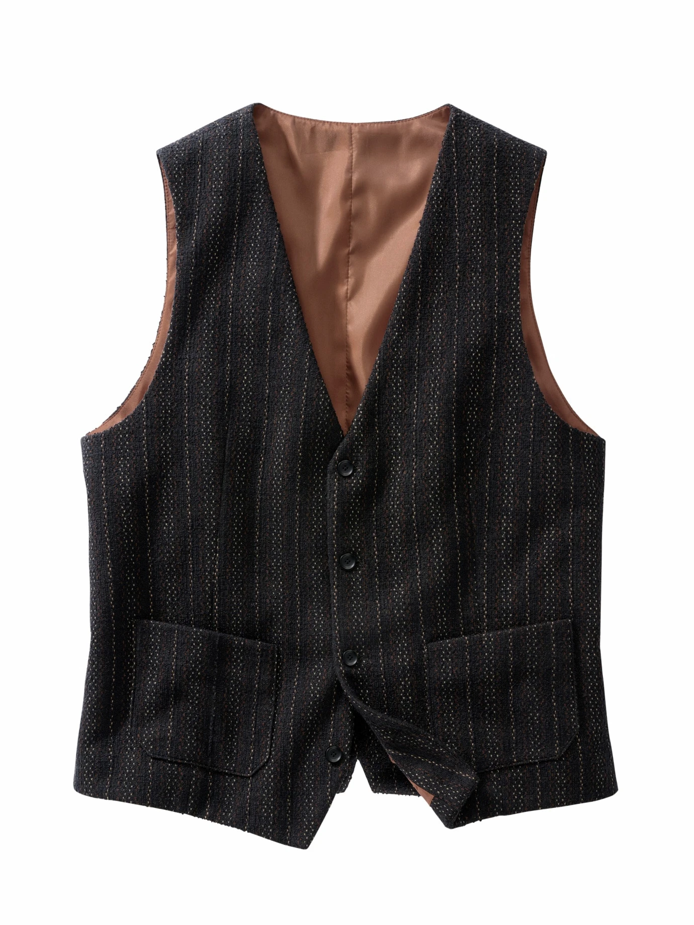 Noch immer eine Rarität. Eine Anzugweste mit vollwertigem Rücken ersetzt noch immer das Sakko. Diese ist gearbeitet aus einem Winter-Bouclé vom italienischen Weber Ciatti & Baroncelli. Als hätte das Spinnrad die Unregelmäßigkeit erzeugt, tatsächlich ist es manierlich genug gewebt, trägt Volumen und wärmt ebenfalls. Ihr erhabener Effekt potenziert sich zum gleichnamigen Sakko (Nr. 24-6780-5). Dazu genügt eine schlichte Chino, authentisch dann aber zum Henley-Shirt.