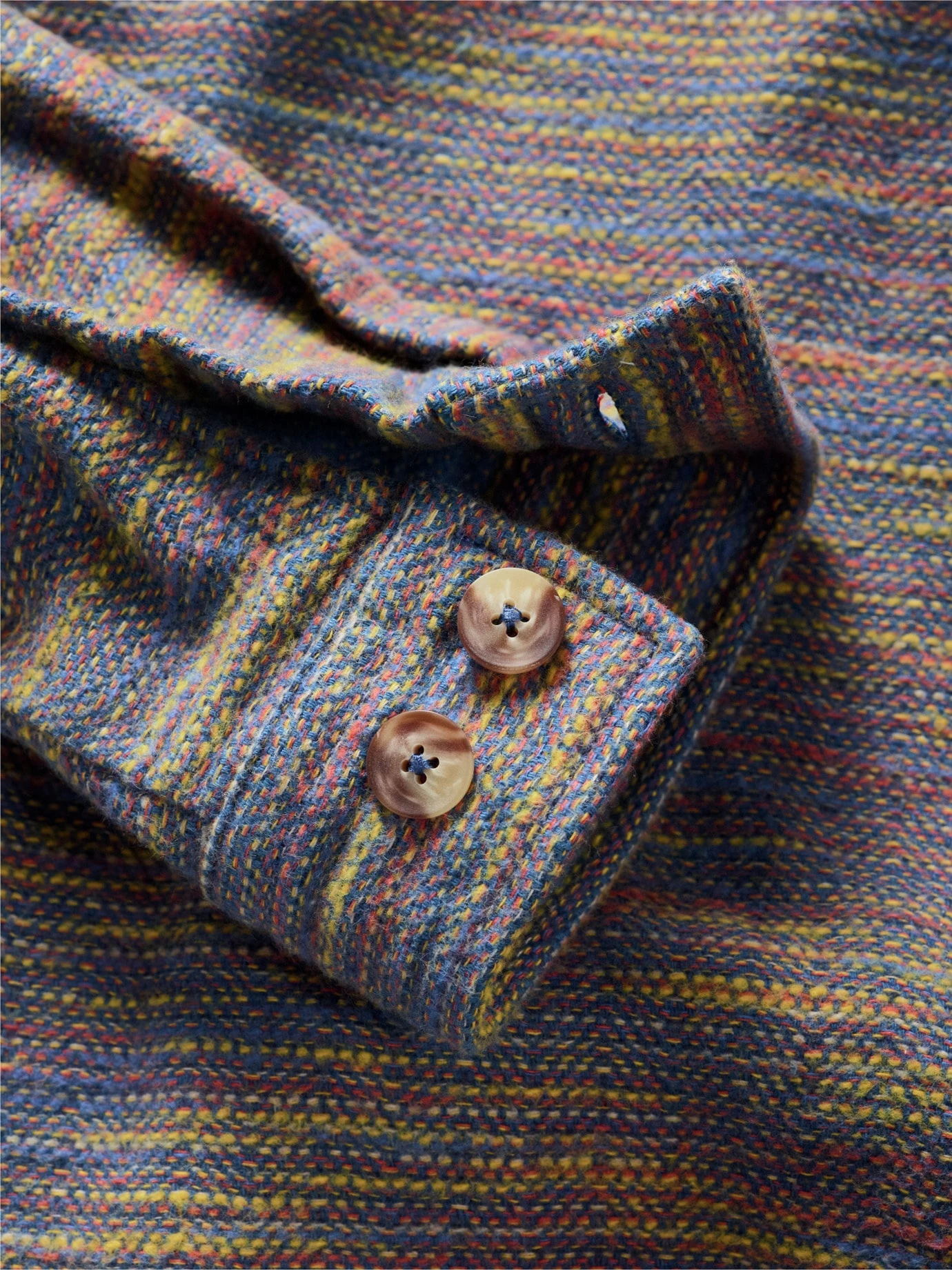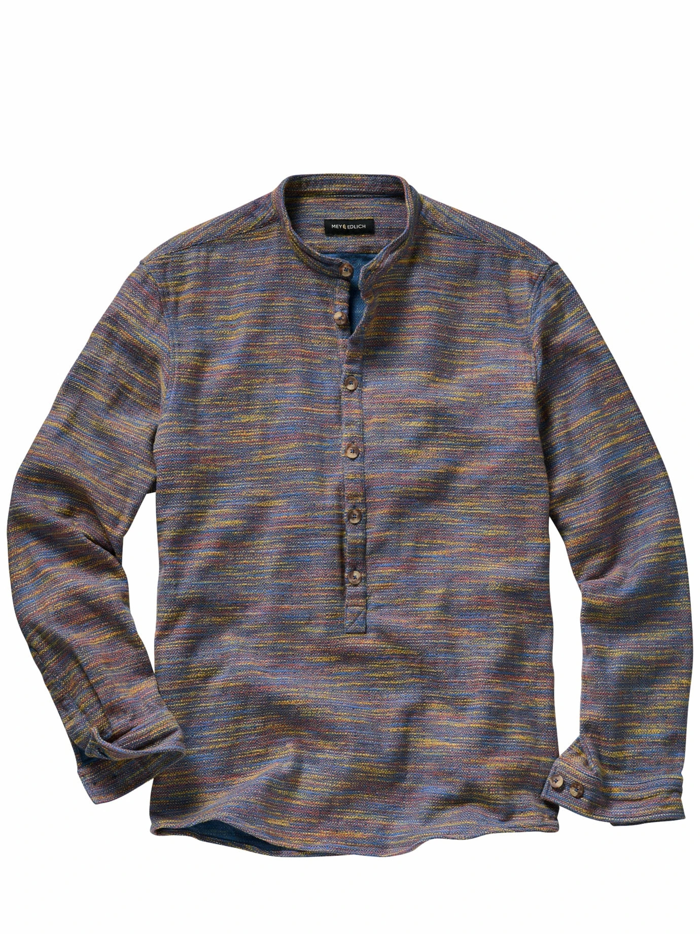 Wenn neues Charisma auf echtes Handwerk trifft. Angelehnt ist es an das einstige Arbeitshemd, mit festem Griff und typischem Stehkragen. Anders als die früheren Hemden, die stets unifarben waren, liegt die Spezialität in seiner unregelmäßigen Farbigkeit. Echte Handwerkskunst: Baumwoll-Flocken mit fühlbaren Dick-Dünn-Stellen werden unterschiedlich eingefärbt und zu einem recht dicken Garn versponnen. Eine Machart, die sich positiv aufs Tragegefühl auswirkt, da das Hemd sanft die Haut massiert statt festzukleben. Passt dazu am besten: die ersten drei Knöpfe der verlängerten Knopfleiste in Holzoptik offen lassen, ein Lächeln und eine stimmige Chino oder Jeans.