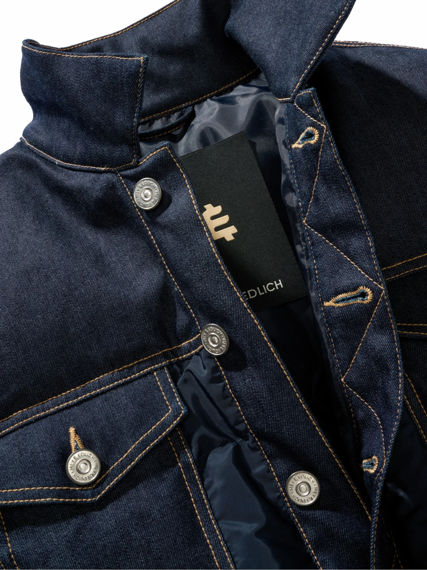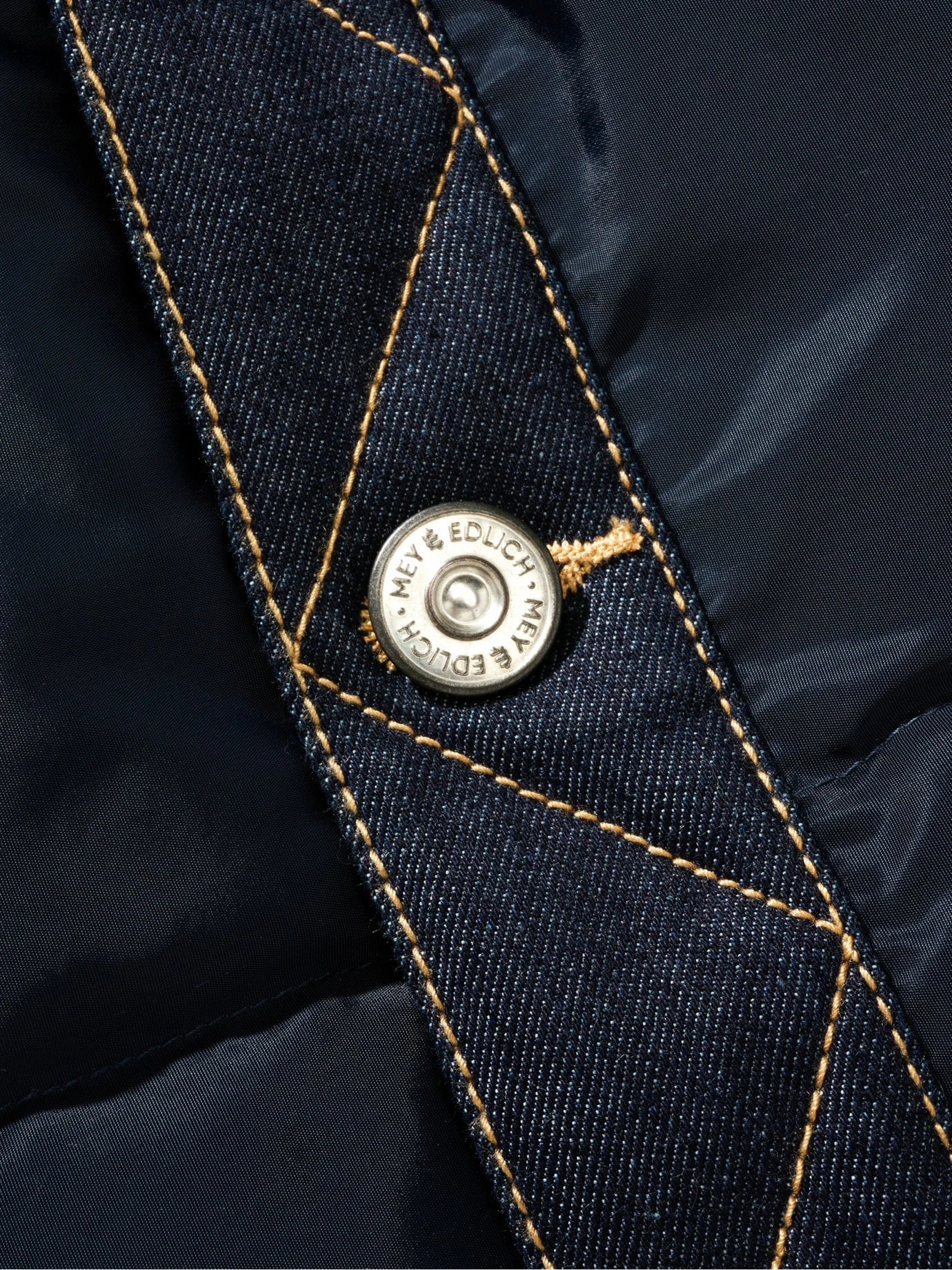 Endlich taugt die Jeansjacke an kälteren Morgen, ansonsten bleibt sie ganz in ihrem Element: gerade im Schnitt, hüftlang, mit Knopfleiste und Kragen sowie zwei Eingriffs- und Brusttaschen. Aus Mailand stammt der Entwurf, der die smarte Materialkombination neu erfasst und zu einem einzigartigen Crossover-Hybrid aus rauem Denim und modernem City-Look zusammenfügt – funktionell und wärmend wattiert für die kälteren Tage. Lässig zu Sweatshirt und T-Shirt, konsequent mit hellerer Jeans oder Cargo. Ob dann mit soliden Sneakern oder derben Boots, entscheiden Sie – oder das Wetter.