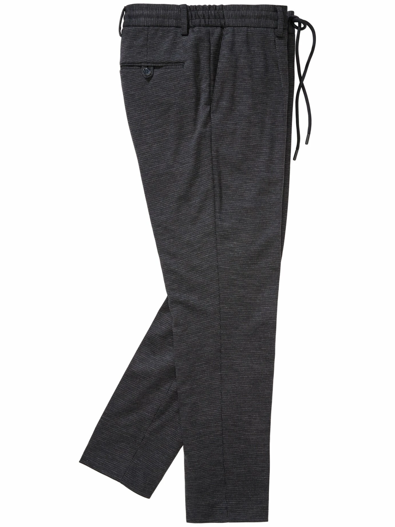 Konkurrenz fürs Chamäleon: die weiche Jerseyhose mit hohem, temperaturausgleichendem Wollanteil. Für eine Anzughose bietet sie dank ihrer flexiblen Wirk-Qualität einen ungewohnt hohen Tragekomfort, der Kordelzug leistet sein Übriges. Und weil sich ihre formellen und legeren Eigenschaften so perfekt die Waage halten, funktioniert sie im Job zum klassischen Hemd oder in der Freizeit zum lässigen Sweater. Praktisch: Geschäftsreisen oder Wochenend-Trips übersteht sie im Koffer nahezu knitterfrei. Zum kompletten Anzug wird sie mit passendem Sakko (Nr. 24-6742-3).
