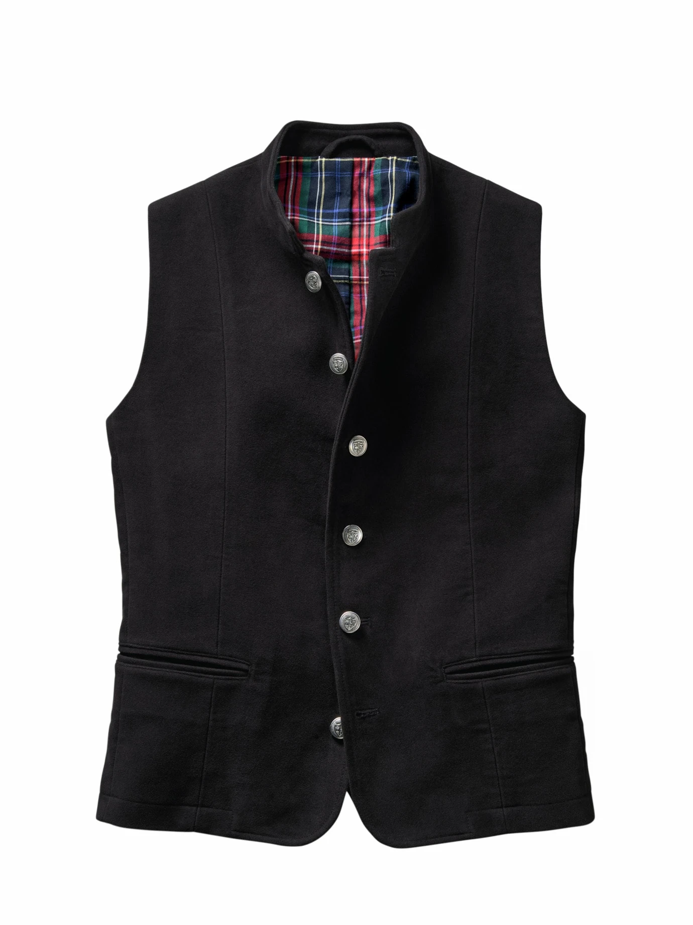 Mit dem Charme der Swinging Sixties. Endlich ist sie da, die passende Weste zum West End Jacket (Nr. 24-4139-3), jenem Sakko mit großer Liebhabergemeinde. Noch immer gemacht aus italienischem Baumwollstoff, der etwas angeraut ist, allerdings etwas leichter und elastischer ist, sodass Sie sich in der Weste zu jeder Musikrichtung locker bewegen könnten. Die durchgängige Front mit dem kurzen Stehkragen, der zum Revers umgeschlagen werden kann, die metallischen Knöpfe und das britisch karierte Futter schlagen die Assoziation ins Zentrum Londons.