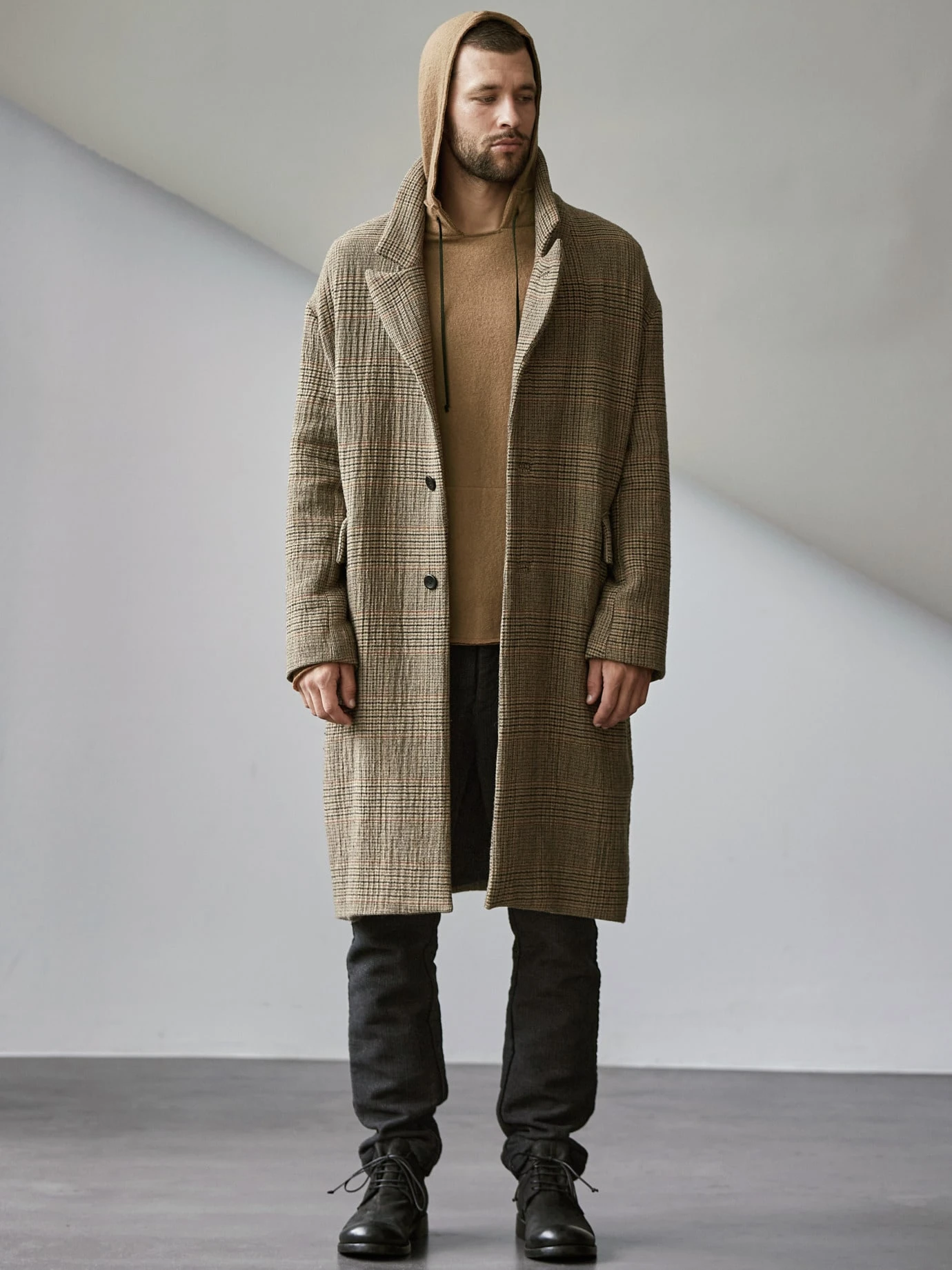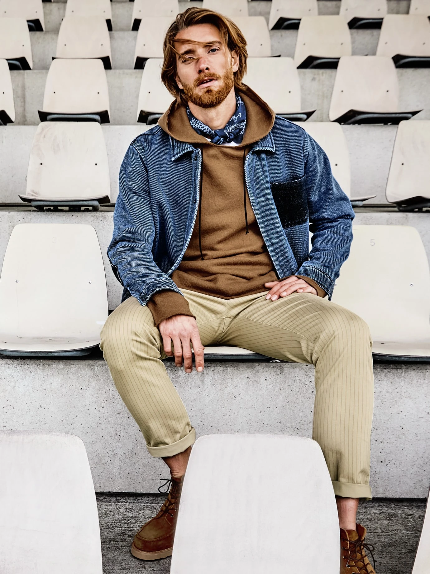 Ein Pullover der drei großen „W“: winddicht, wasserdicht, wärmend. Dafür wird der Pullover unter viel, sehr viel Hitze gewalkt. So wurden Stoffe schon vor etlichen Jahren wetterfest gemacht. Dadurch ist auch der Look viel derber als der eines Sweathoodies – fest und ruppig und langlebig. Authentisches Design von hannes roether, mit geradem Schnitt, offenen Säumen und einem Lederband, das die Kapuze fixiert. Getragen im Winter zu Raw Denim oder zu zerschlissener Jeans.