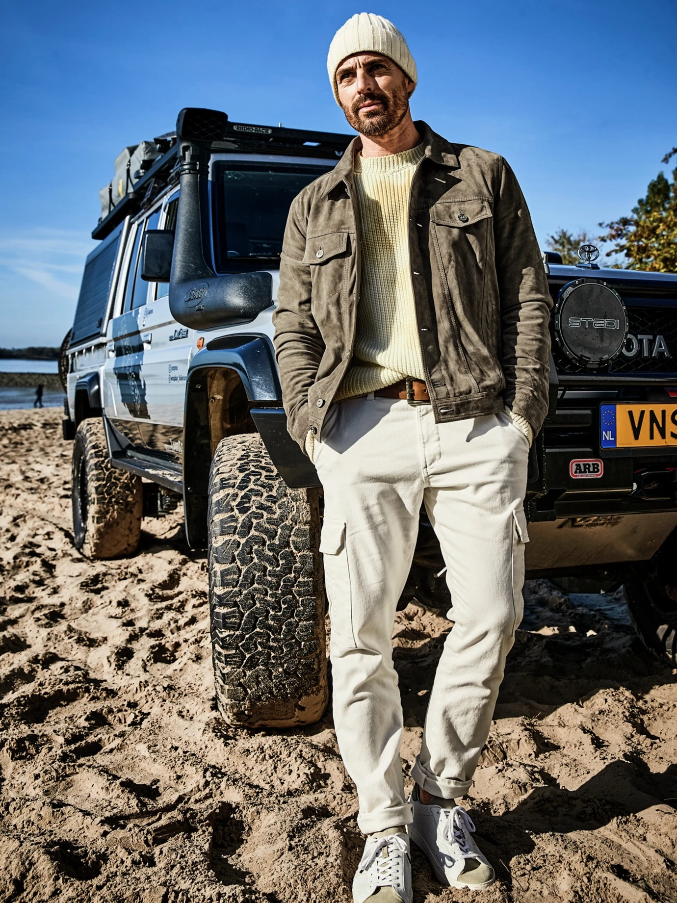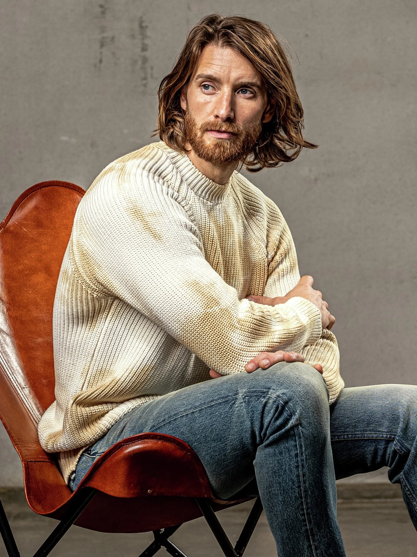 Der will nichts aufwirbeln. Was aussieht, als zöge sich leichter Wüstenstaub über den Pullover, ist tatsächlich eine Raffinesse von unserem italienischen Stricker. Dafür wird das Garn unregelmäßig und für die Ewigkeit bedruckt. Zusätzlich ziemlich grob und nahezu sturmfest in 5 Gauge gestrickt (ein herkömmlicher Pullover ist in knapp 12 Gauge gestrickt) bringt er zwei stattliche Pfund auf die Waage.